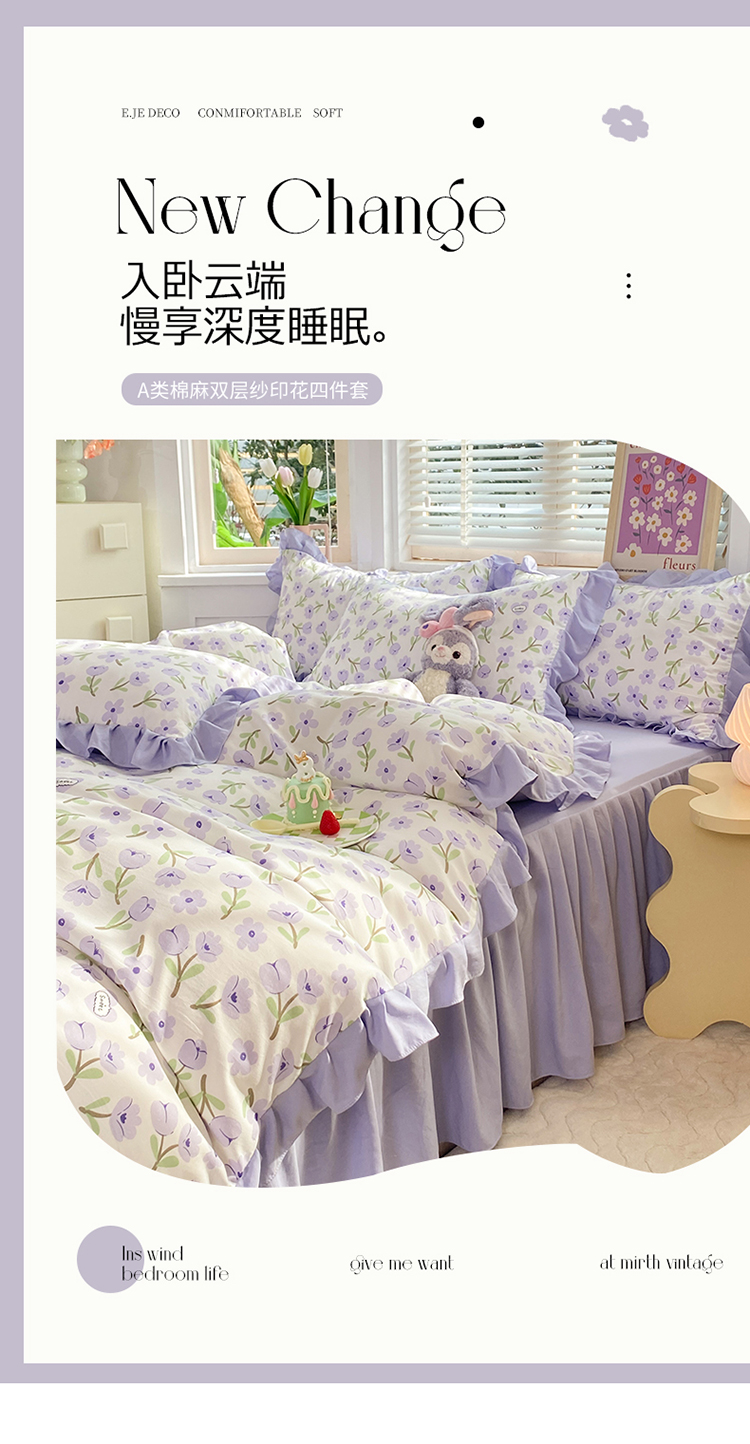 当前位置: 91家纺网 > 商品网购 > 床品套件 > 四件套 > 棉麻四件套 > 梦之岛 2023新款棉麻水洗双层纱床裙四件套 初春
