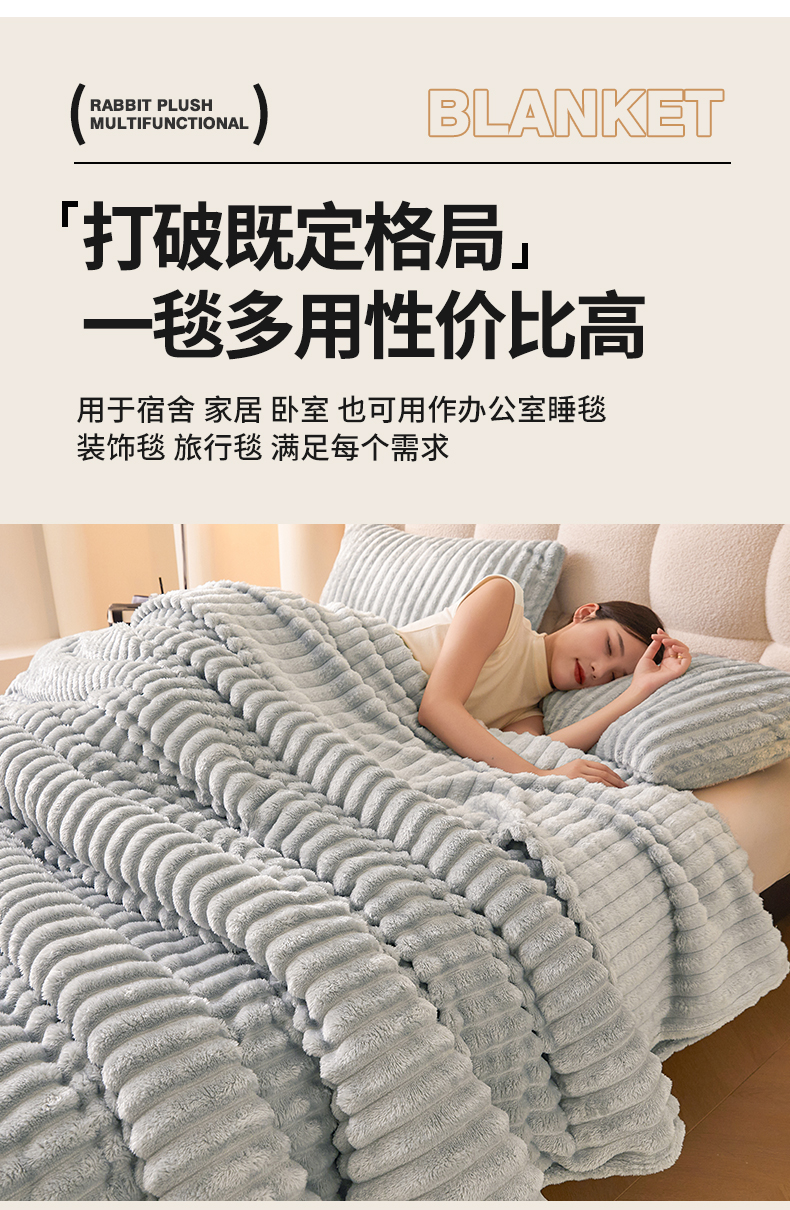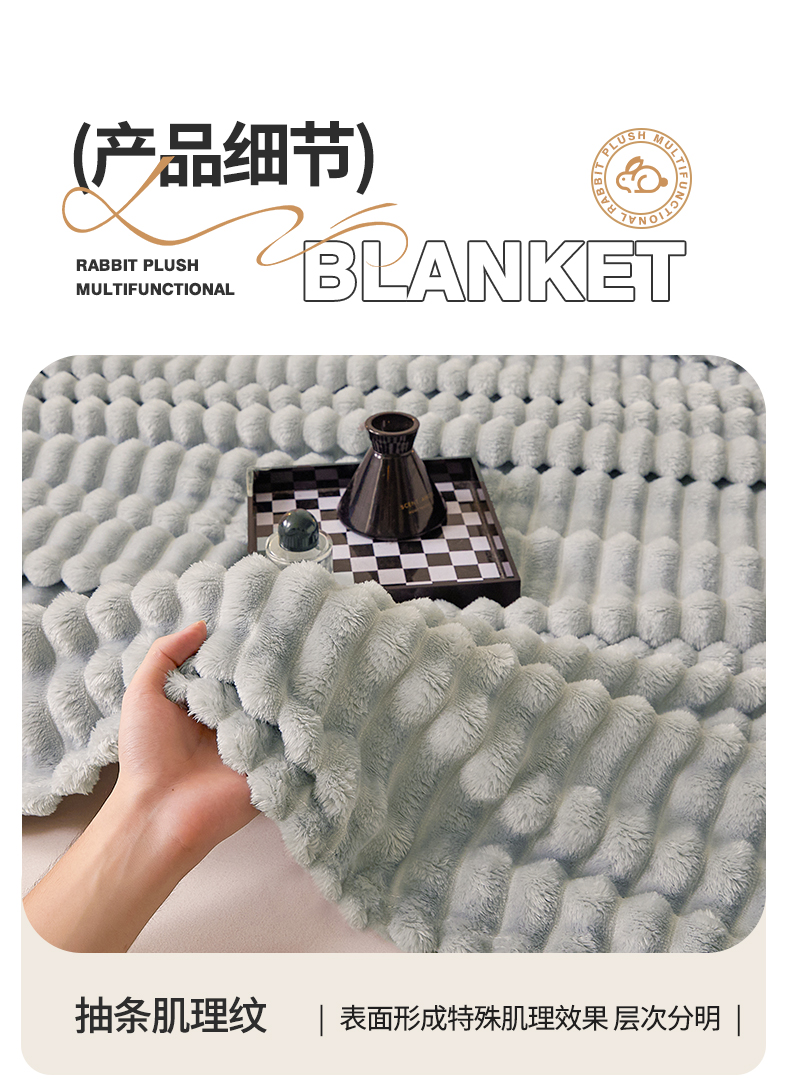 梵心家纺 跨境兔毛绒抽条毛毯高克重法兰绒毛毯跨境外贸直播 梦幻浅灰