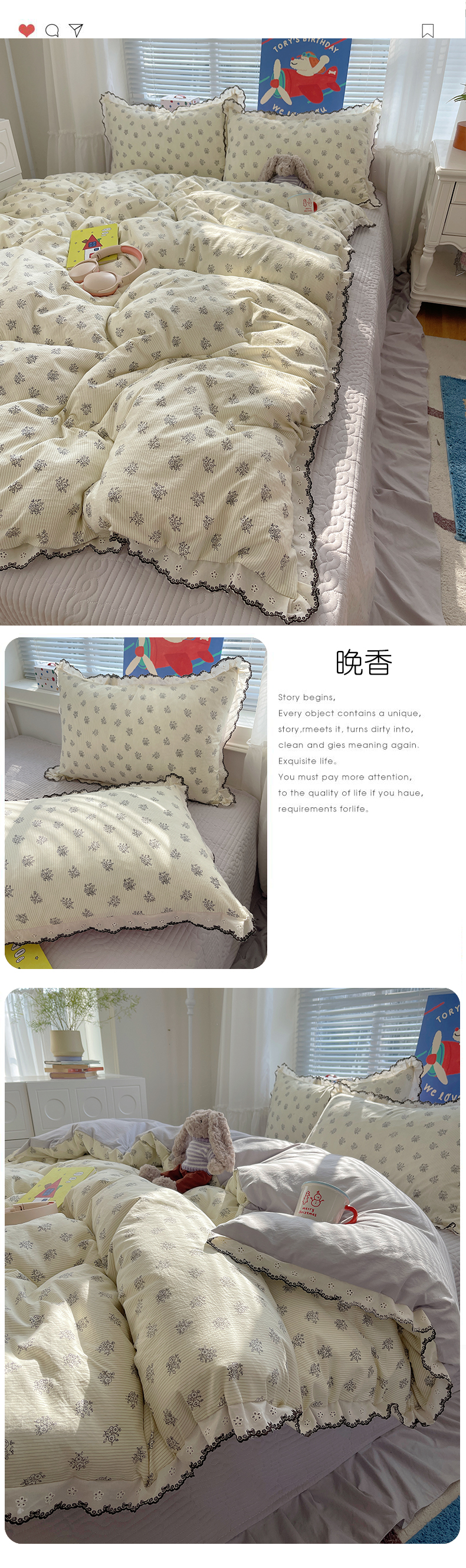 当前位置: 91家纺网 > 商品网购 > 床品套件 > 四件套 > 其它四件套 > 花漾家居 2026小红书推荐款小清新刺绣花边款床单床盖款四件套新款 晚香