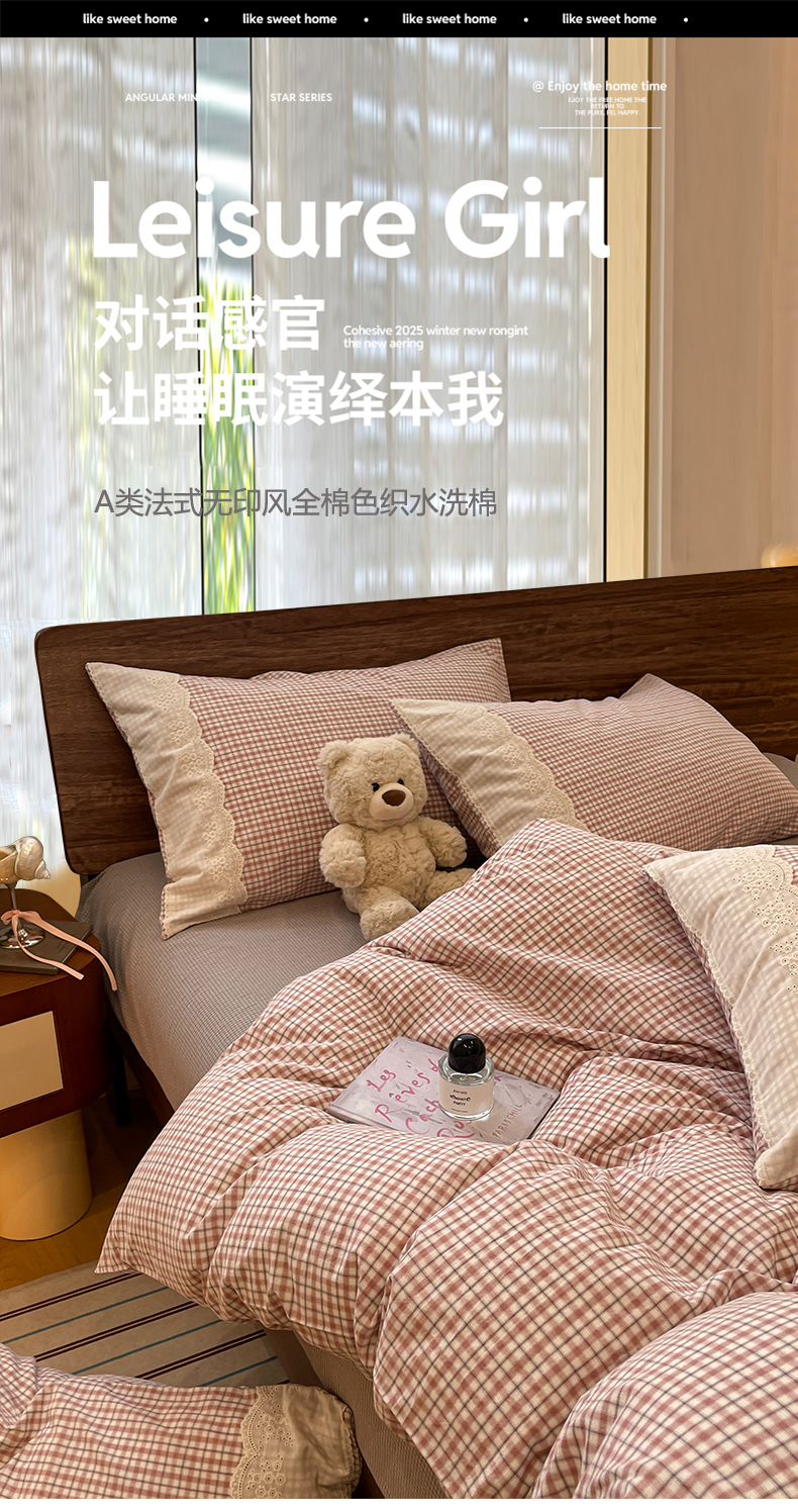 (总)花漾家居 2026新款全棉色织水洗棉复古花边无印格条被套三件套四件套