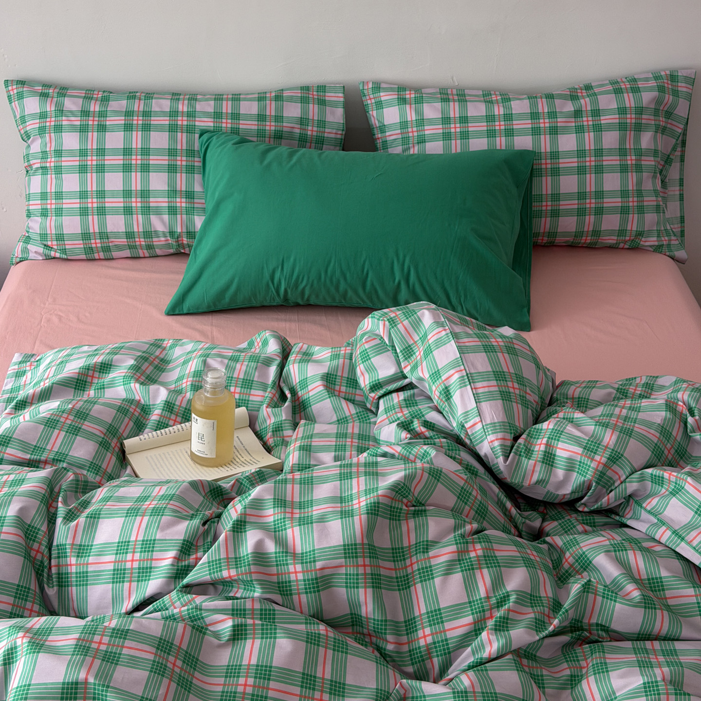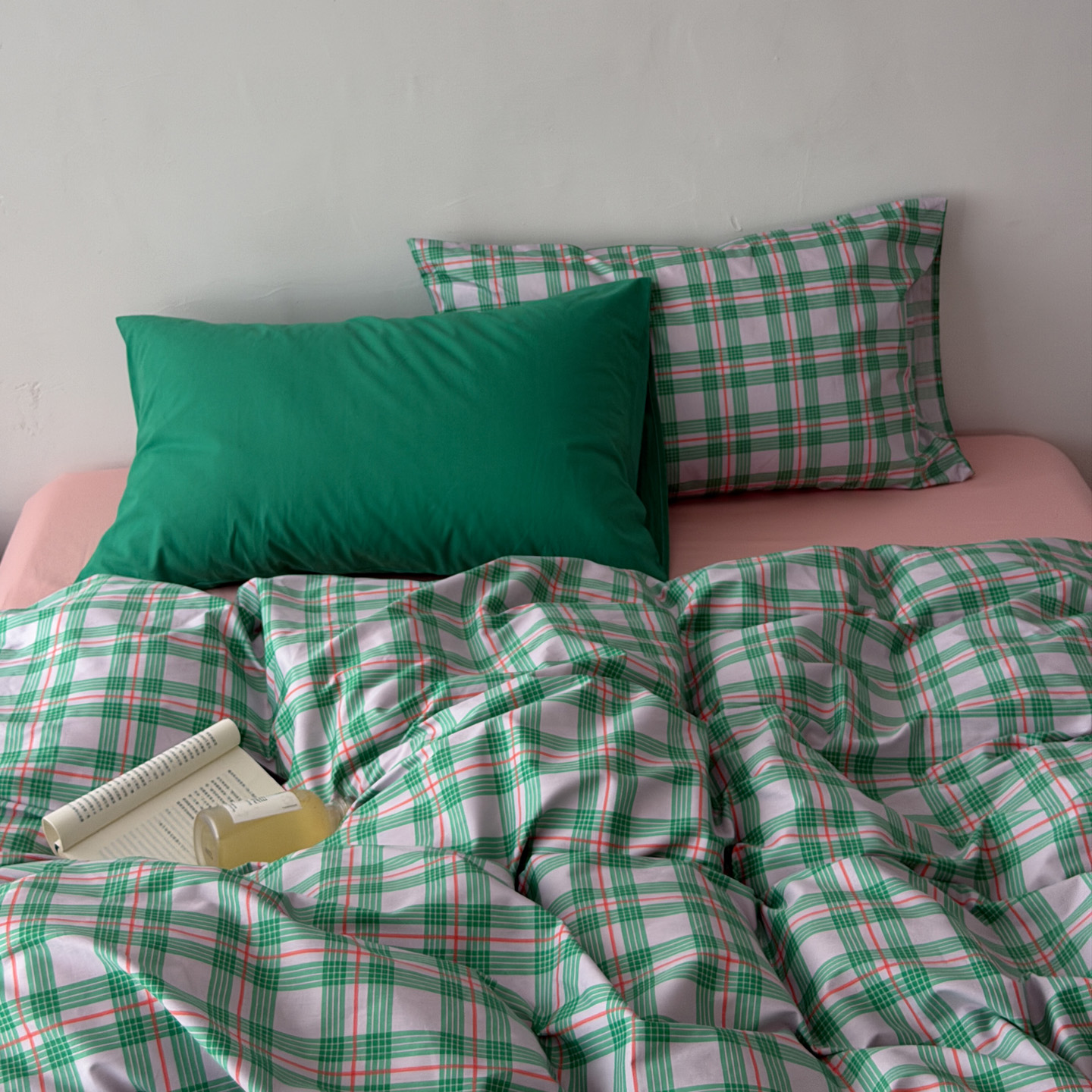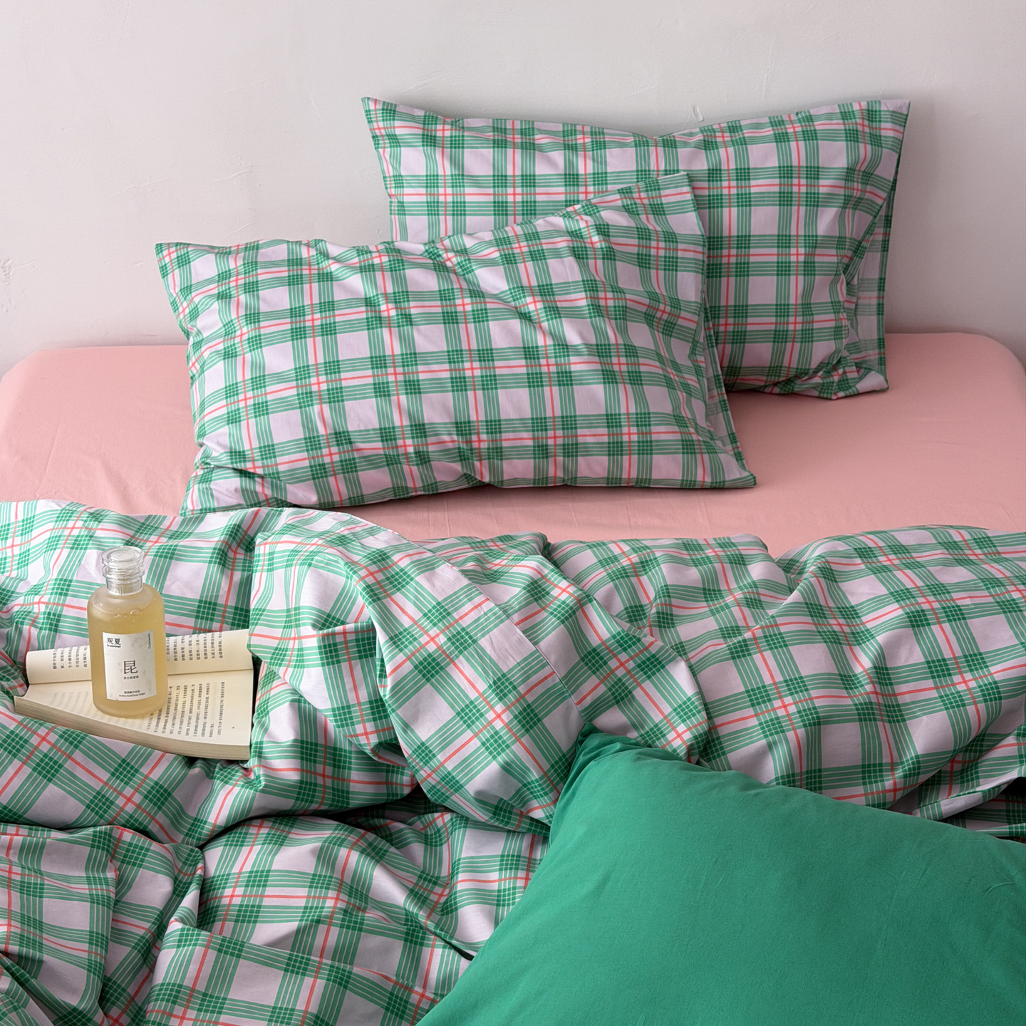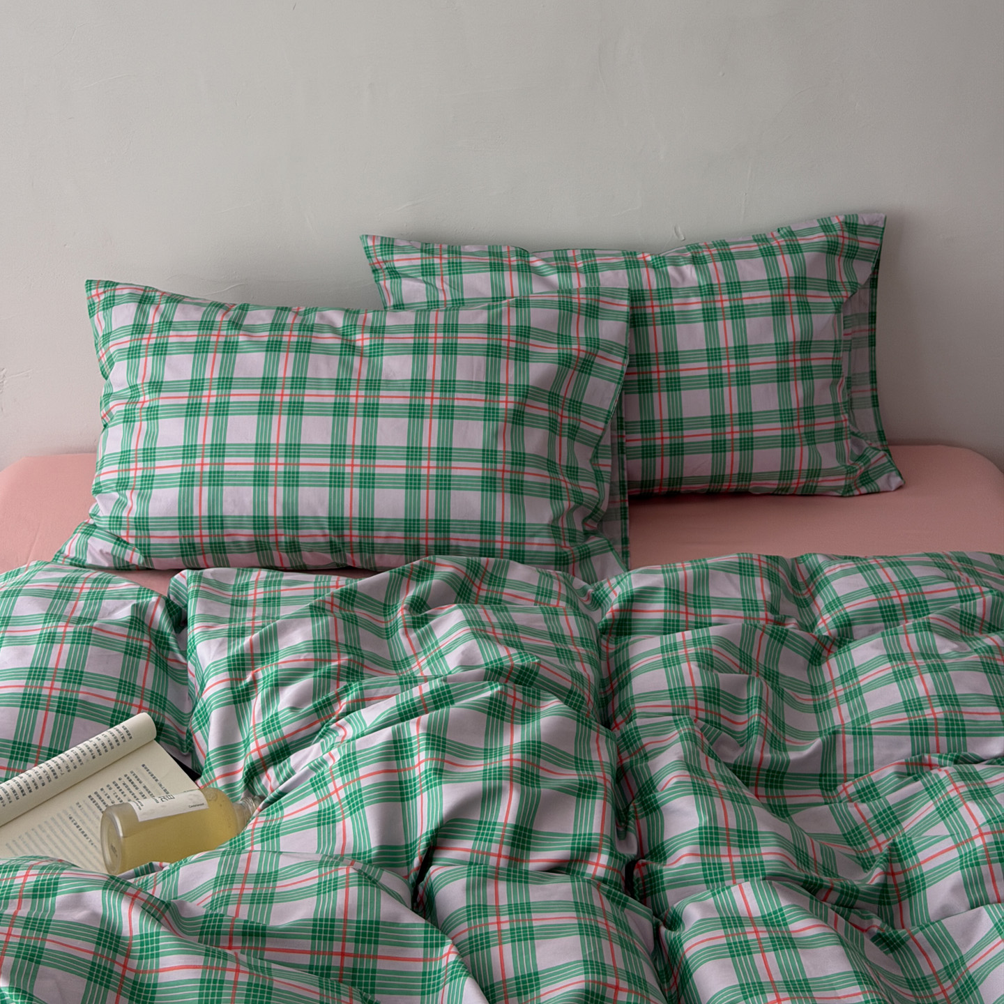 (总)艾沁家纺 2026新款13372全棉数码印花小清新格子四件套-蜜桃青柠