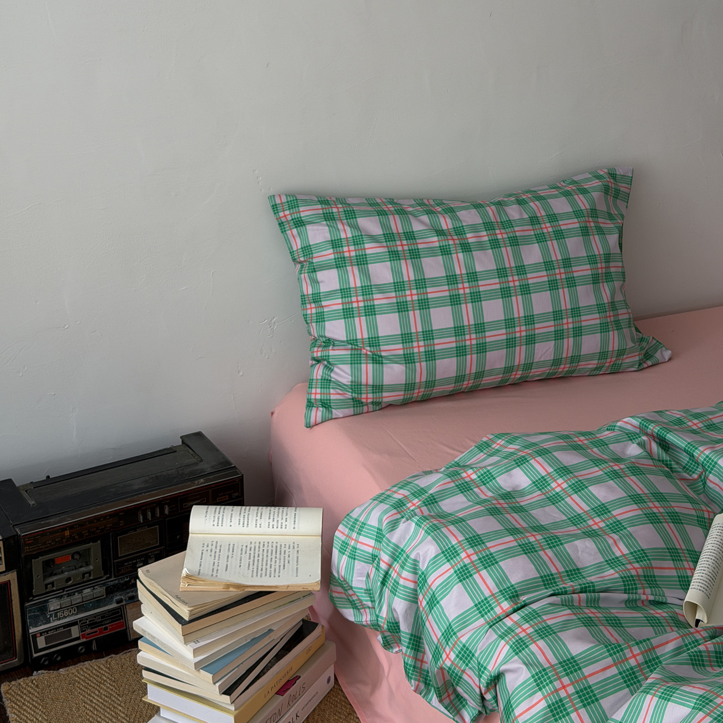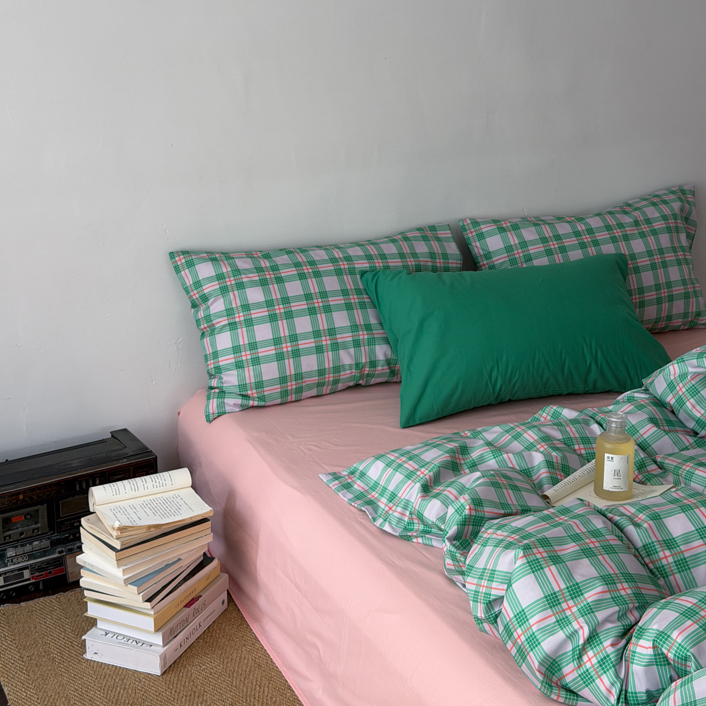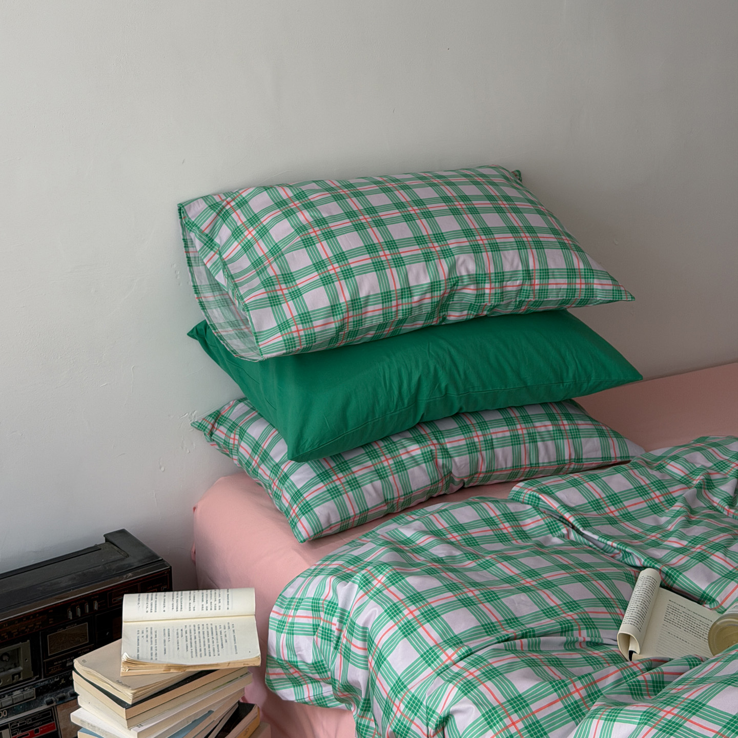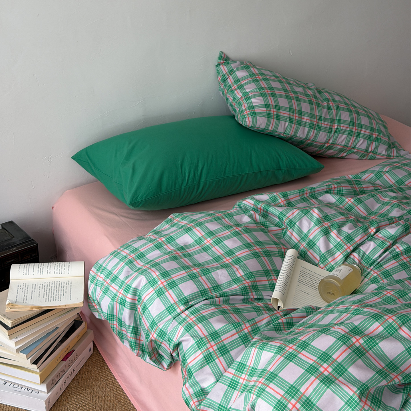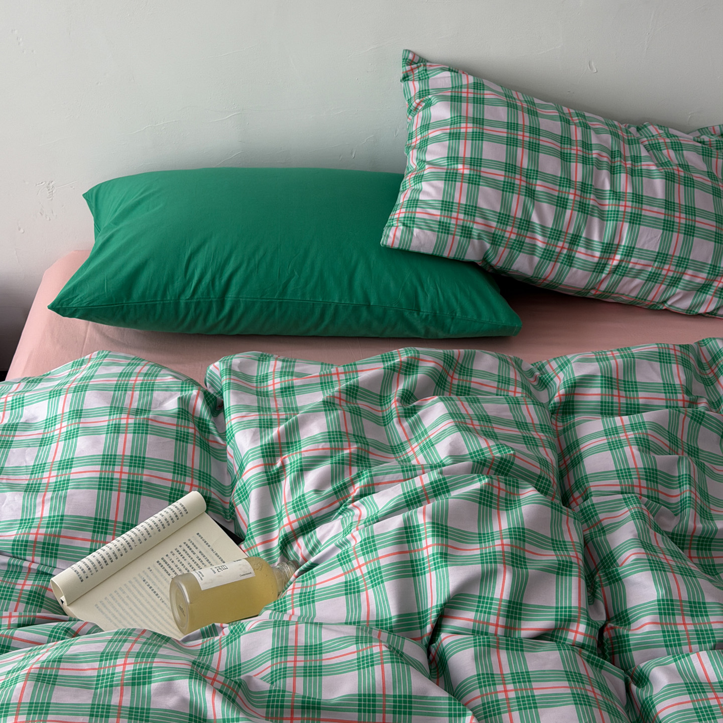 (总)艾沁家纺 2026新款13372全棉数码印花小清新格子四件套-蜜桃青柠