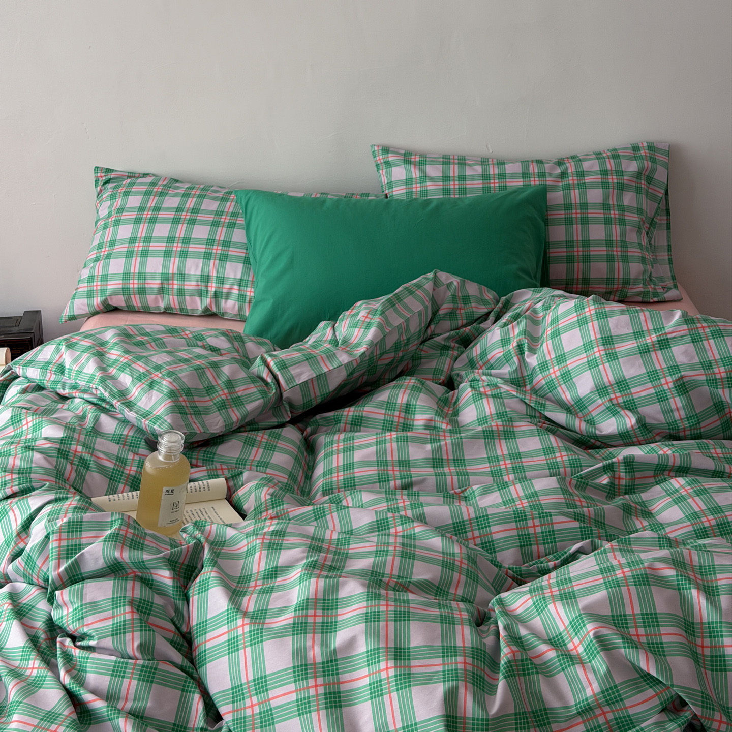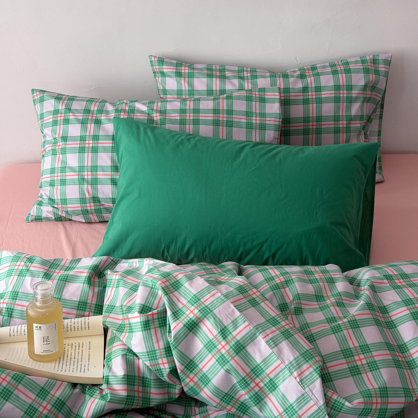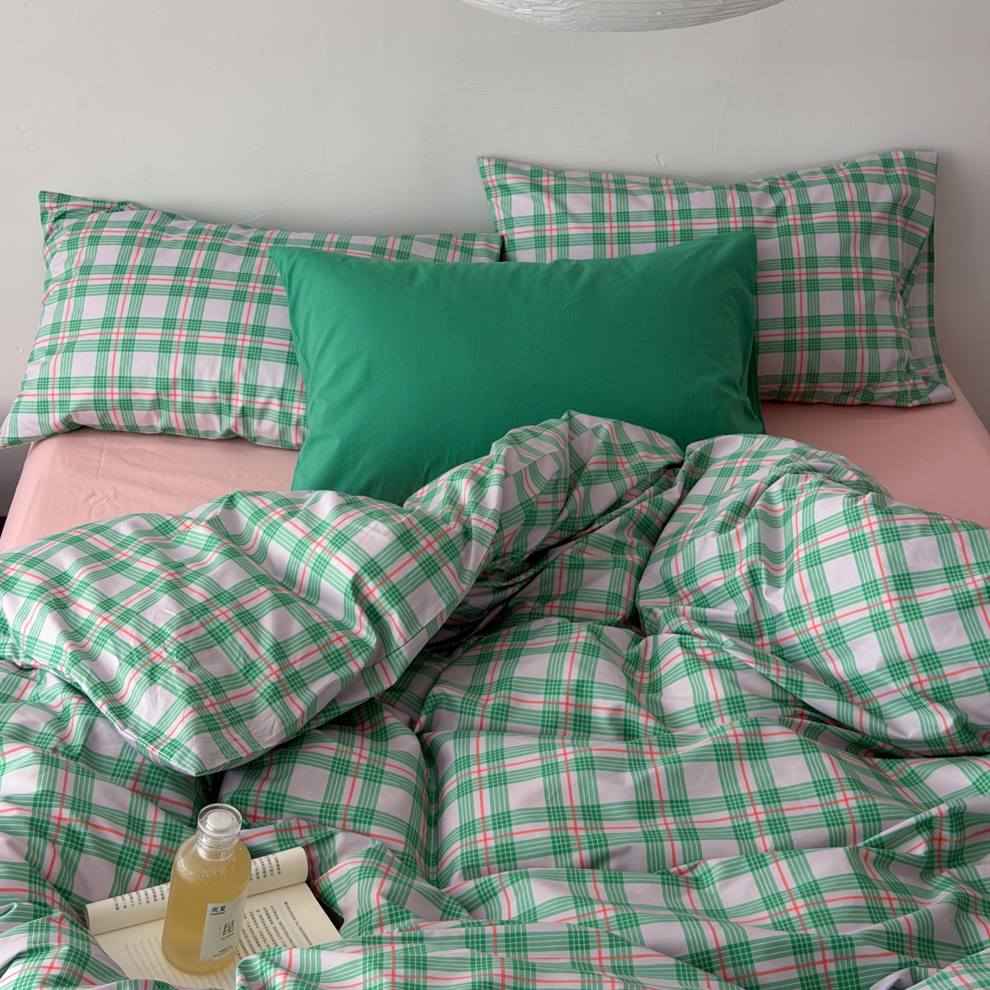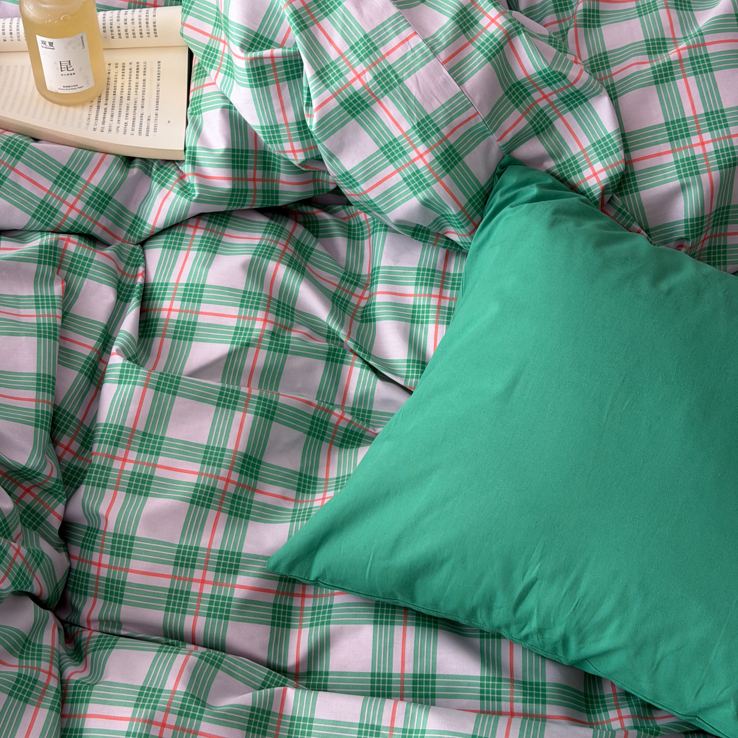 商品名称:(总)艾沁家纺 2026新款13372全棉数码印花小清新格子四件套-蜜桃青柠