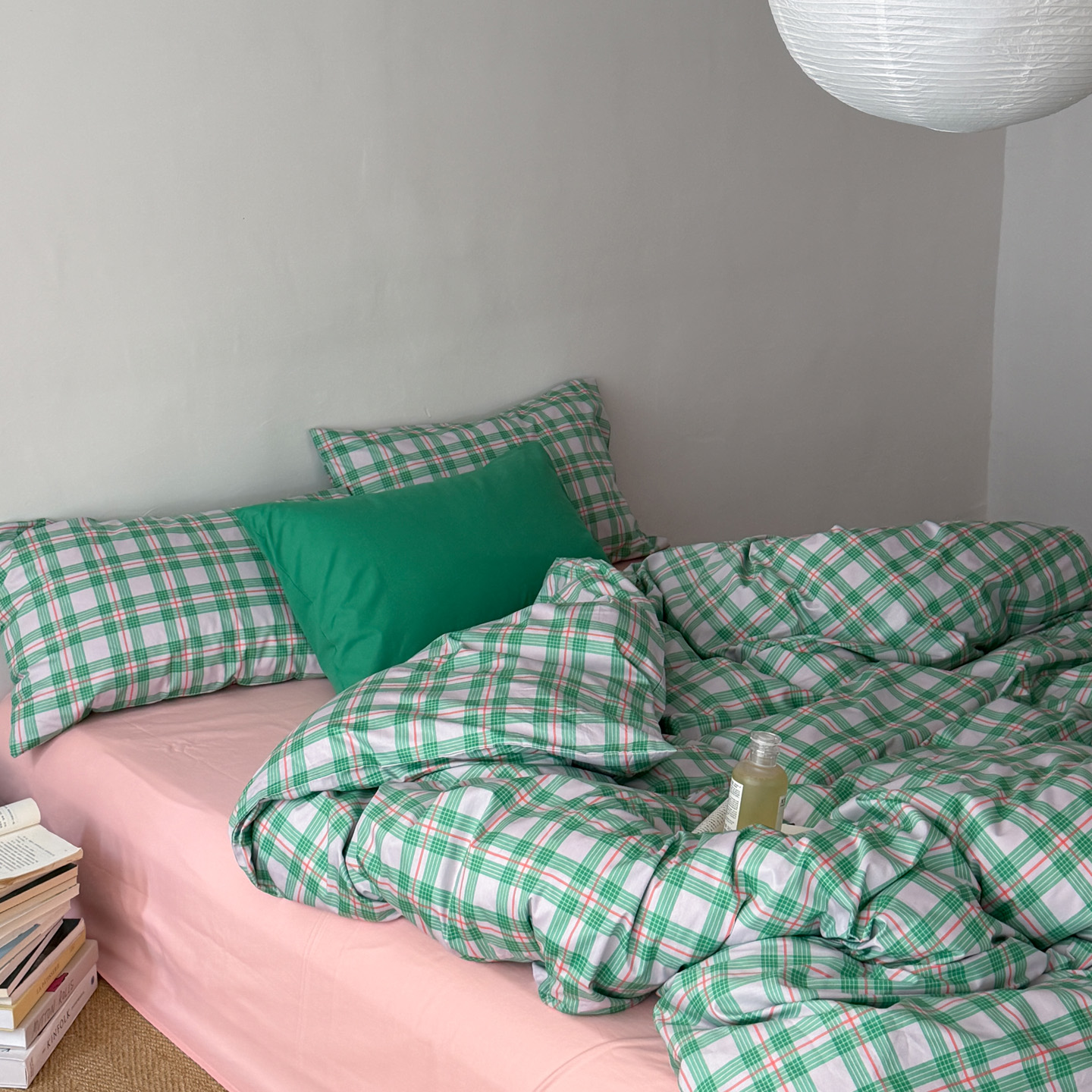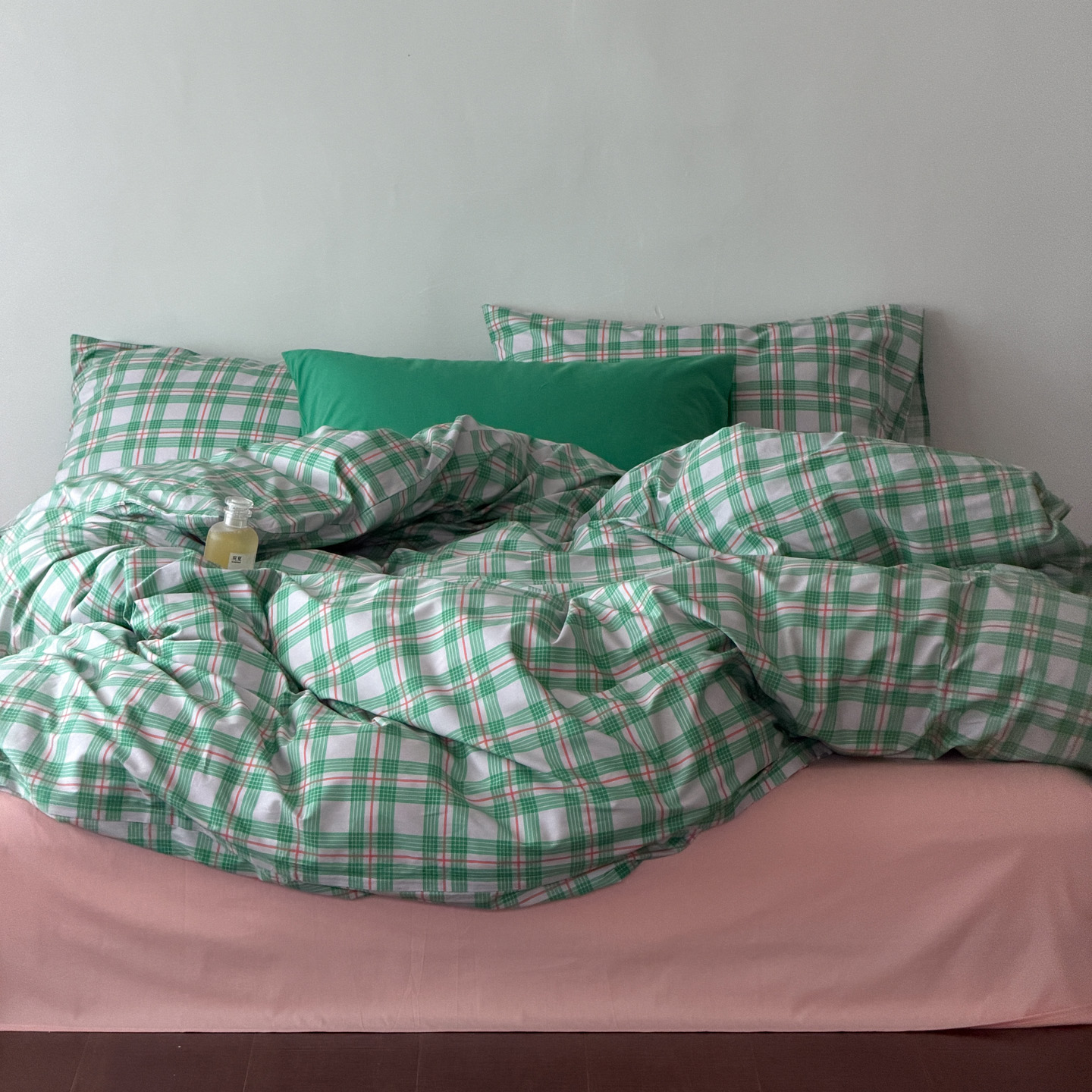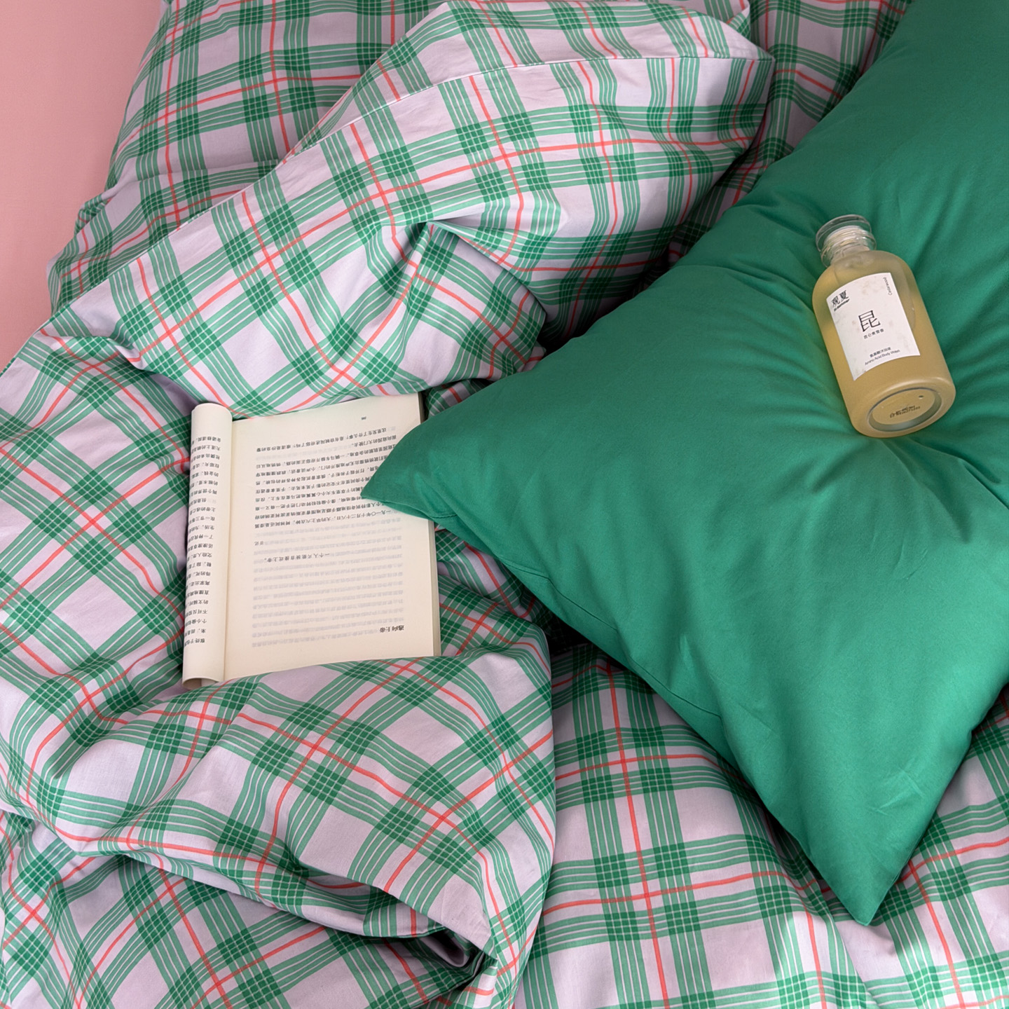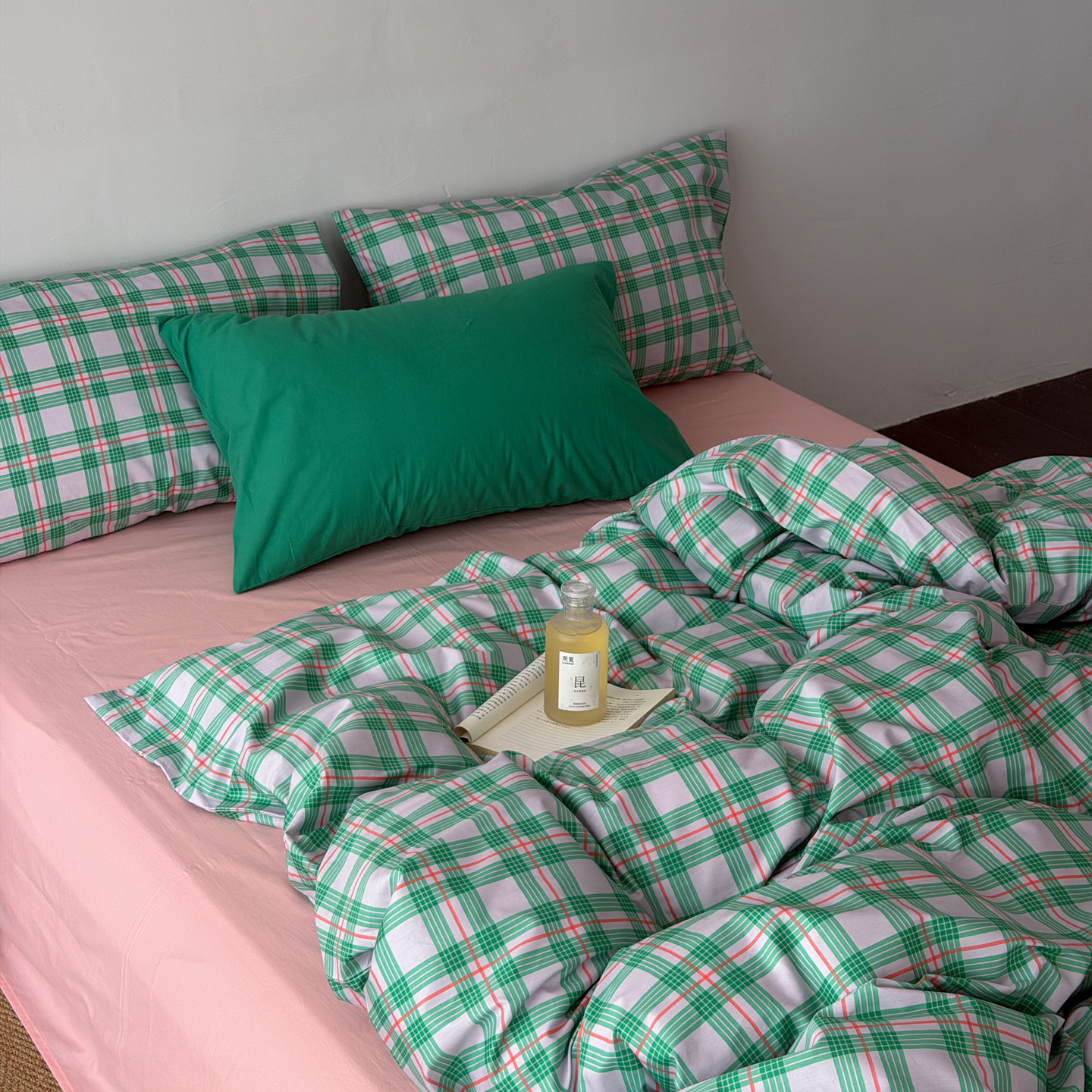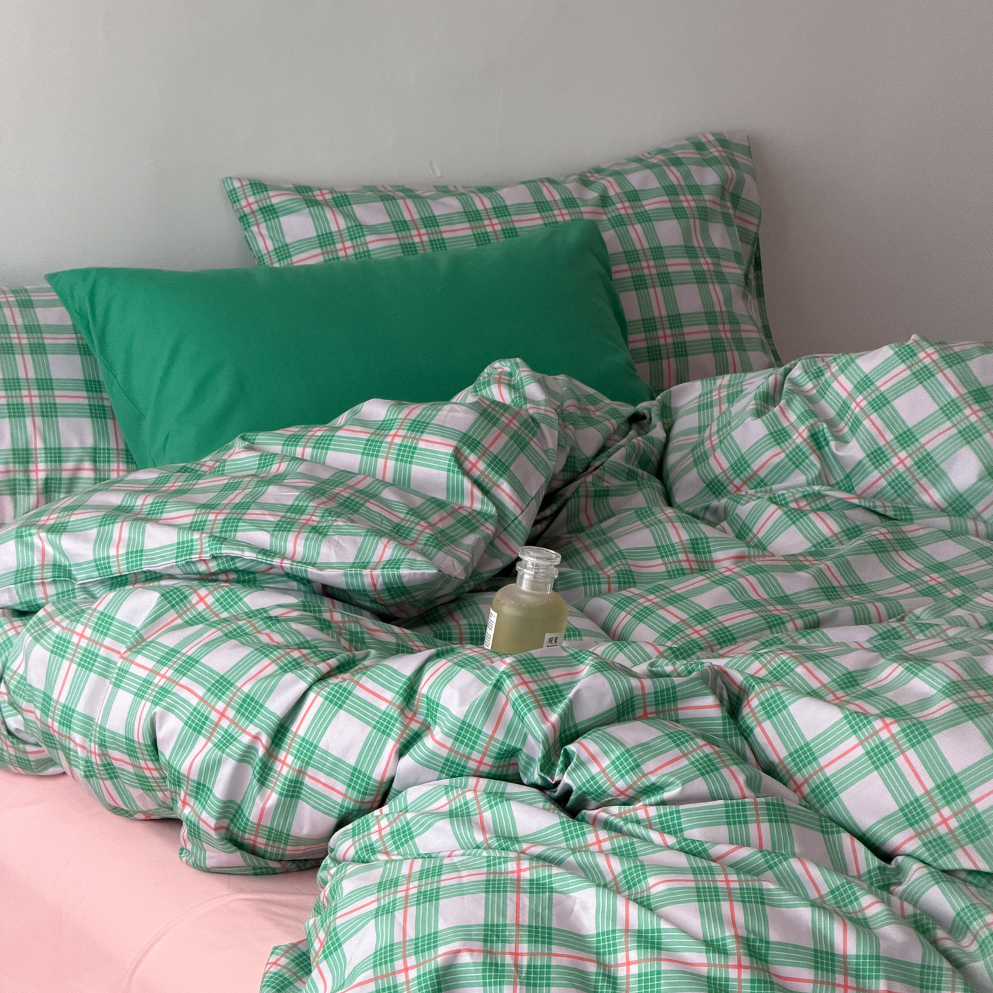 商品名称:(总)艾沁家纺 2026新款13372全棉数码印花小清新格子四件套-蜜桃青柠