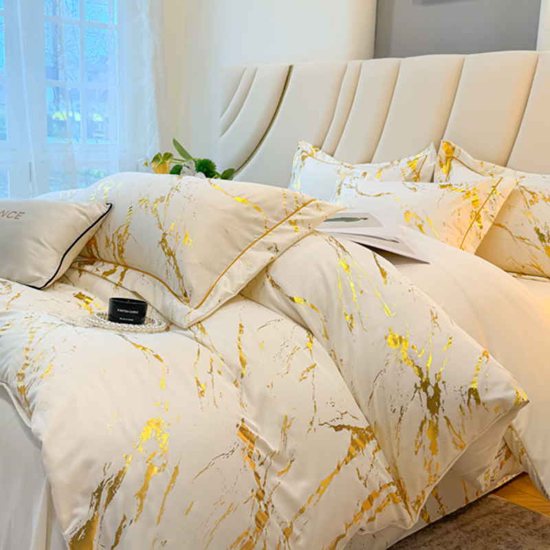 商品名称:棠颂家纺 2026新款直播热款沐光天丝烫金四件套吊边床单一字绣(礼盒款) 樱落星河