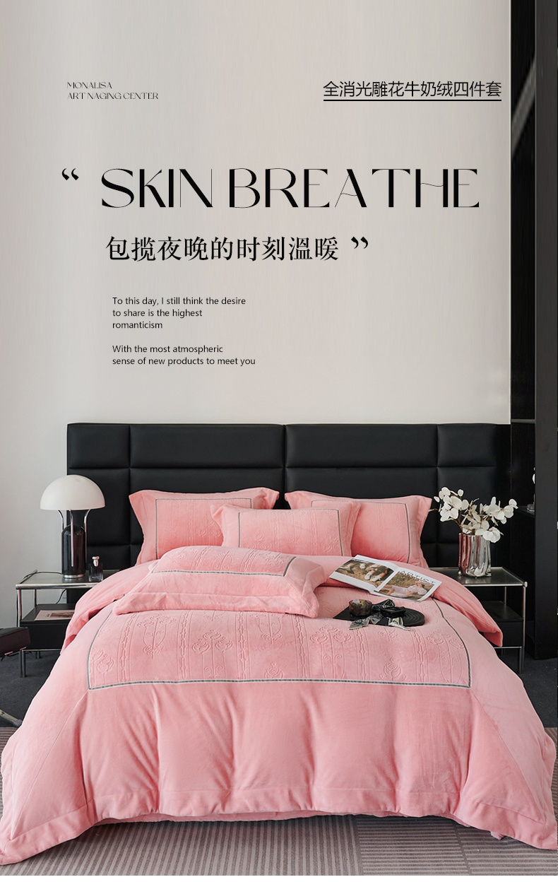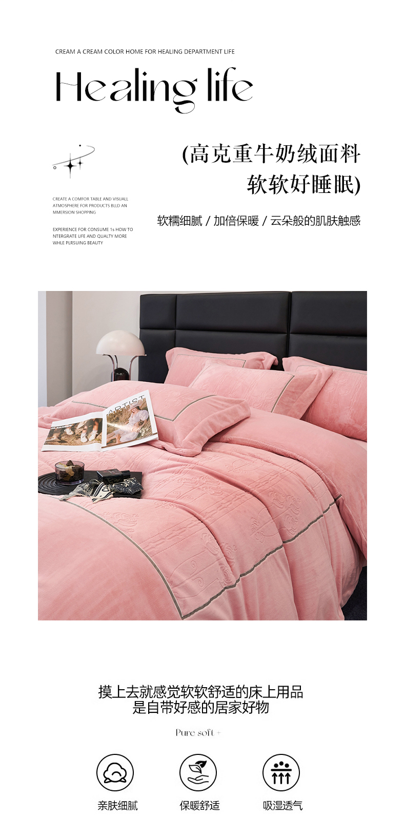 (总)榻尚 2023新款雕花牛奶绒婴肤暖绒四件套Queen-玫瑰花园,贵族白,牛油果,暖焦糖,松石绿,天空蓝,温柔粉