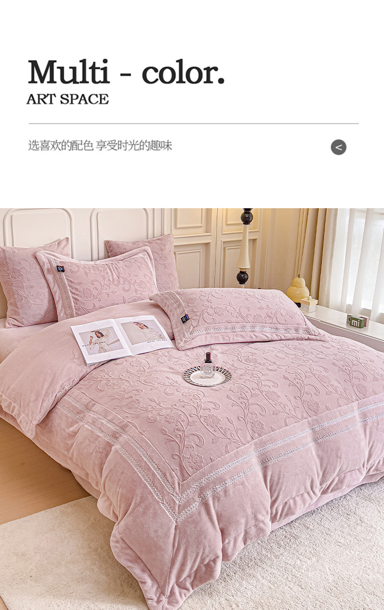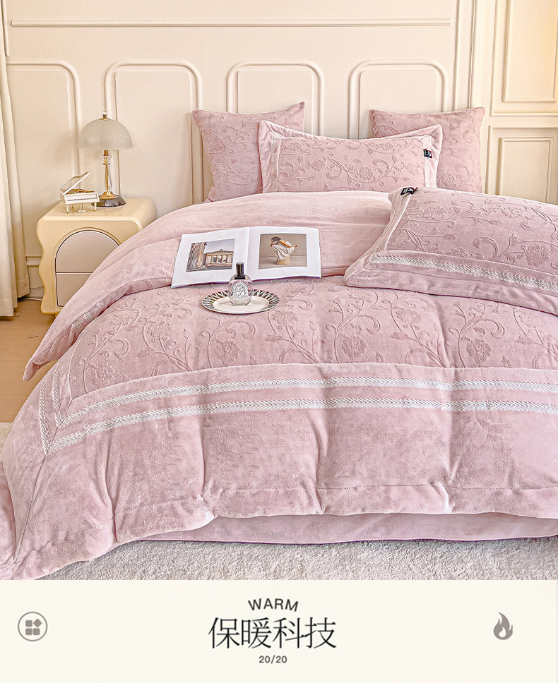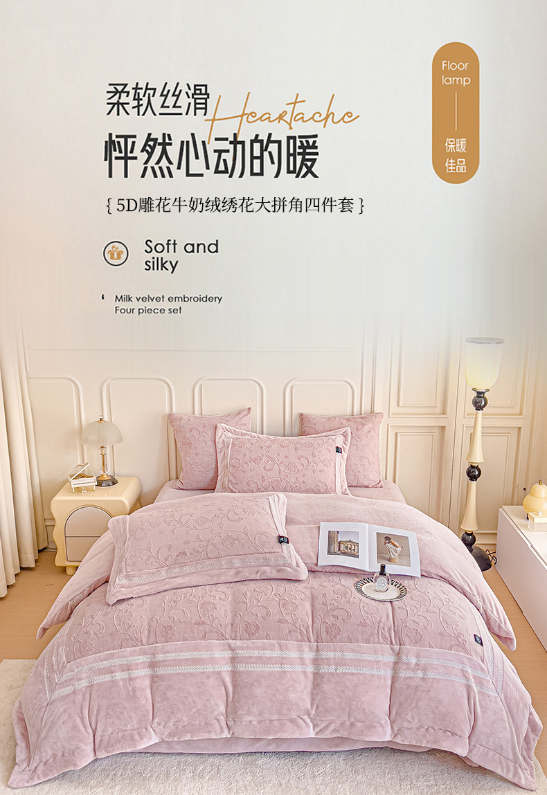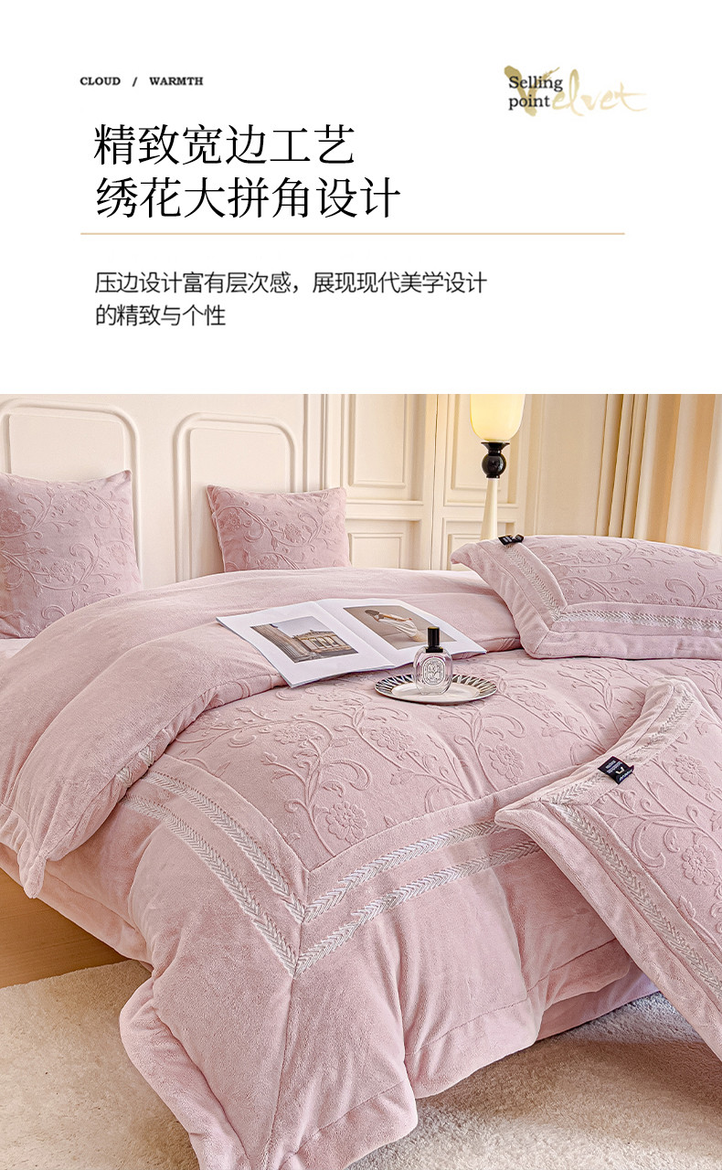 品家居 2025新款5D雕花牛奶绒绣花大拼角四件套-岁月静好 粉色