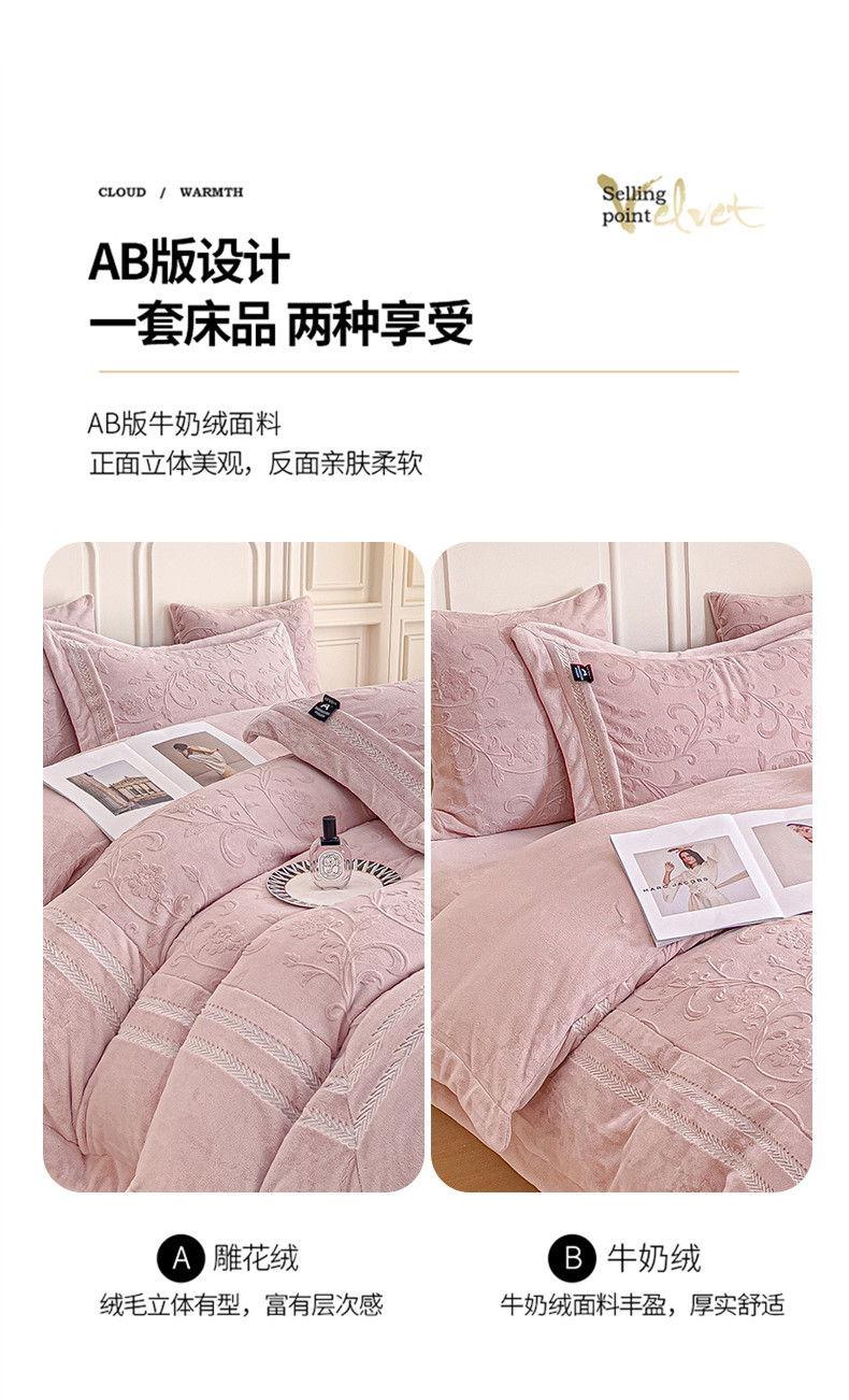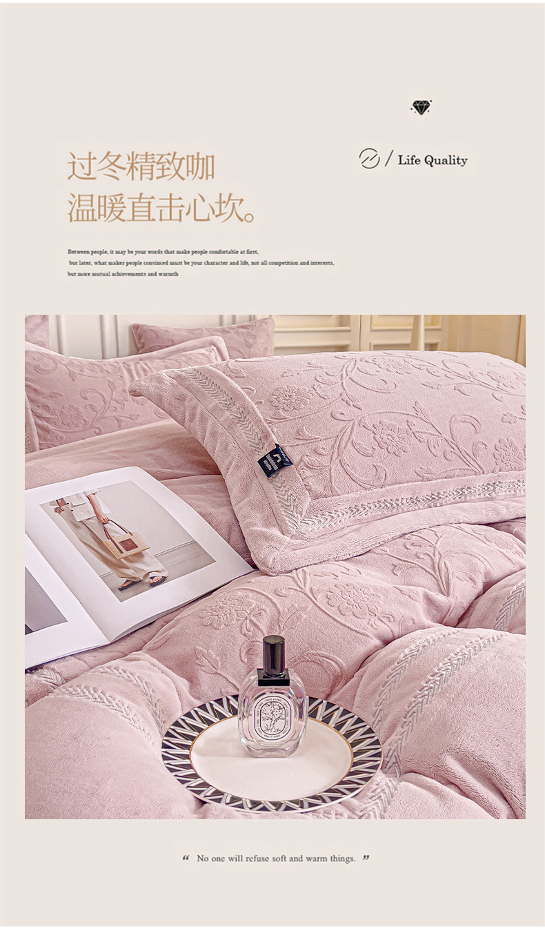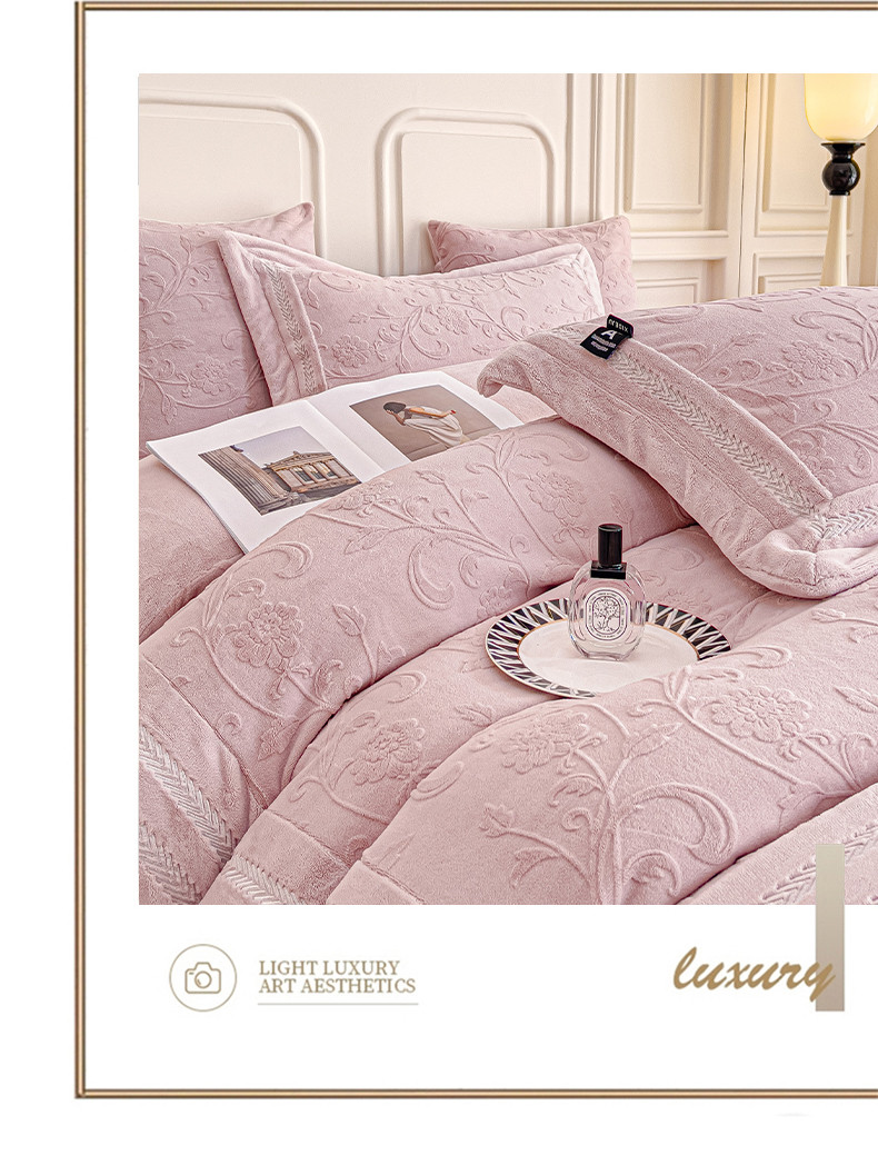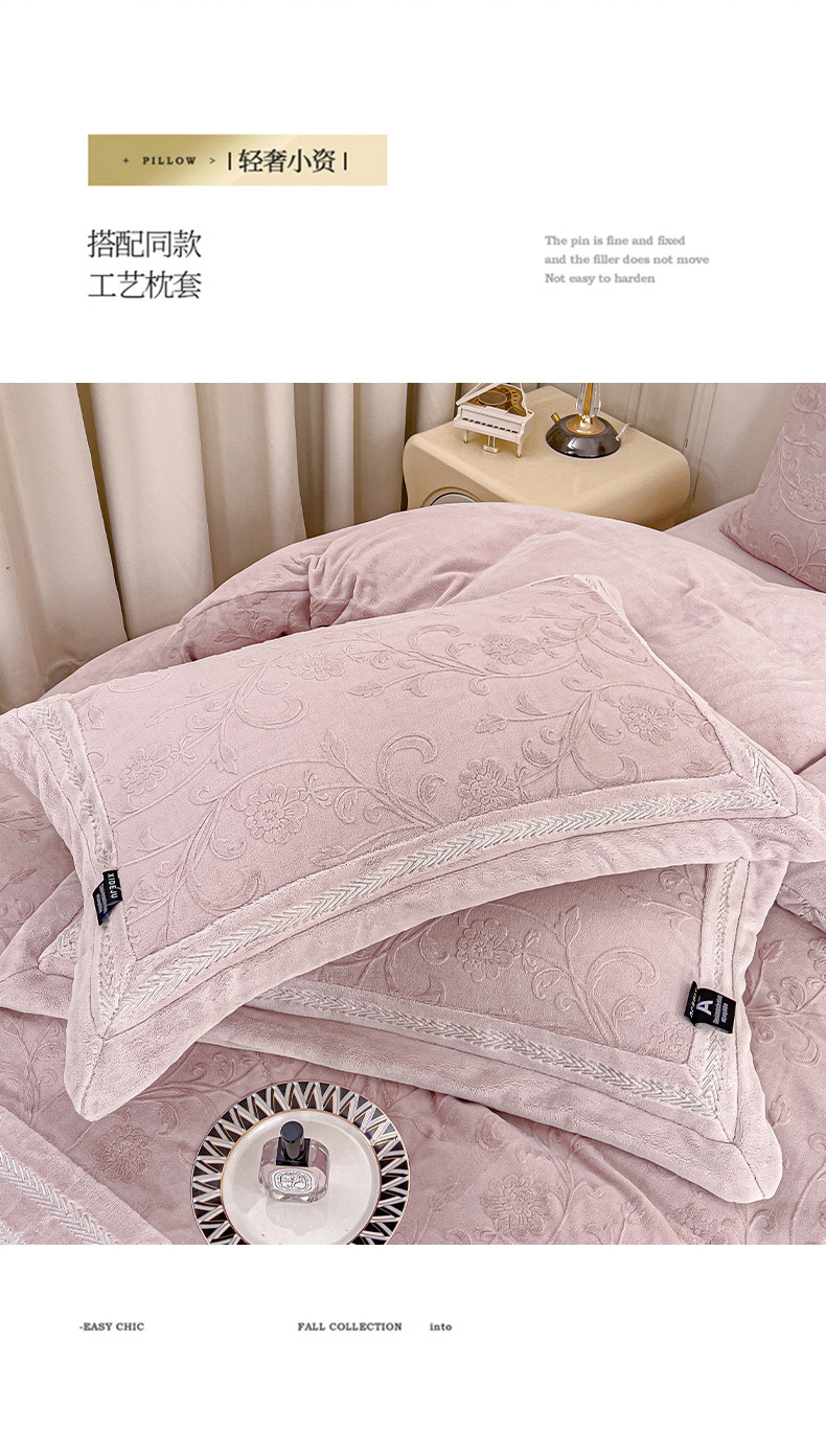品家居 2025新款5D雕花牛奶绒绣花大拼角四件套-岁月静好 粉色