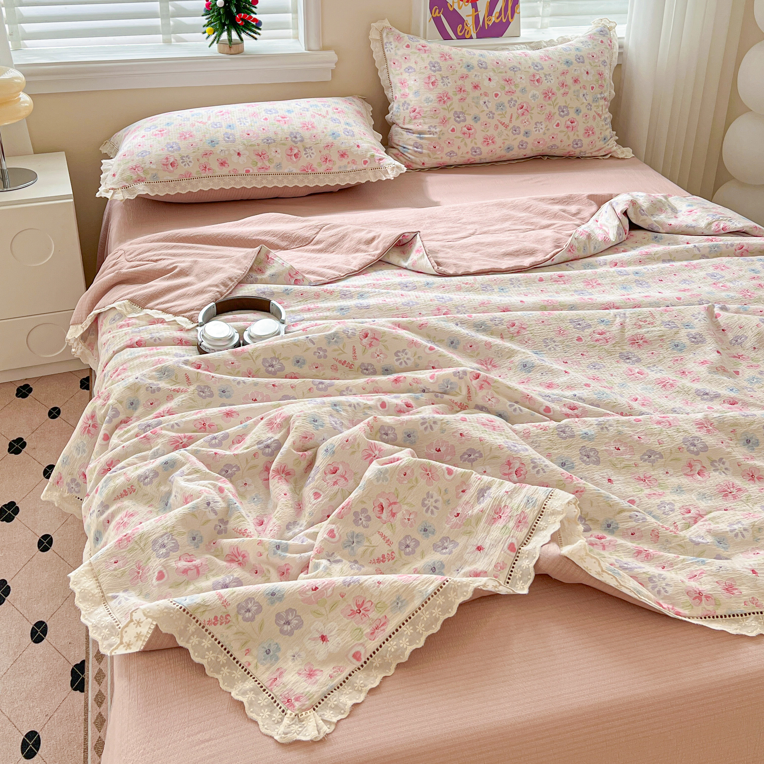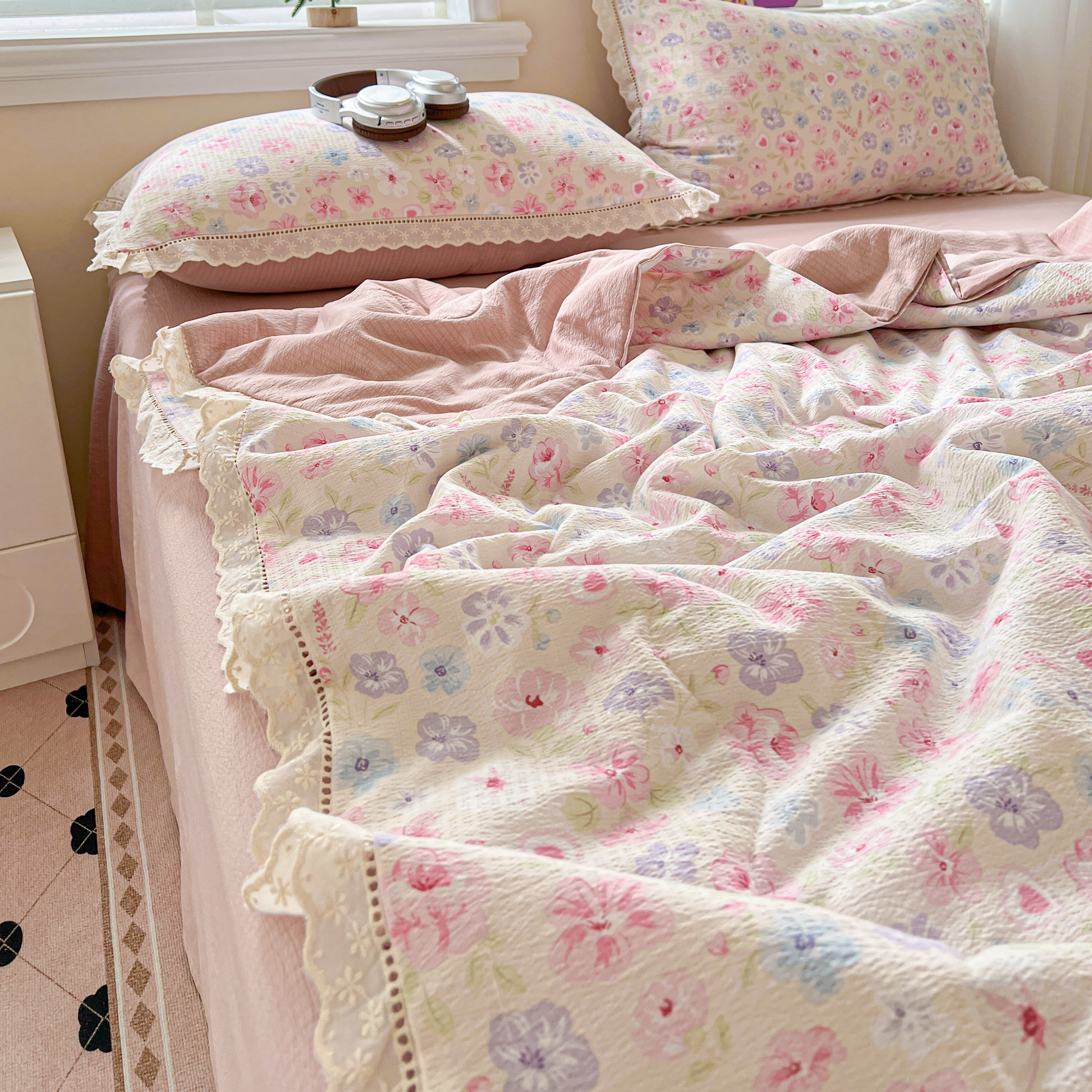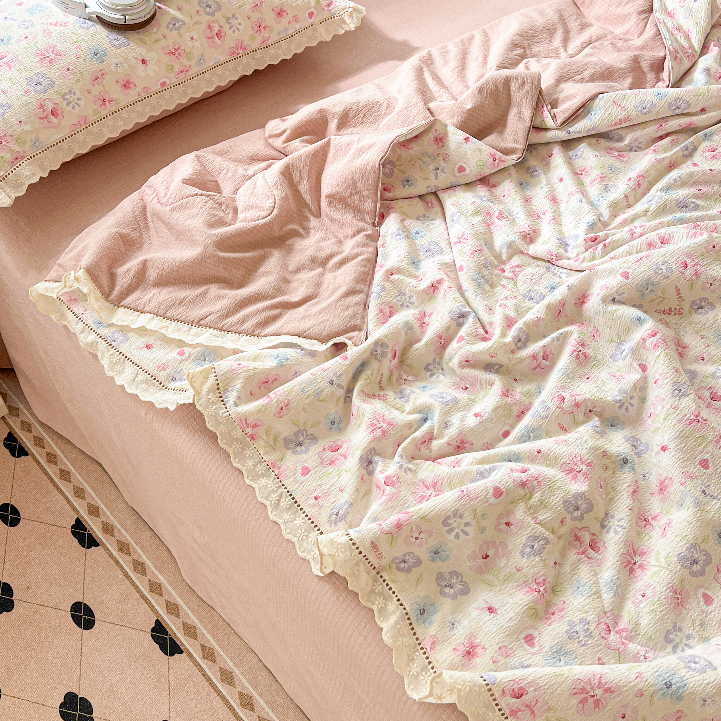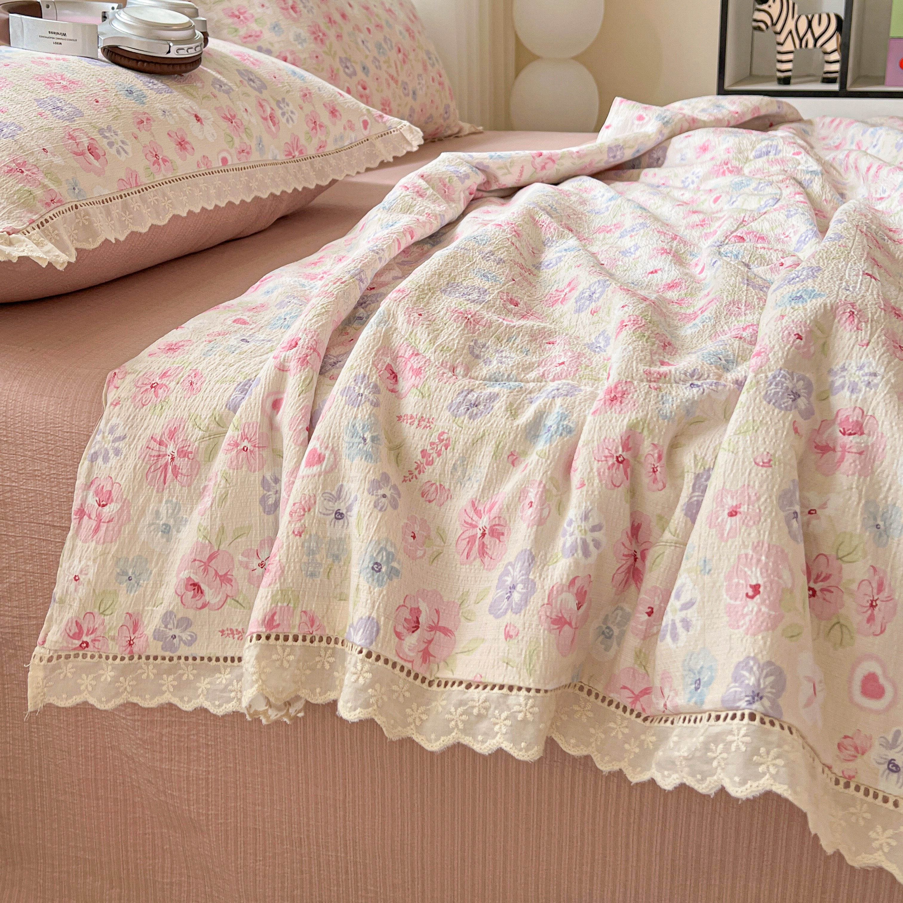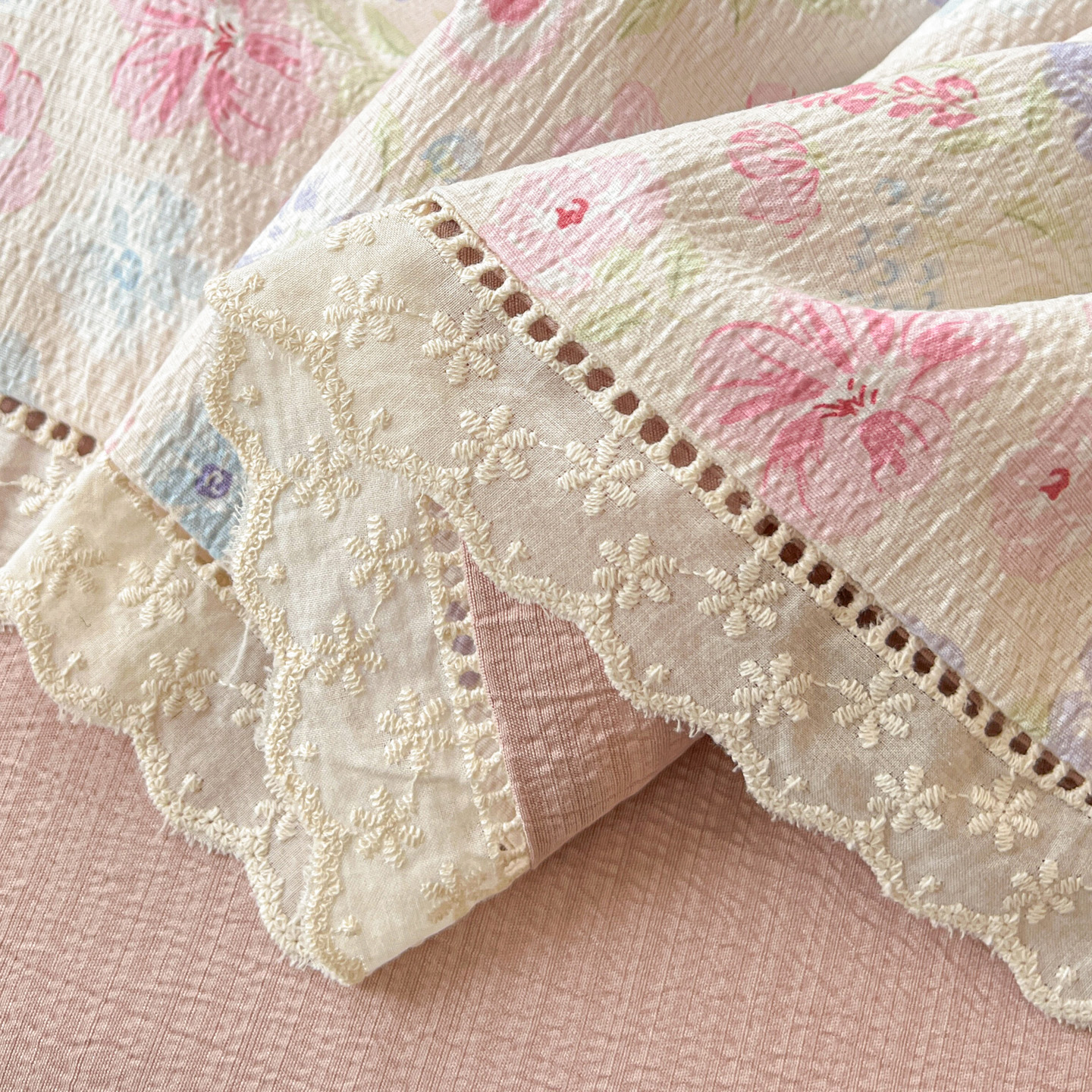 2025新款云感皱皱纱全棉花边款夏被四件套 桃夭