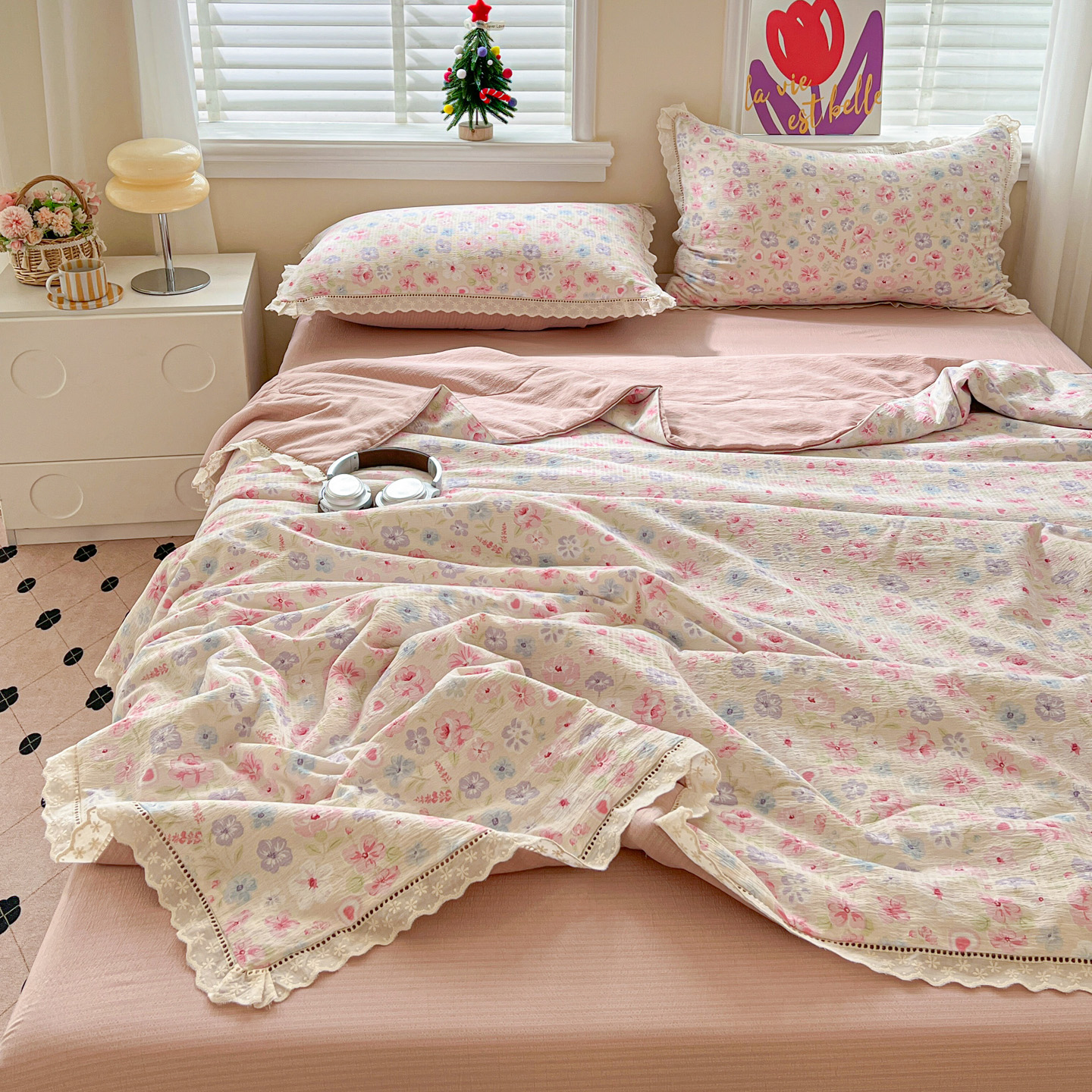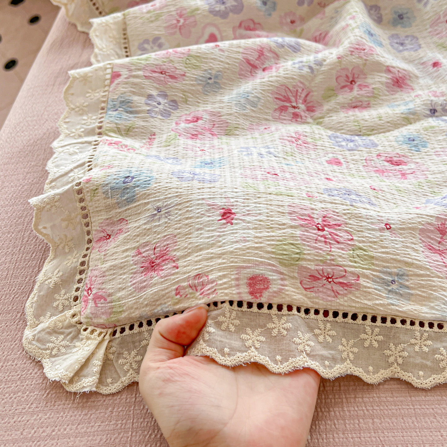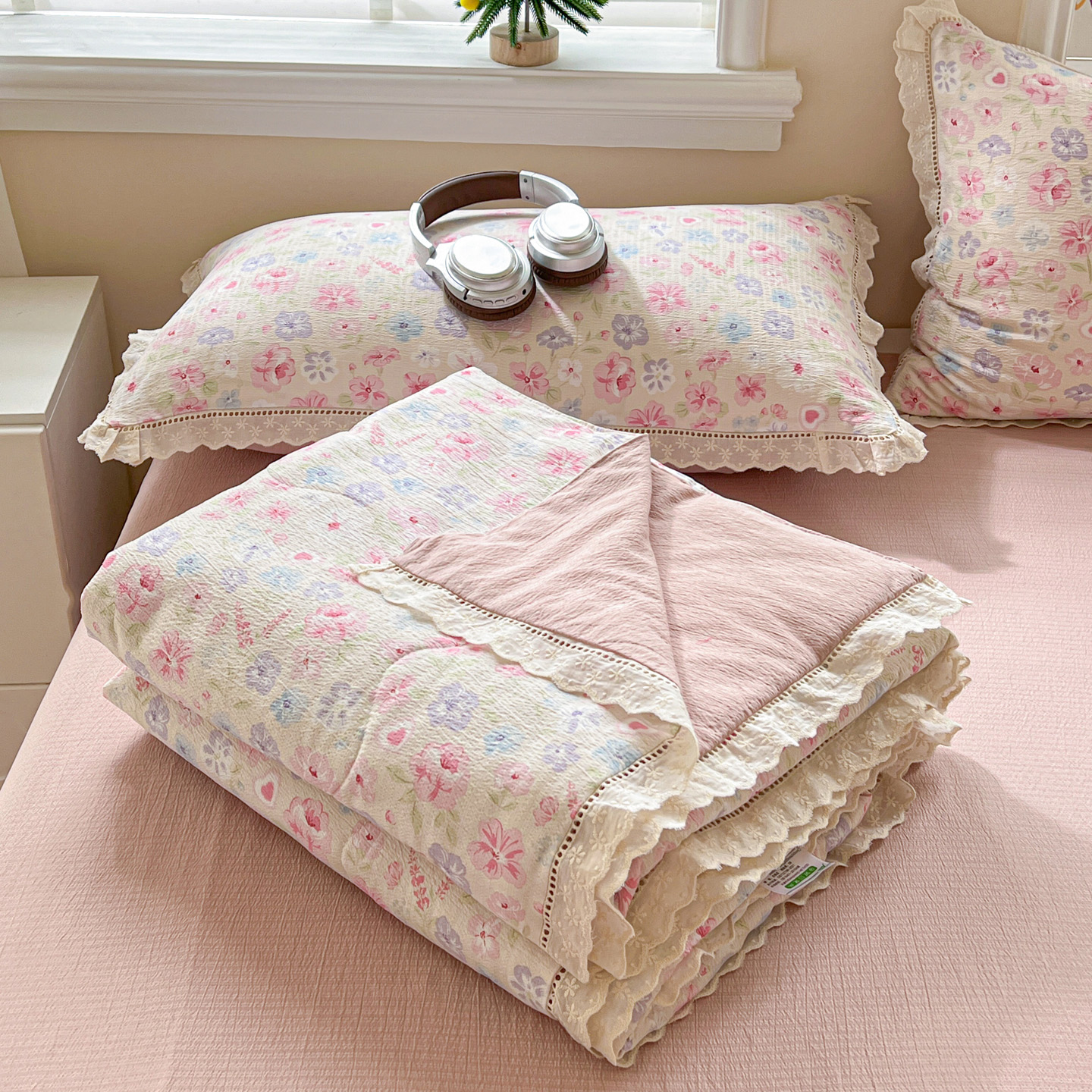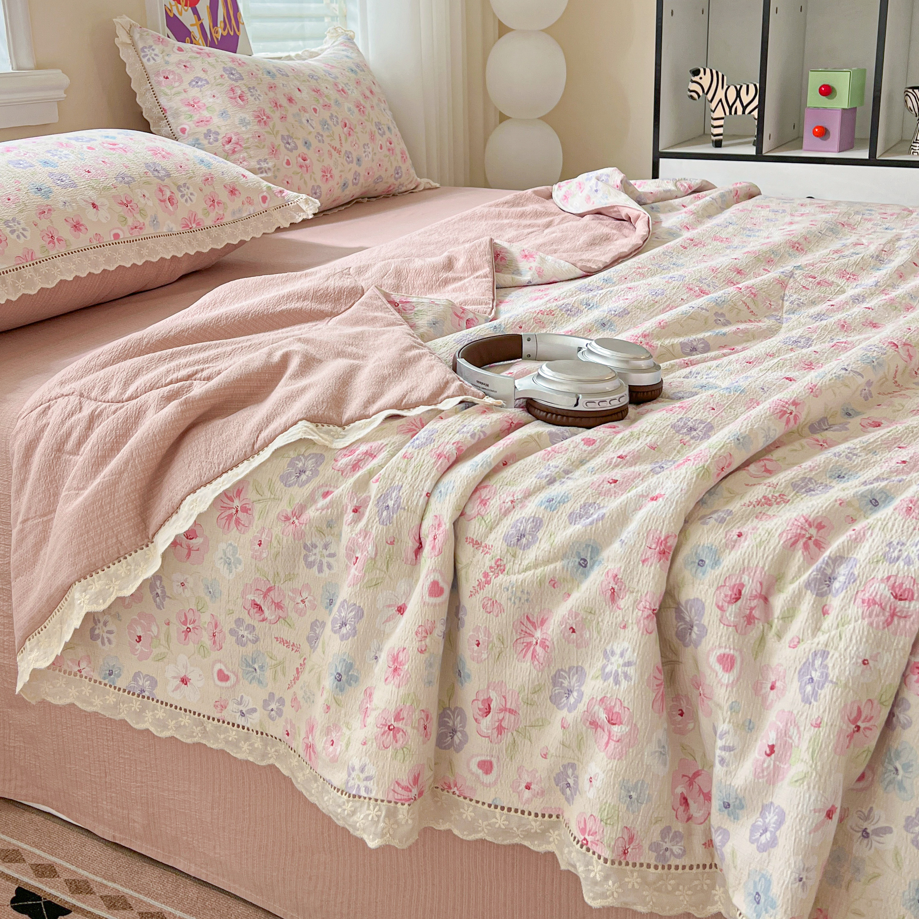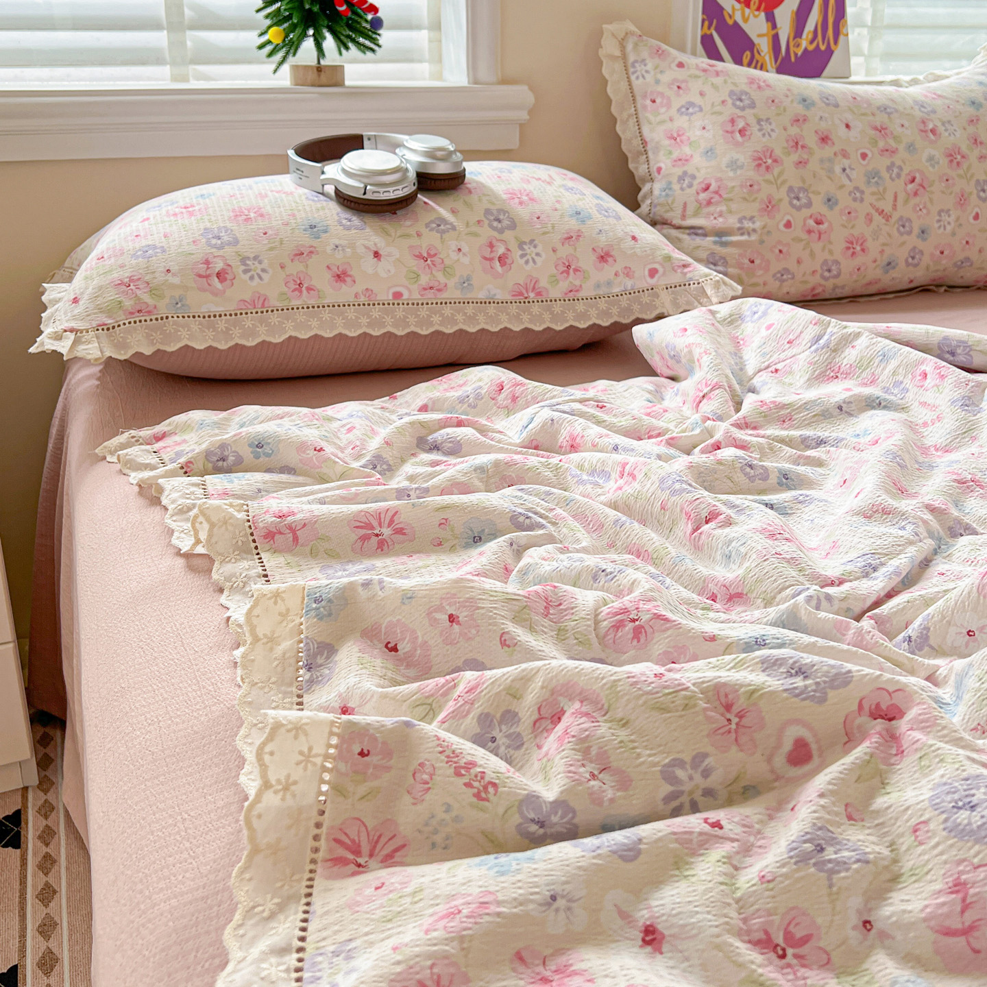 2025新款云感皱皱纱全棉花边款夏被四件套 桃夭