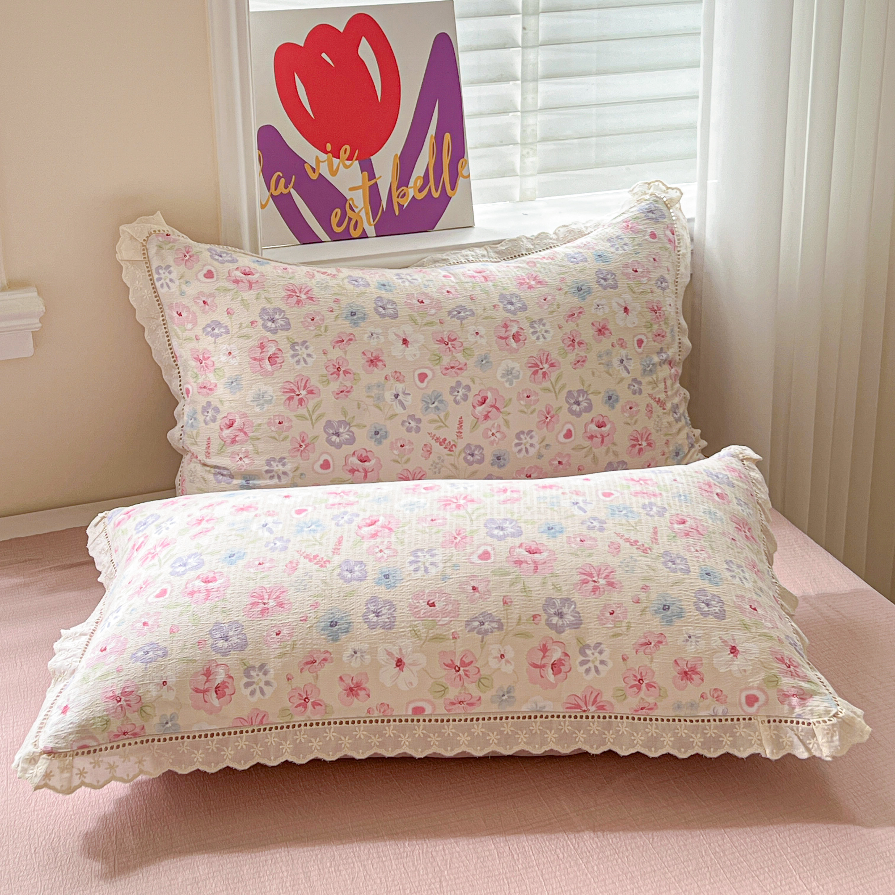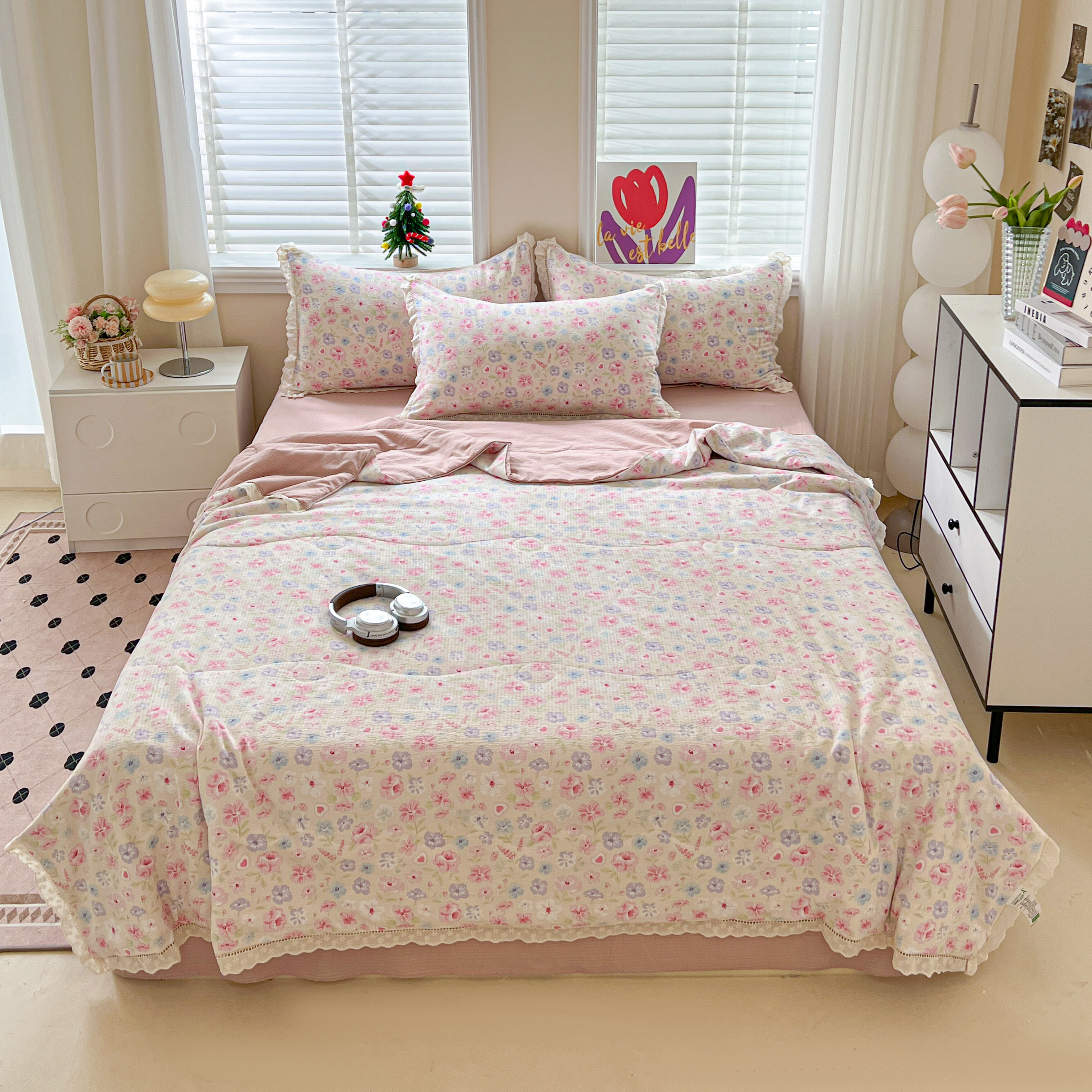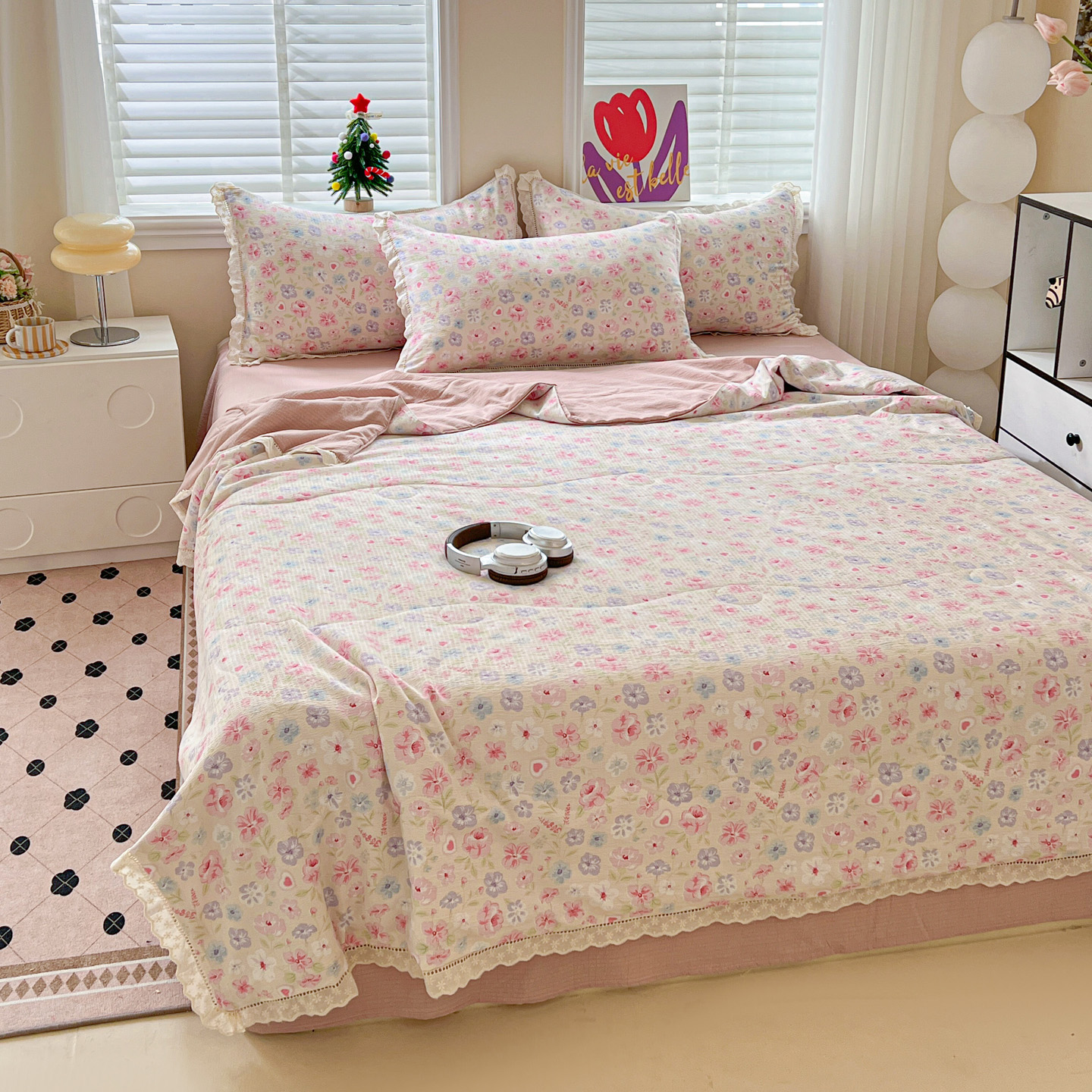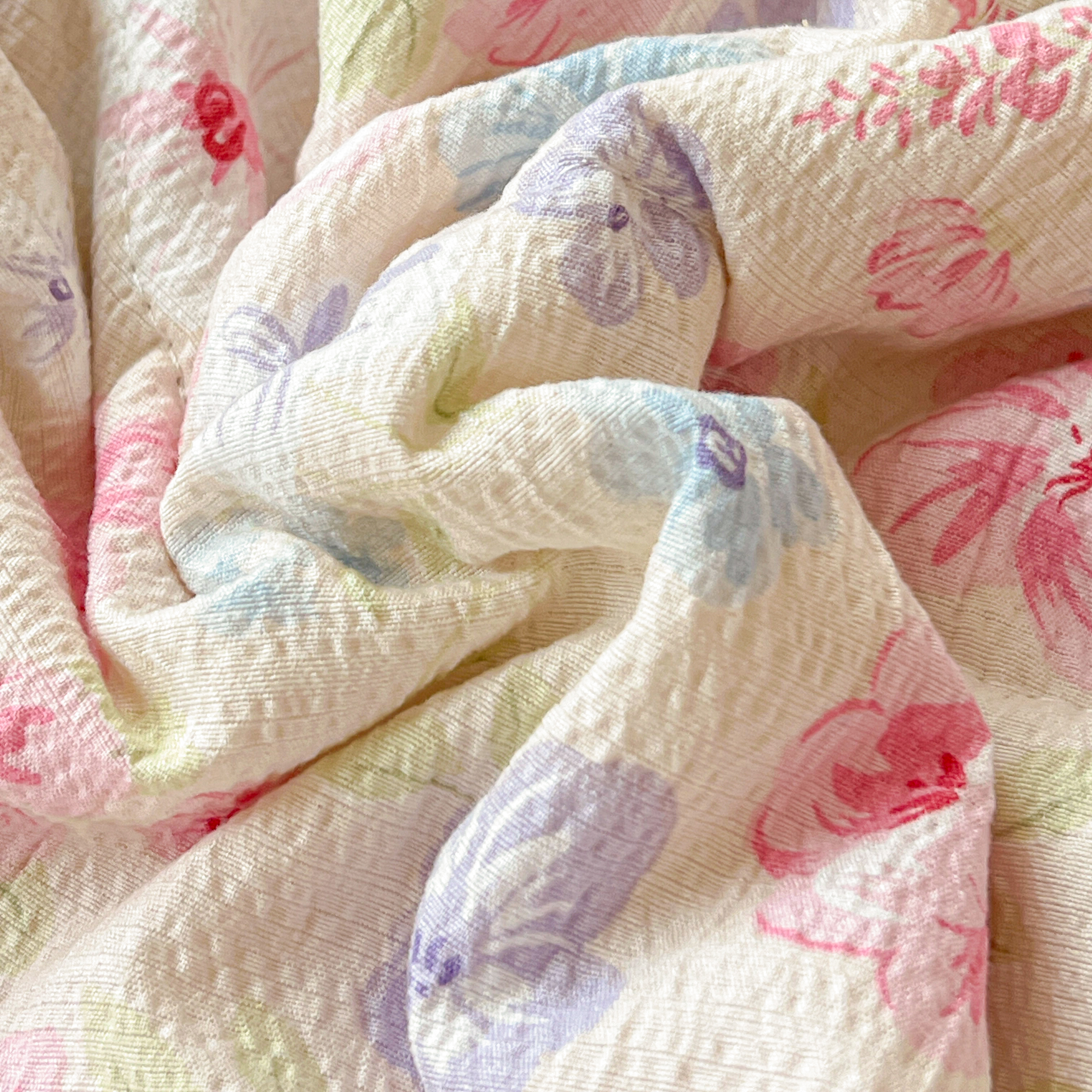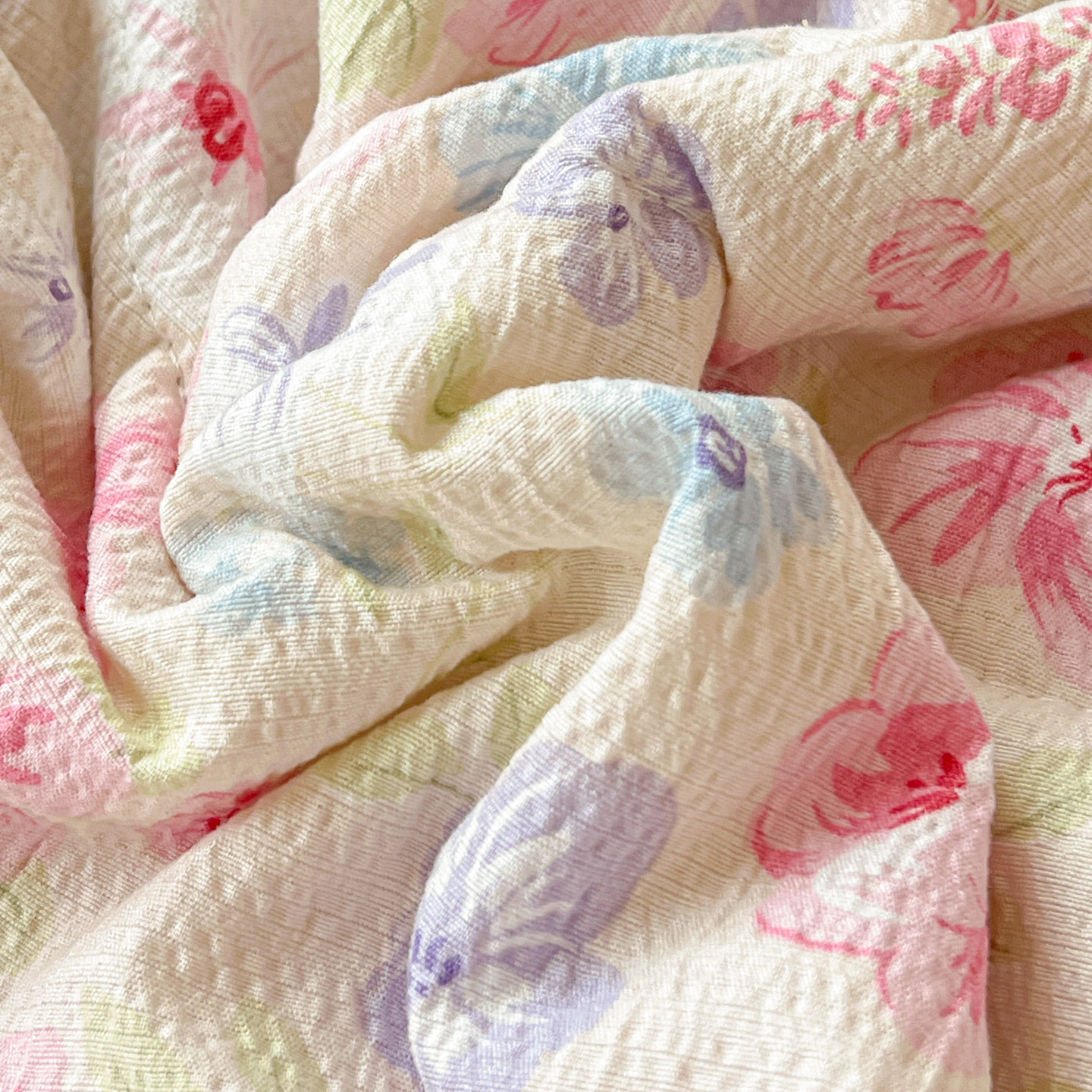 2025新款云感皱皱纱全棉花边款夏被四件套 桃夭