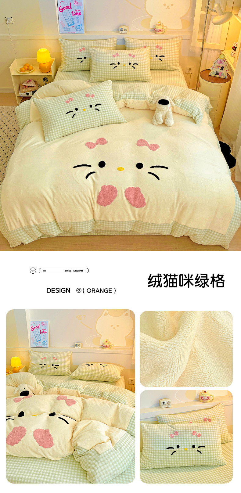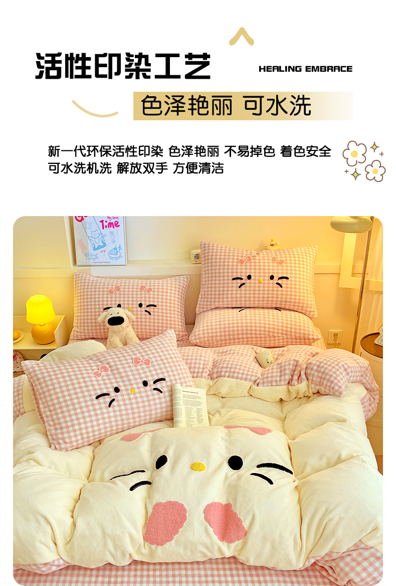 商品名称:富米莱(原臻工厂) 2025新款爆款拼角毛巾绣牛奶绒四件套 绒猫咪粉格