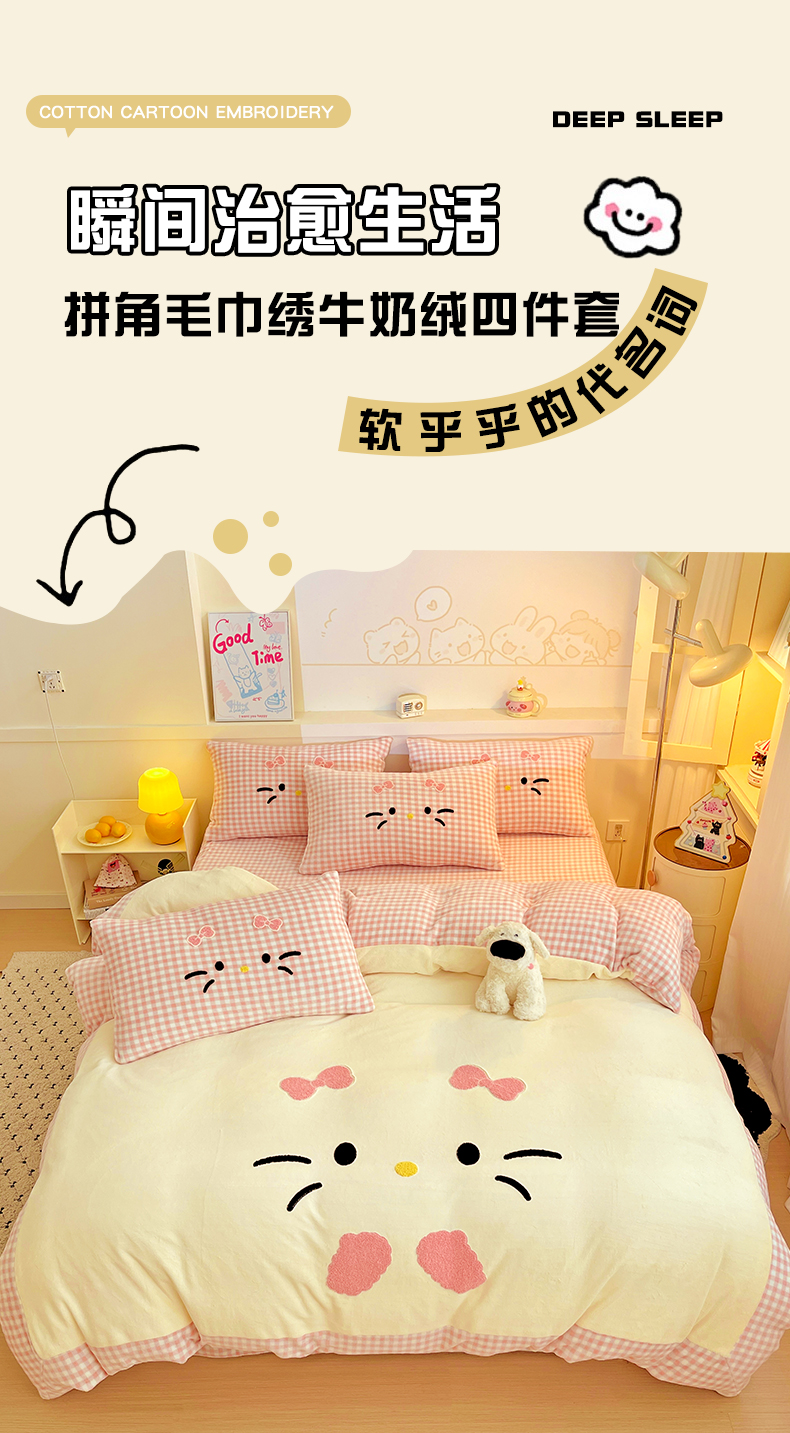 富米莱(原臻工厂) 2025新款爆款拼角毛巾绣牛奶绒四件套 绒猫咪粉格