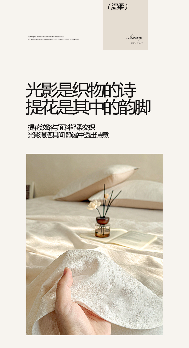(总)涵宸家纺 2026新款全棉提花里拉系列四件套,柏拉-白,花夕-粉,凌维-灰,凌维-绿,律动格韵,千喜格,沁语-粉金,沁语-奶白,沁语-紫,山慕色,甜心漾,微芒,雾絮-灰,雾絮-奶白,毓影-豆沙,毓影-奶白,云暖-粉,云暖-紫,织羽