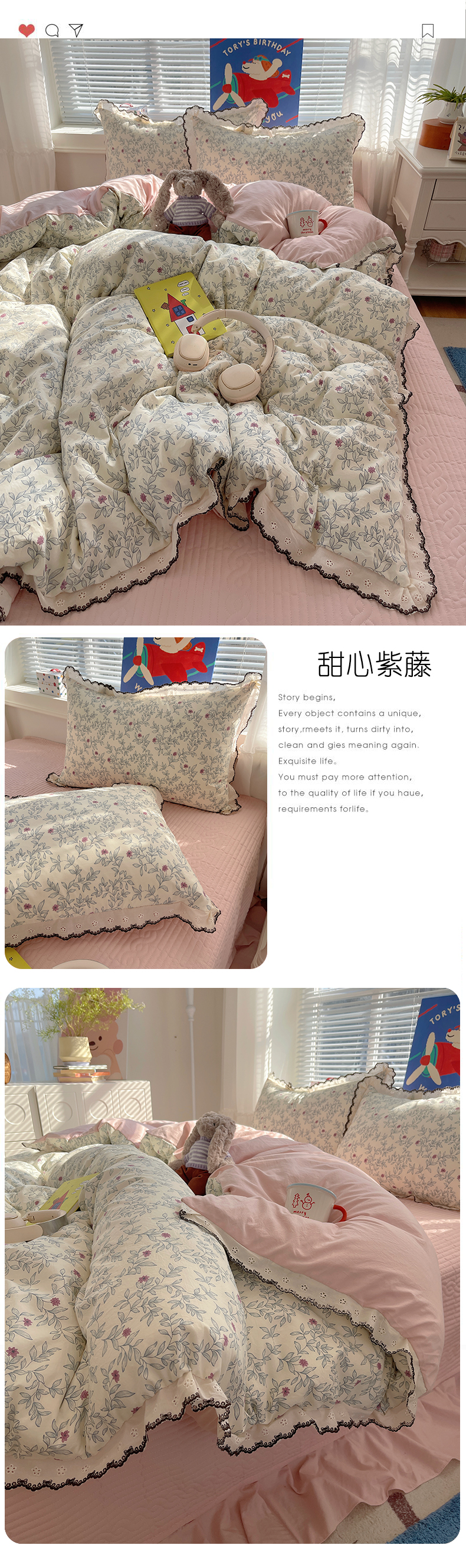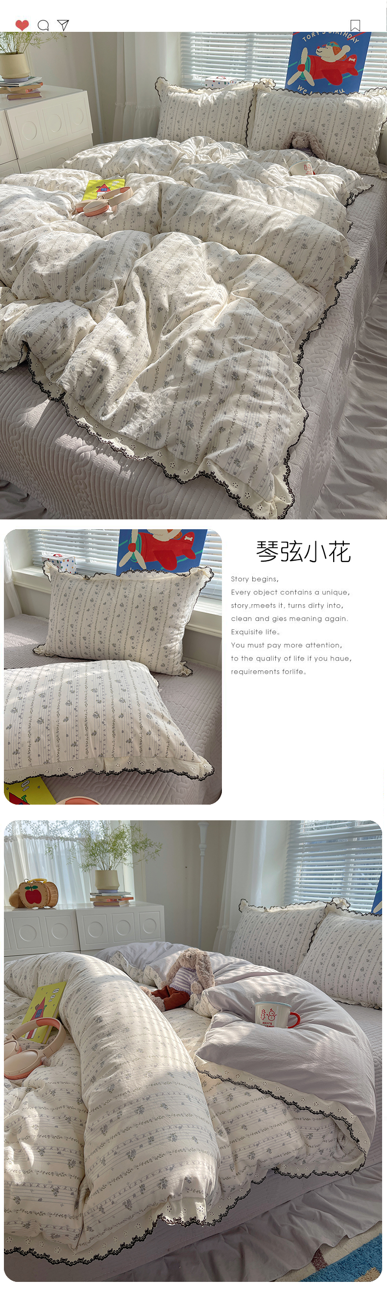 当前位置: 91家纺网 > 商品网购 > 床品套件 > 四件套 > 其它四件套 > 花漾家居 2026小红书推荐款小清新刺绣花边款床单床盖款四件套新款 琴弦小花