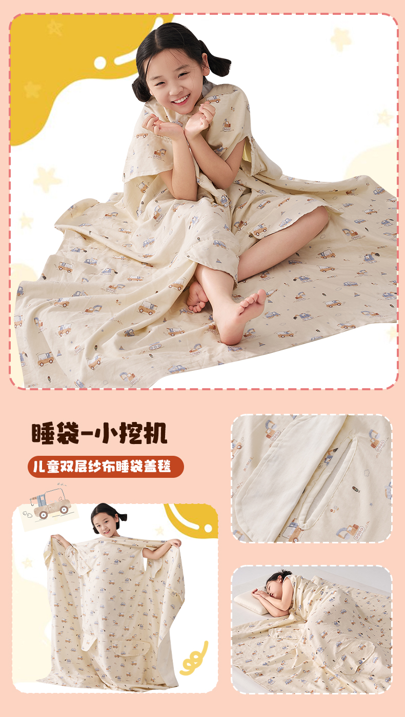 (总)暖阳 2026新款儿童双层纱布睡袋盖毯,睡袋-星星小崽,睡袋-粉色喵喵,睡袋-黄油小熊,睡袋-气球小象,睡袋-睡衣小狗,睡袋-小挖机