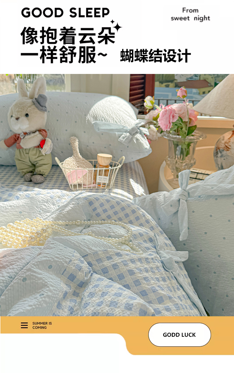 (总)爱彼家纺 2026春夏新款提花泡芙棉拼角蝴蝶结软乎乎的撸猫感单夏被夏被四件套-甜莓气泡,泡芙夏被-海盐蓝波点,泡芙夏被-奶粉波点,泡芙夏被--奶红波点,泡芙夏被--奶灰波点,组合图仅供参考不可下单