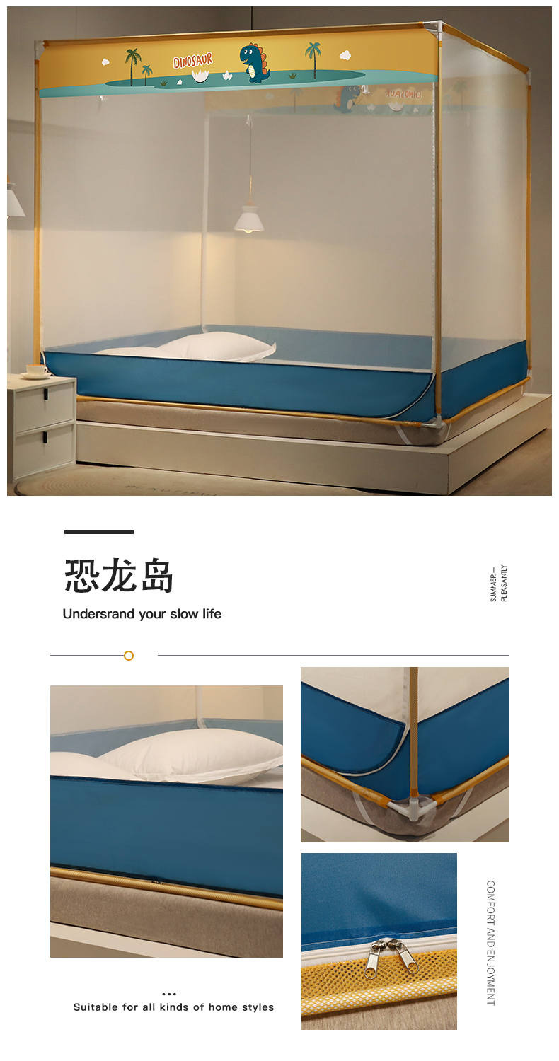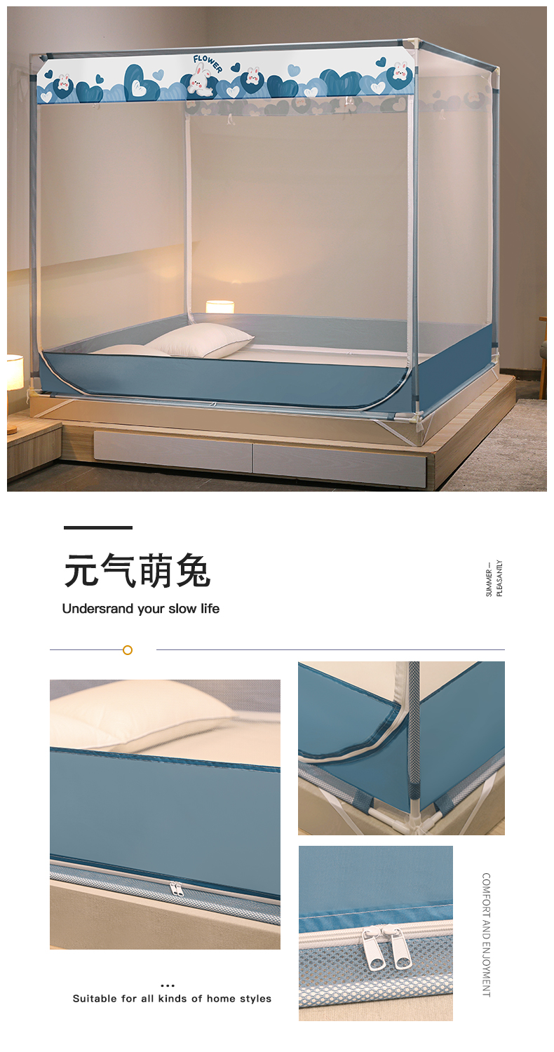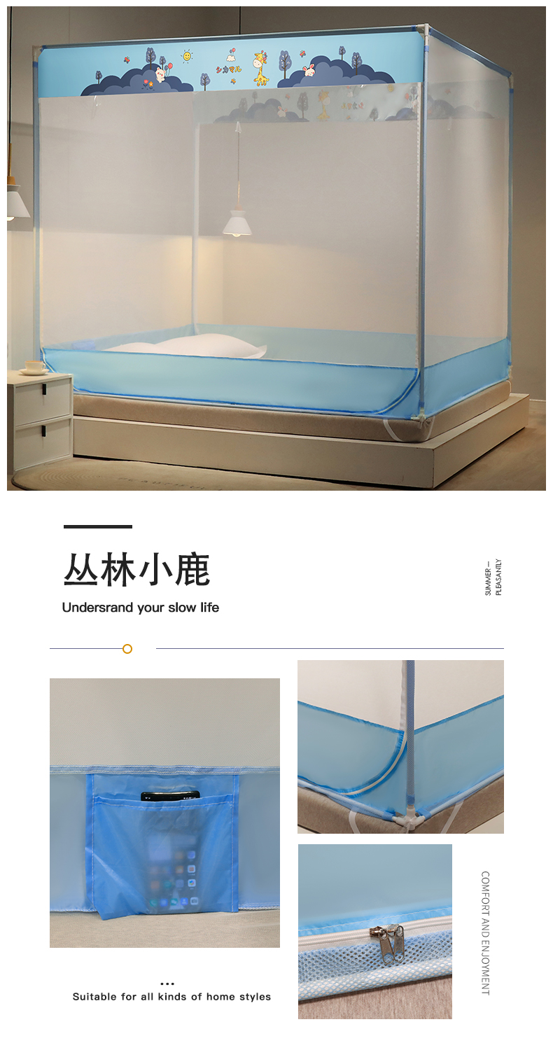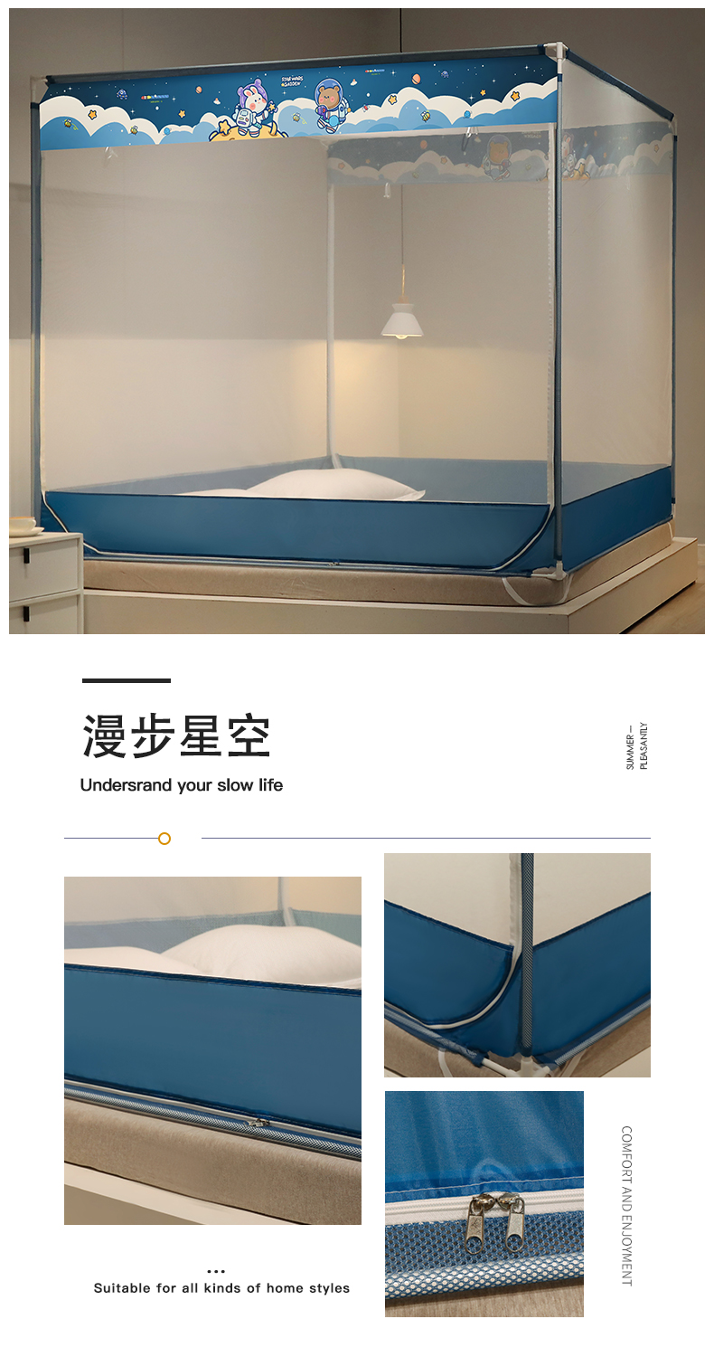 (总)佳梦家纺 2026新款三开门蒙古包印花蚊帐,可可猫,松果蓝,幸运狗,蜜桃猫,太空蓝