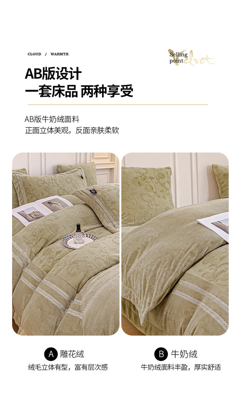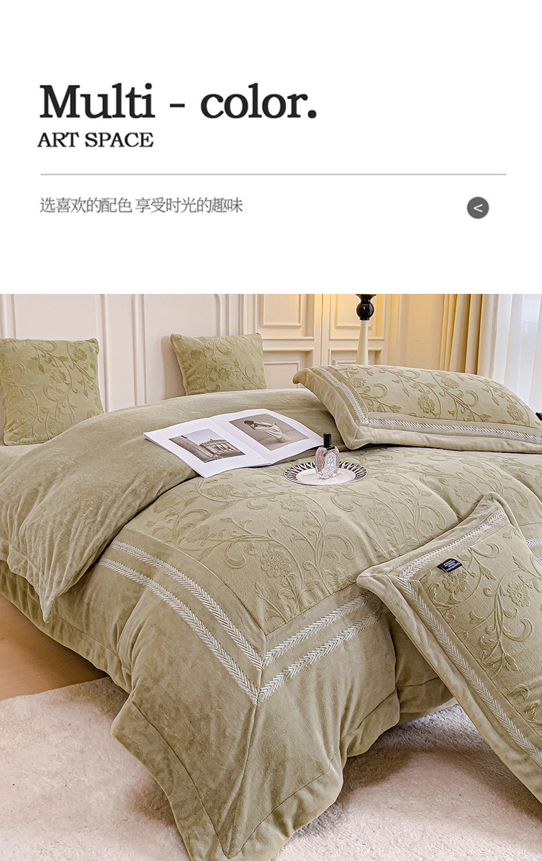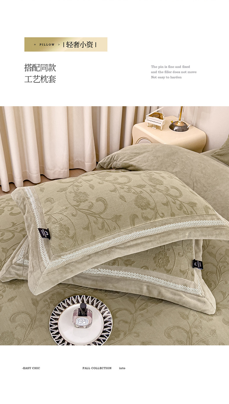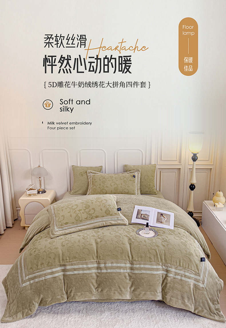 (总)品家居 2025新款5D雕花牛奶绒绣花大拼角四件套-岁月静好,粉色,蓝色,秋黄