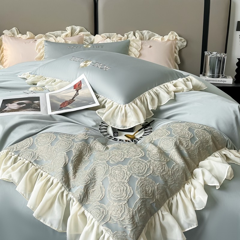 栩裕纺织 2025新款轻奢法式花边绣花四件套 山茶玫瑰