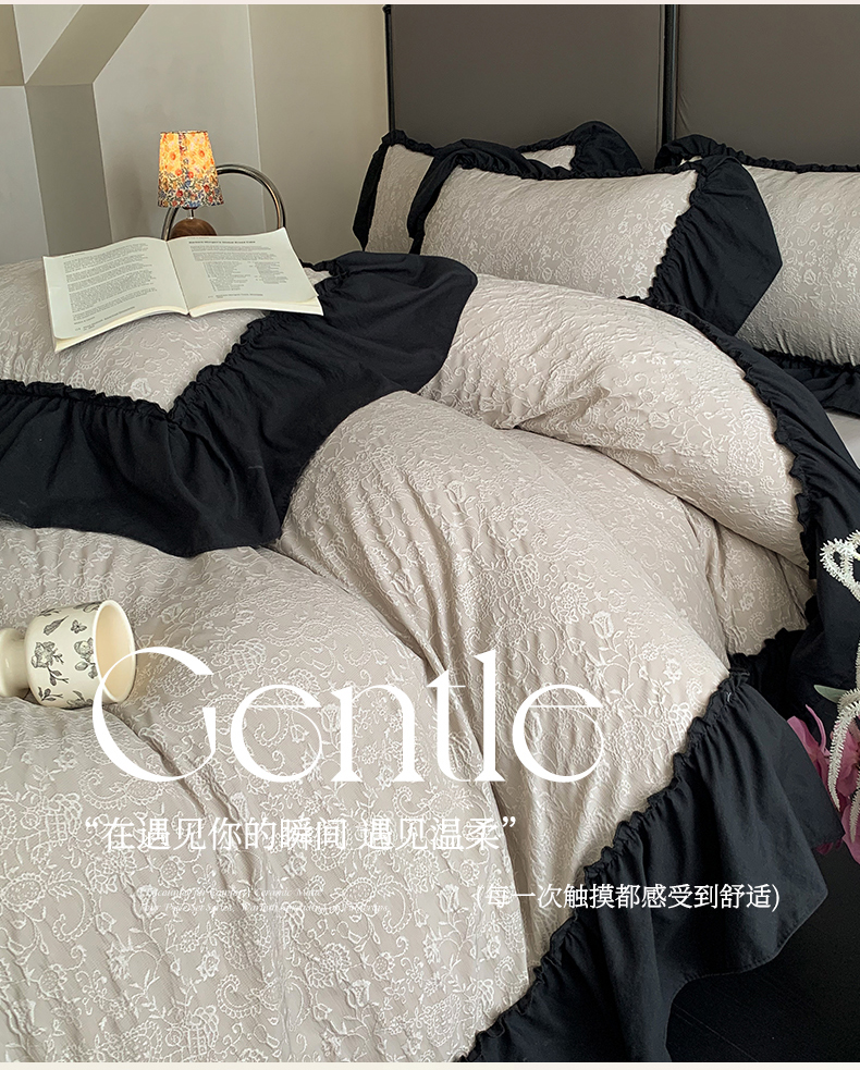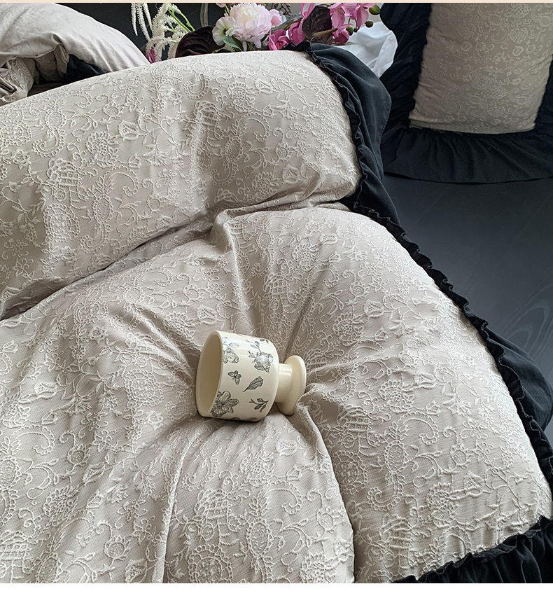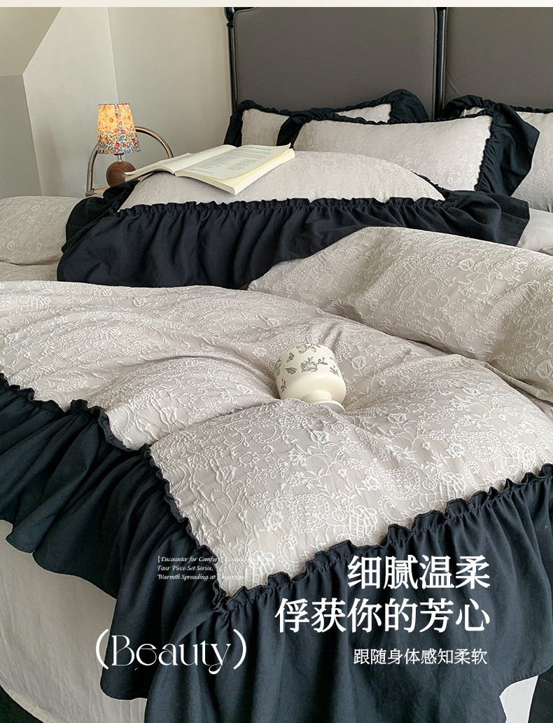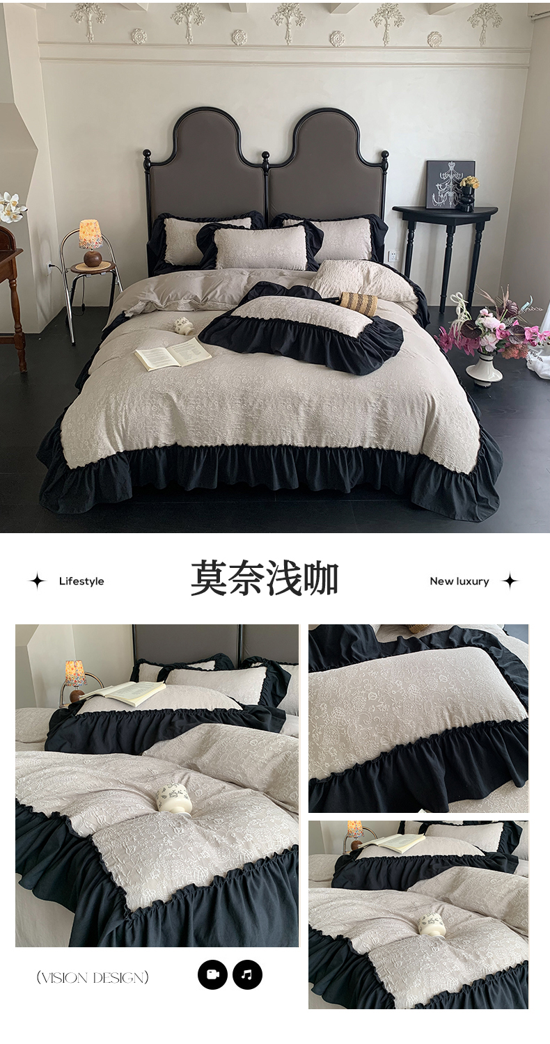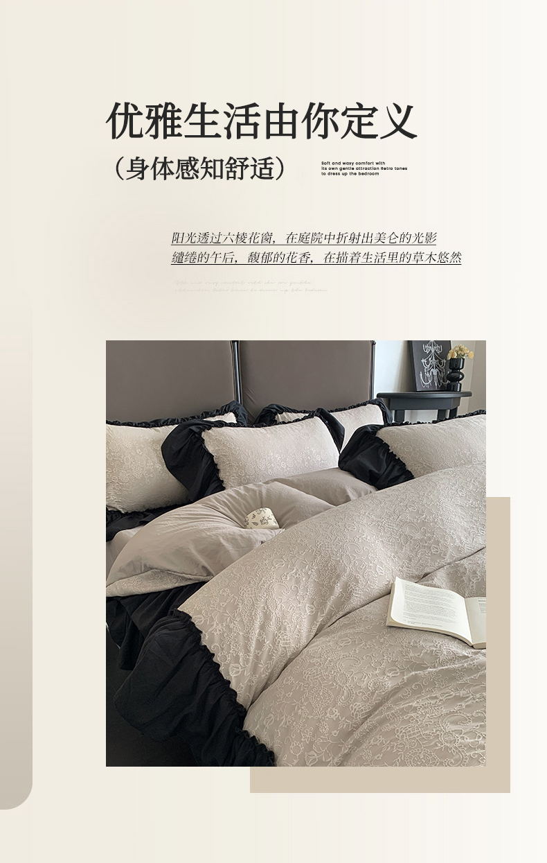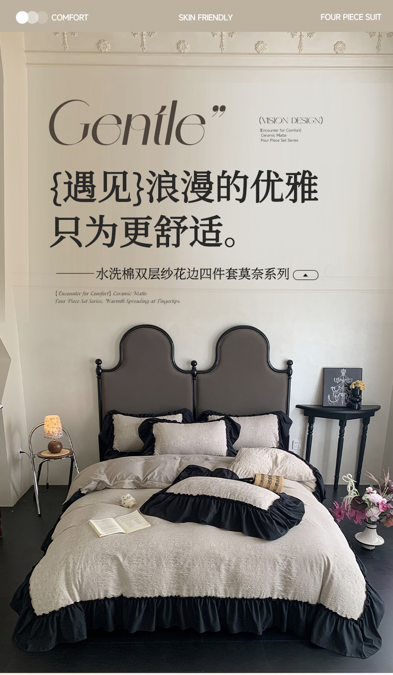当前位置: 91家纺网 > 商品网购 > 床品套件 > 四件套 > 水洗棉四件套 > 你好美丽 2025新款莫奈水洗磨毛双层纱立体提花大花边工艺款四件套 莫奈浅咖