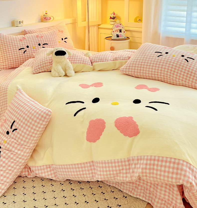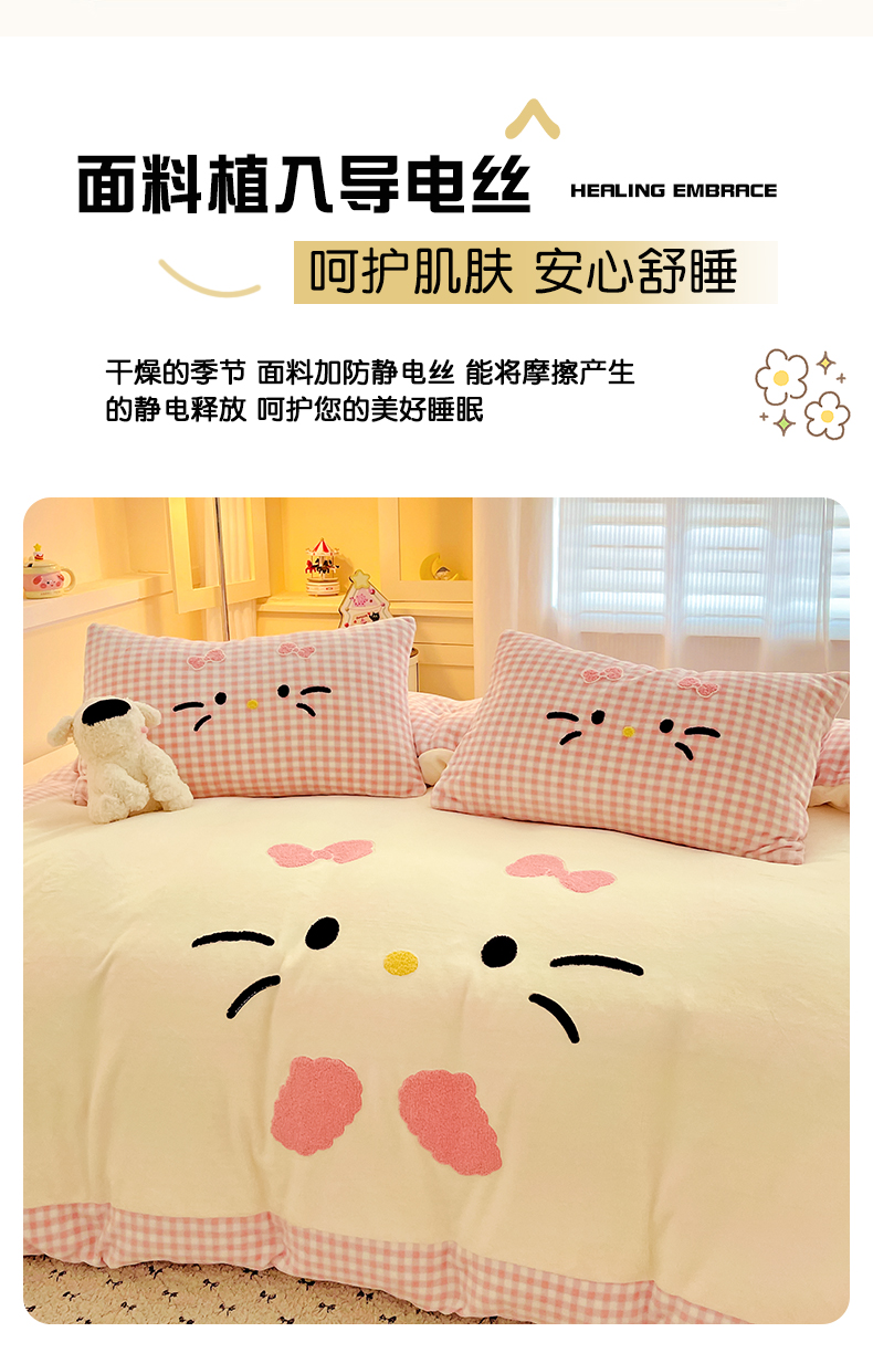 商品名称:富米莱(原臻工厂) 2025新款爆款拼角毛巾绣牛奶绒四件套 绒猫咪蓝格