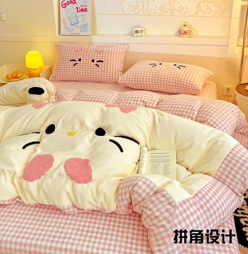 富米莱(原臻工厂) 2025新款爆款拼角毛巾绣牛奶绒四件套 绒猫咪蓝格