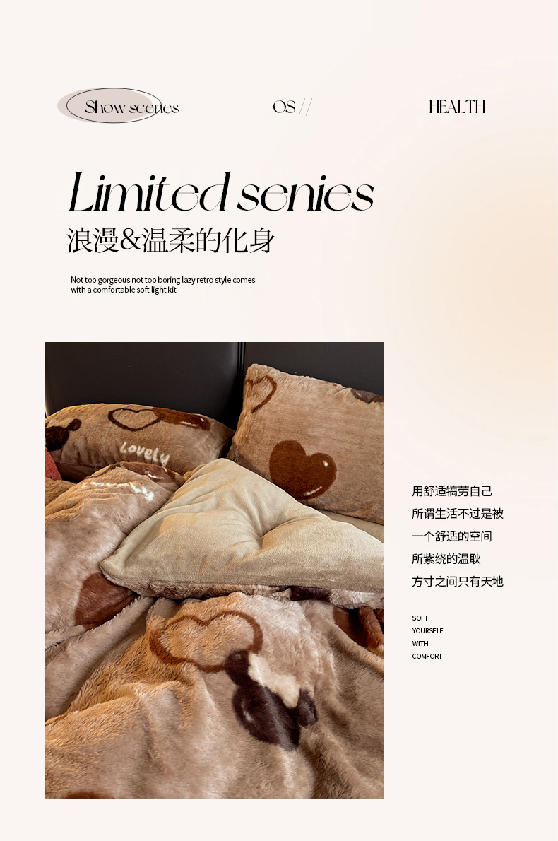 商品名称:金梦拉 2025直播爆款A类加厚兔绒印花系列四件套 可可爱心