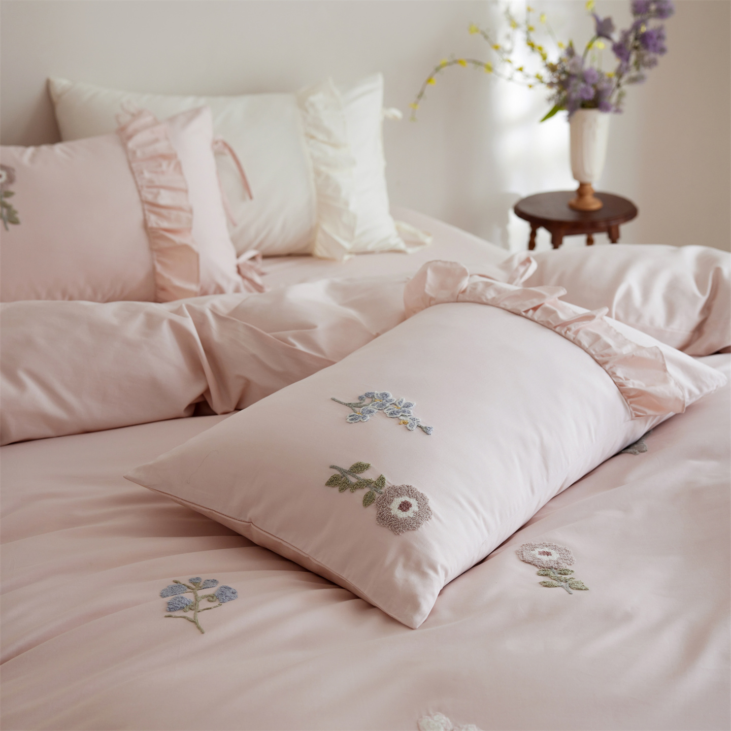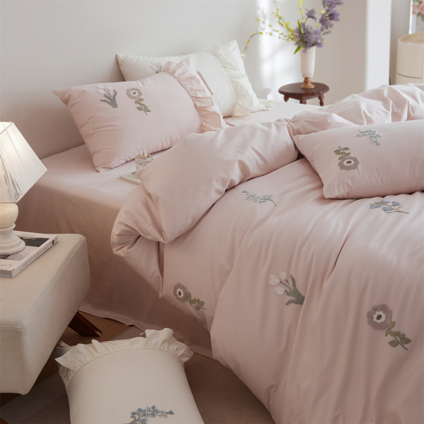 (总)初拾 2026新款贡缎全棉打褶“miu感”绣花四件套-欢乐颂(会员减20,控价 日常券后不低于368元),欢乐颂-钢琴白,欢乐颂-浅樱紫,欢乐颂-山茶粉,欢乐颂-星夜灰