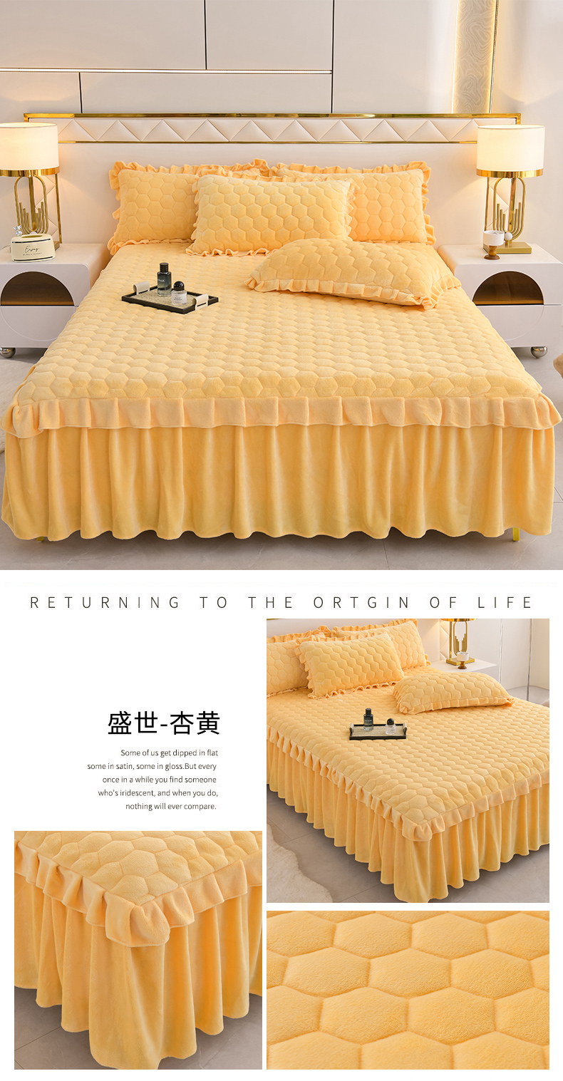 商品名称:优家居工厂店 2026新款纯色韩版花边牛奶绒夹棉床裙床罩加厚外贸直播 盛世-杏黄