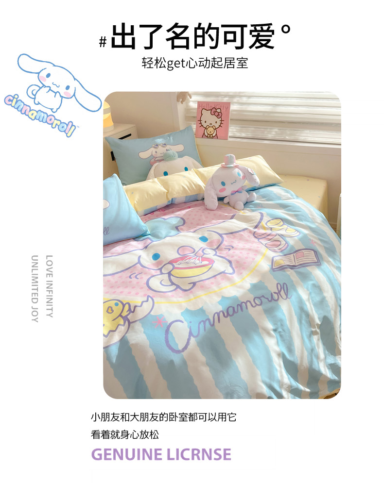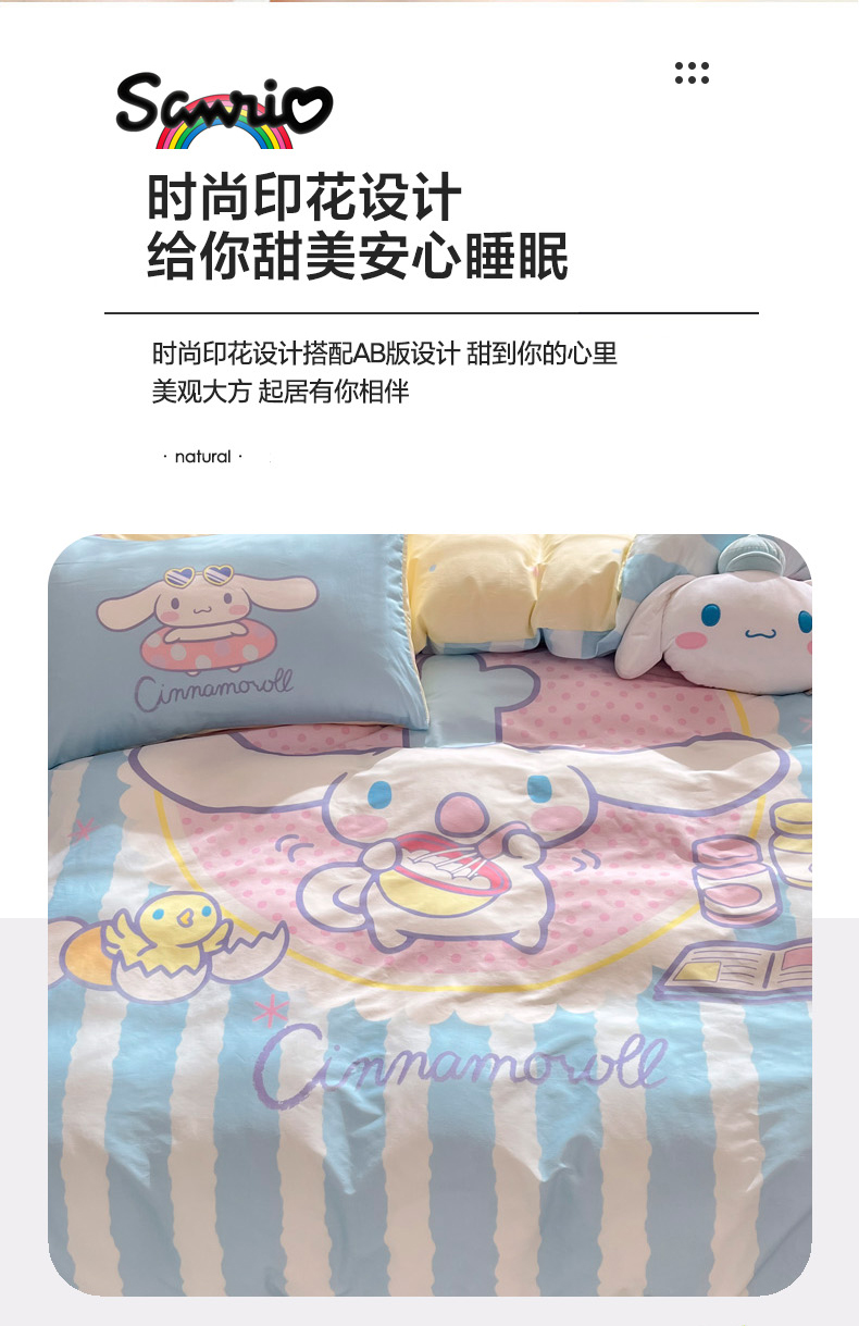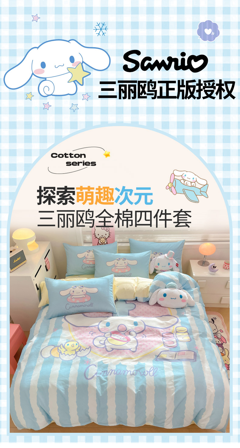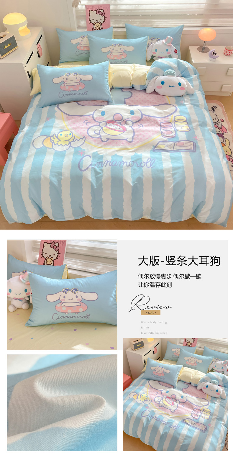 当前位置: 91家纺网 > 商品网购 > 床品套件 > 四件套 > 全棉普通四件套 > 暮思家居 2025新款正版授权三丽鸥大阪全棉数码印花纯棉四件套(第三批) 大版-竖条大耳狗