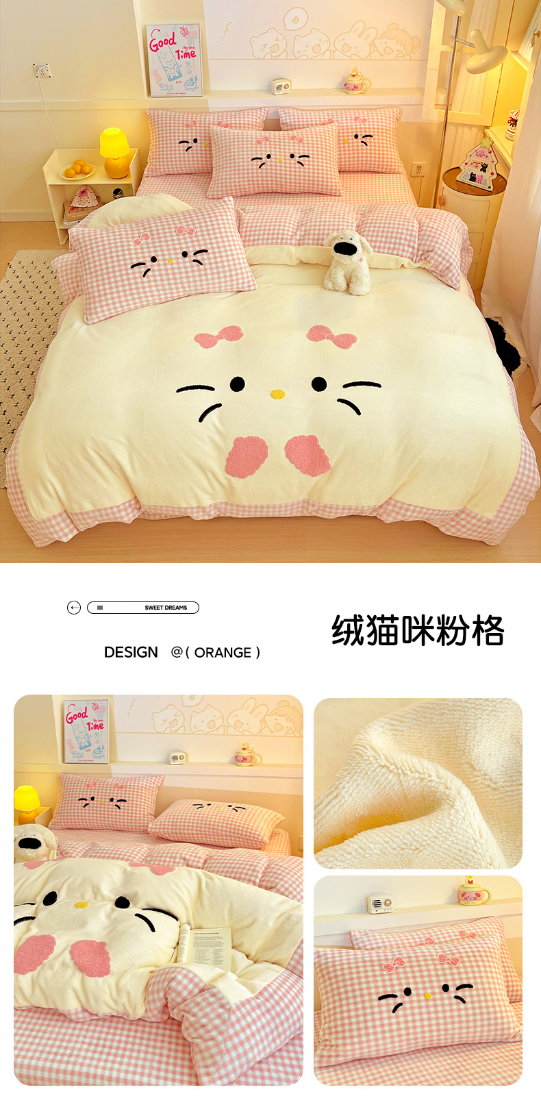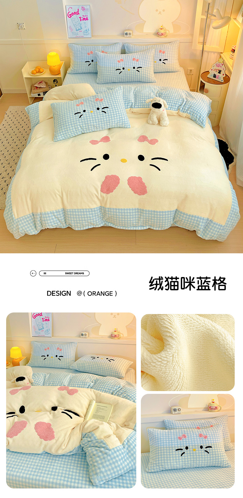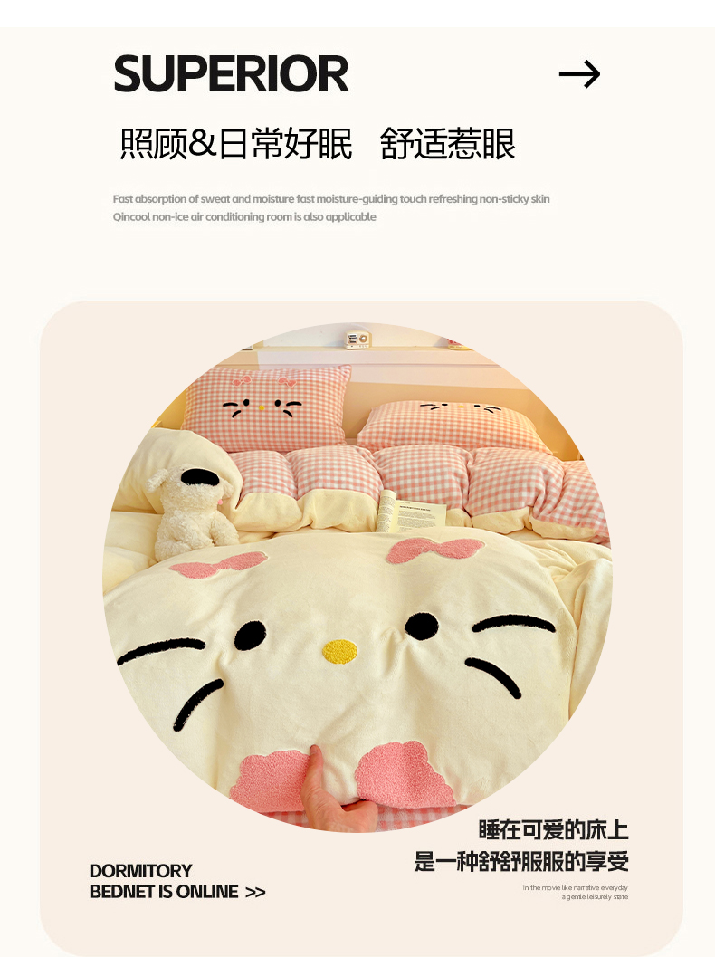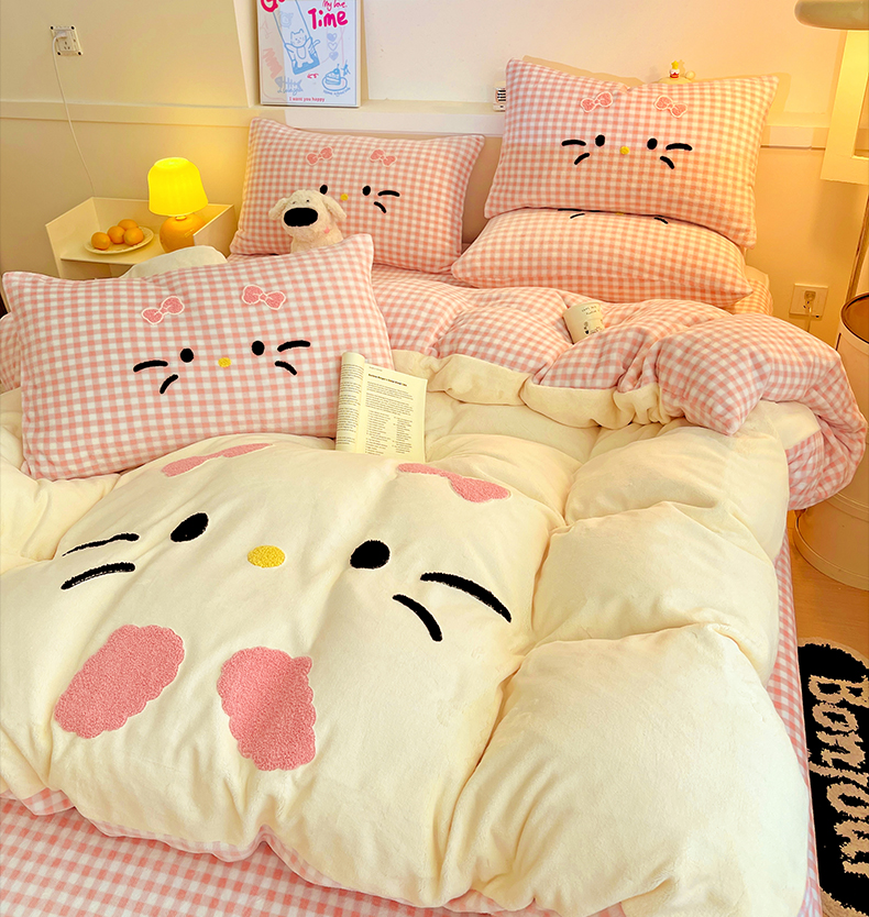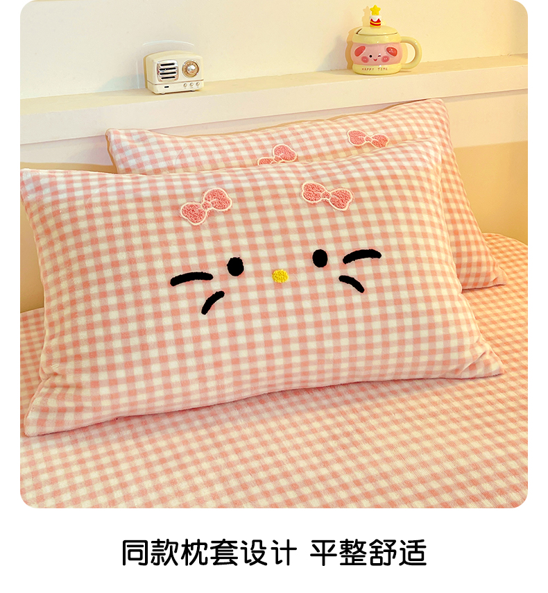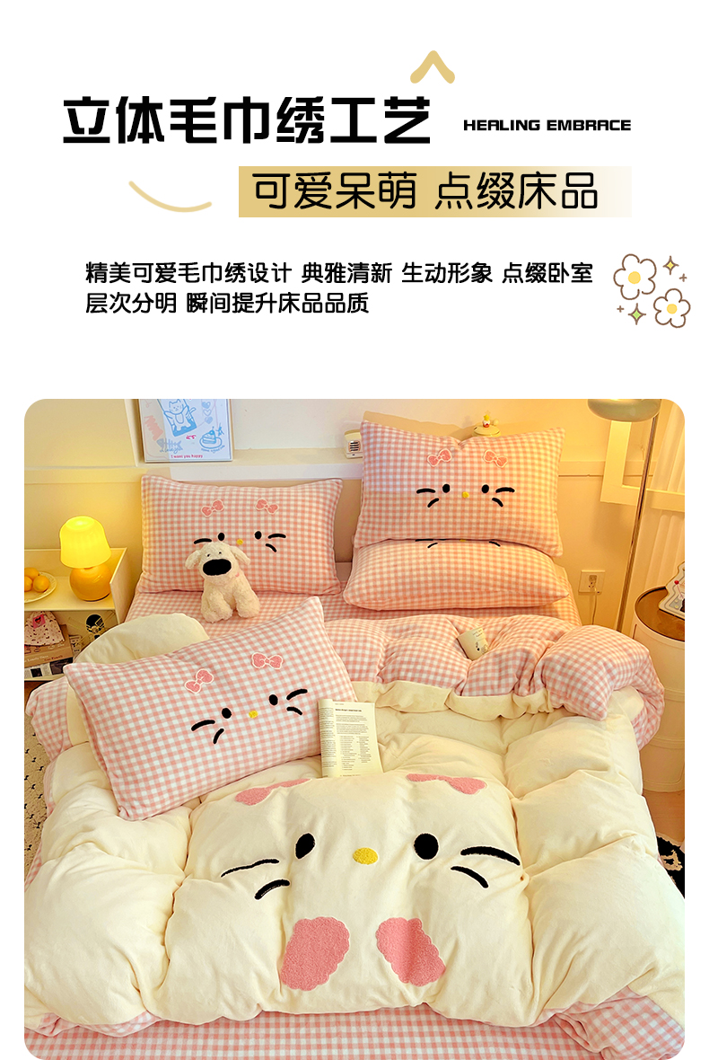 商品名称:富米莱(原臻工厂) 2025新款爆款拼角毛巾绣牛奶绒四件套 绒猫咪绿格