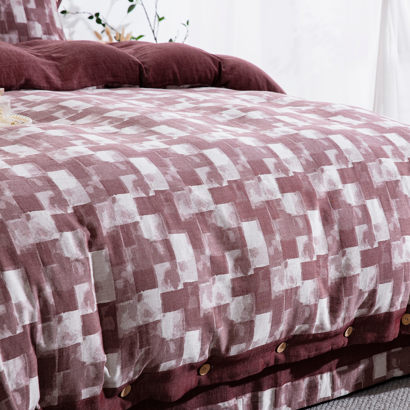 (总)双层纱家居 2025新款纯棉双层纱纽扣款四件套,春雨墨绿,凤尾花,黑茶,红石榴,蝴蝶粉,蝴蝶紫,花絮黄,花絮蓝,流金岁月粉灰,流金岁月紫,陌上花开深蓝,牡丹深紫,牡丹夕颜紫红,秋雨墨绿,亭亭玉立,雾里看花墨蓝,新款薰衣草,新龙凤呈祥,一帆风顺灰,羽毛桔,织梦粉,织梦水墨,织梦紫罗兰