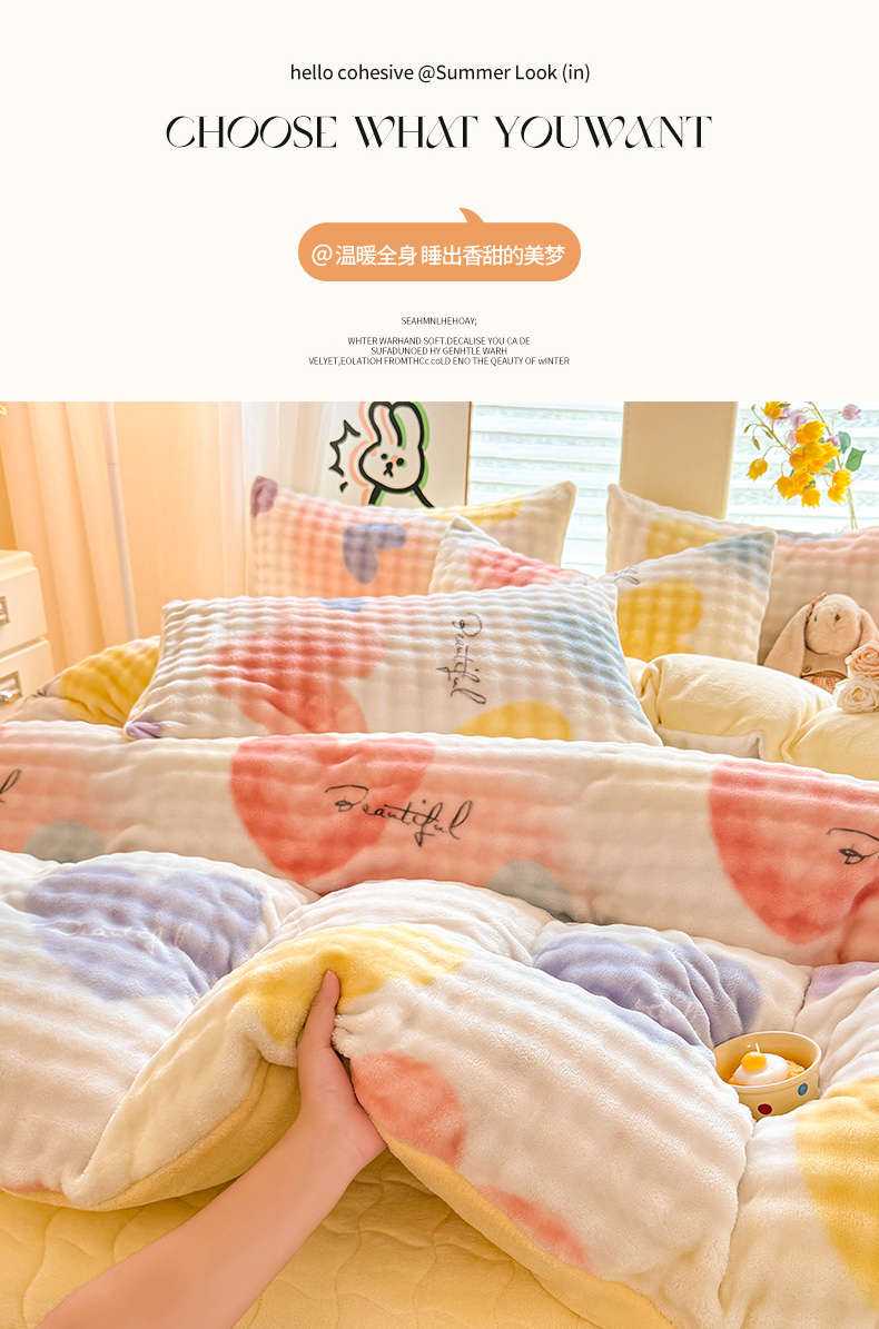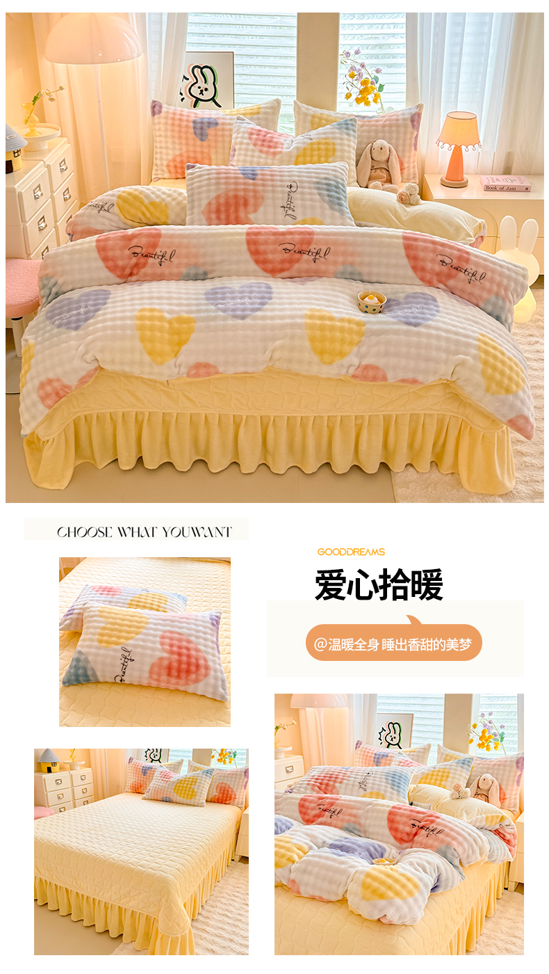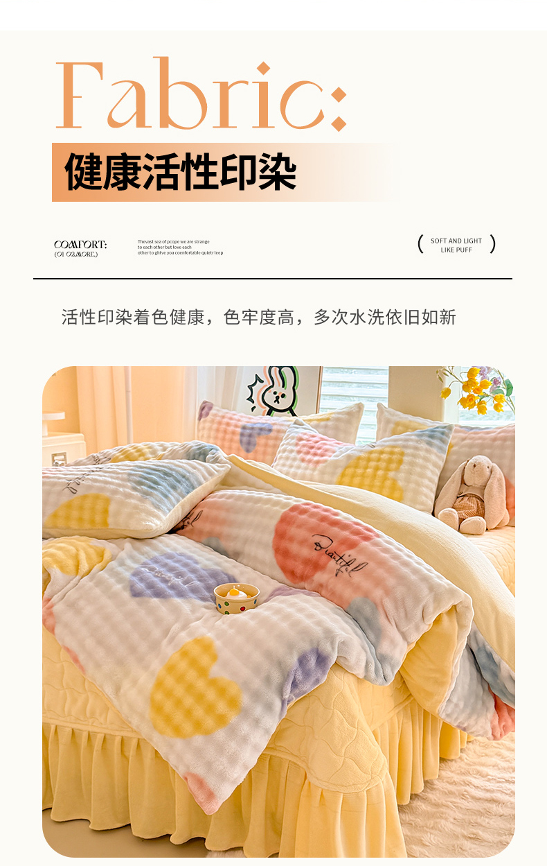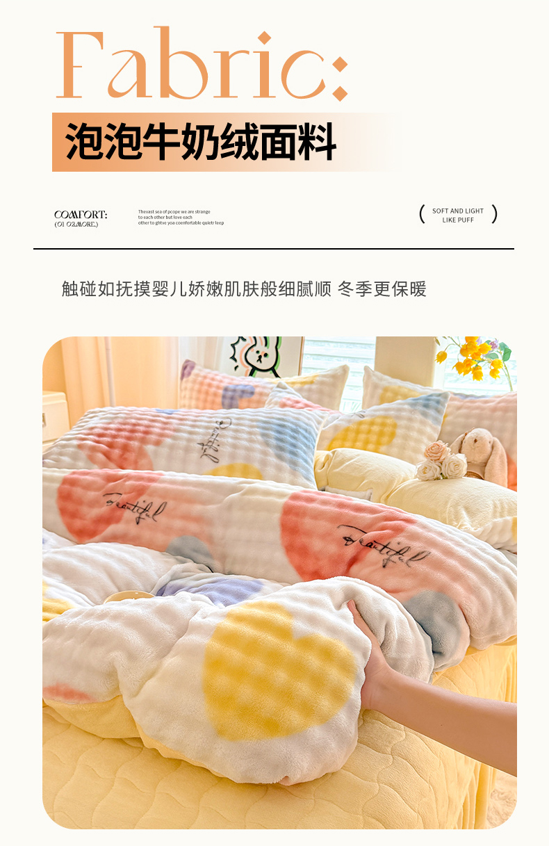 当前位置: 91家纺网 > 商品网购 > 床品套件 > 四件套 > 牛奶绒四件套 > 金盛皇朝家纺 2025新款高克重仿兔毛泡泡牛奶绒床单床盖单件三件四件套 爱心拾暖