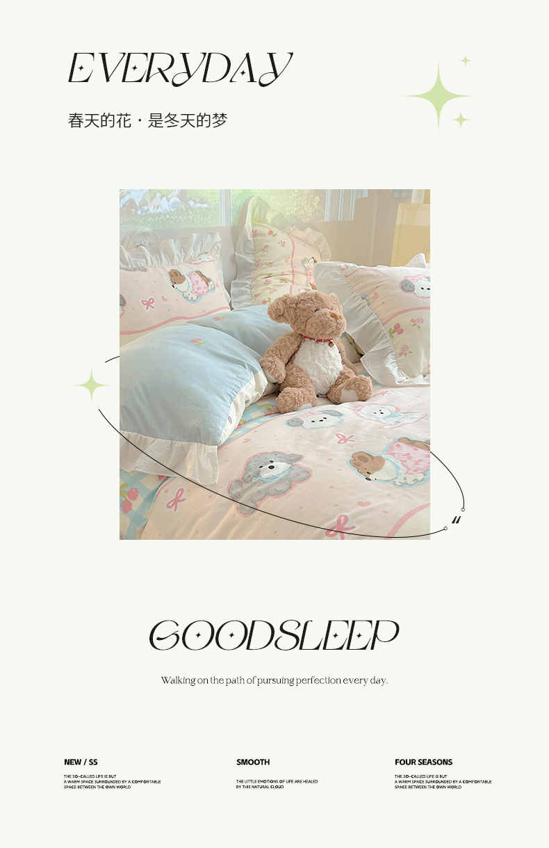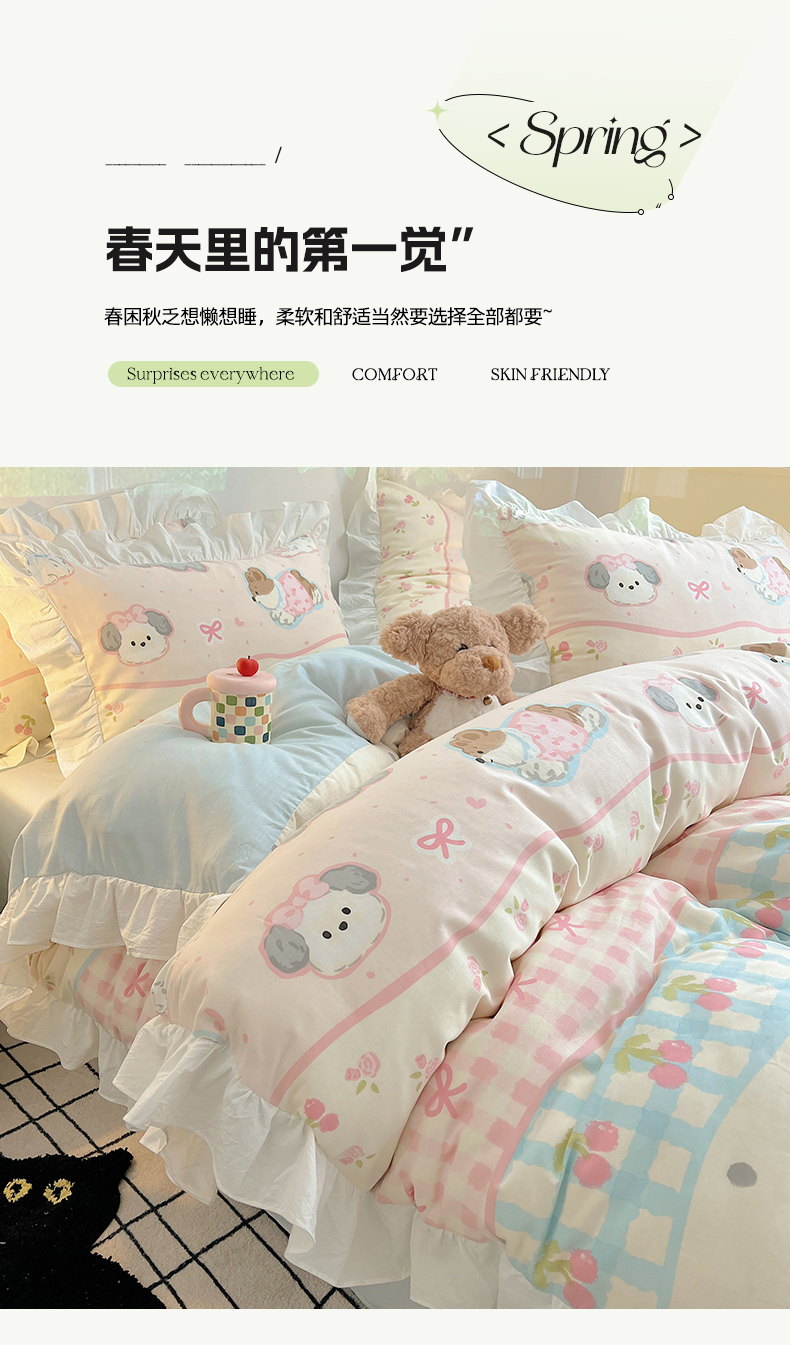 六巷胡同 2026春夏新款韩式INS减龄花边款全棉卡通四件套 花边洋气柯基崽