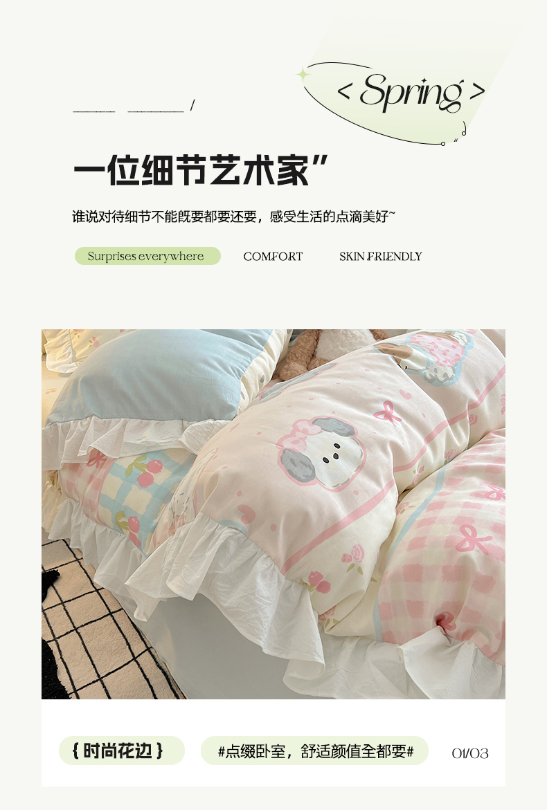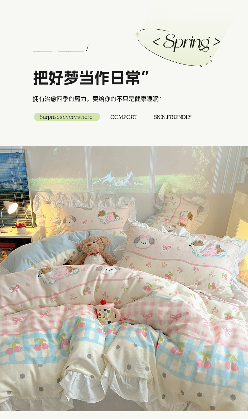 商品名称:六巷胡同 2026春夏新款韩式INS减龄花边款全棉卡通四件套 花边洋气柯基崽