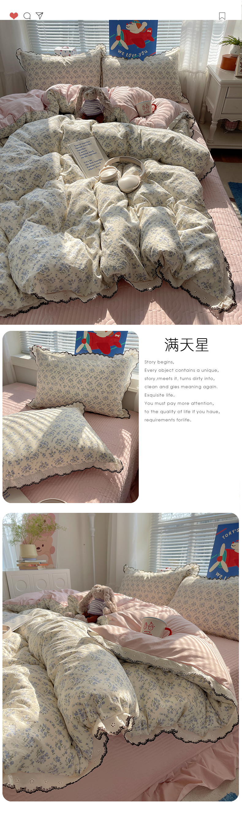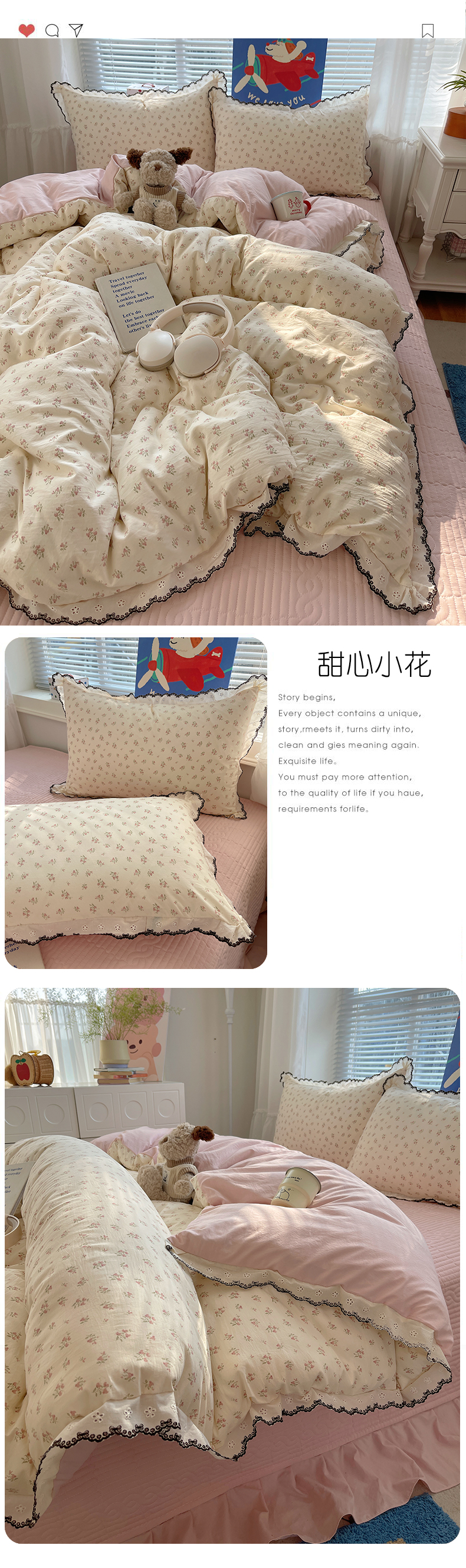 当前位置: 91家纺网 > 商品网购 > 床品套件 > 四件套 > 其它四件套 > 花漾家居 2026小红书推荐款小清新刺绣花边款床单床盖款四件套新款 甜心花径