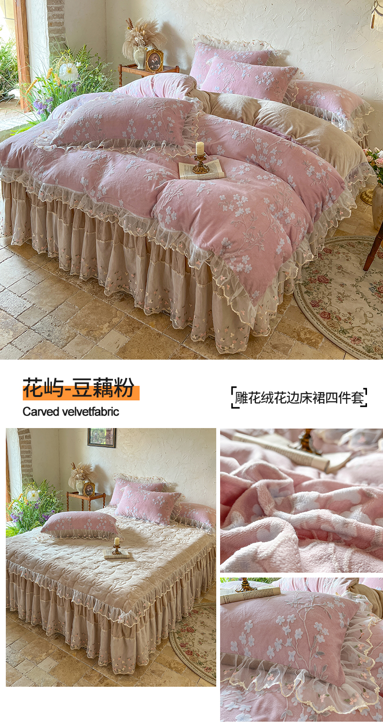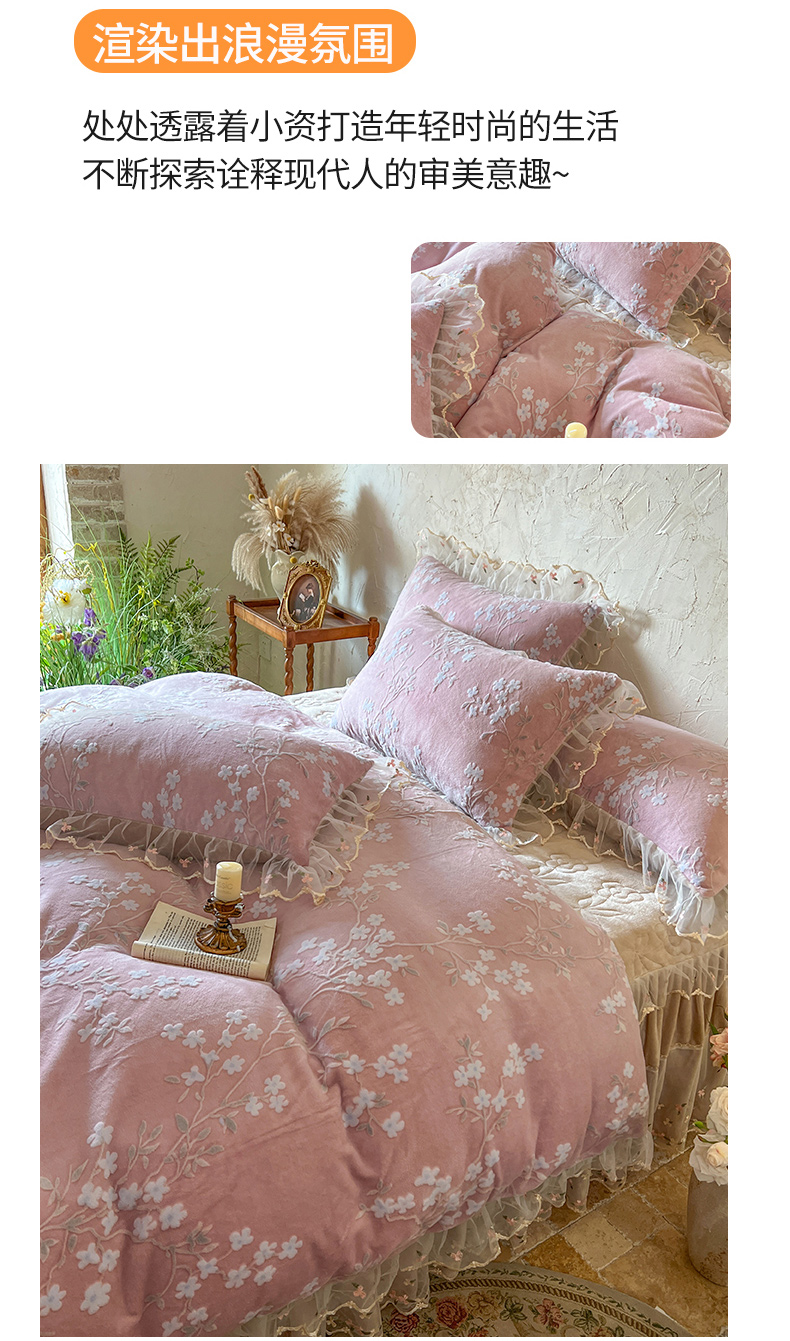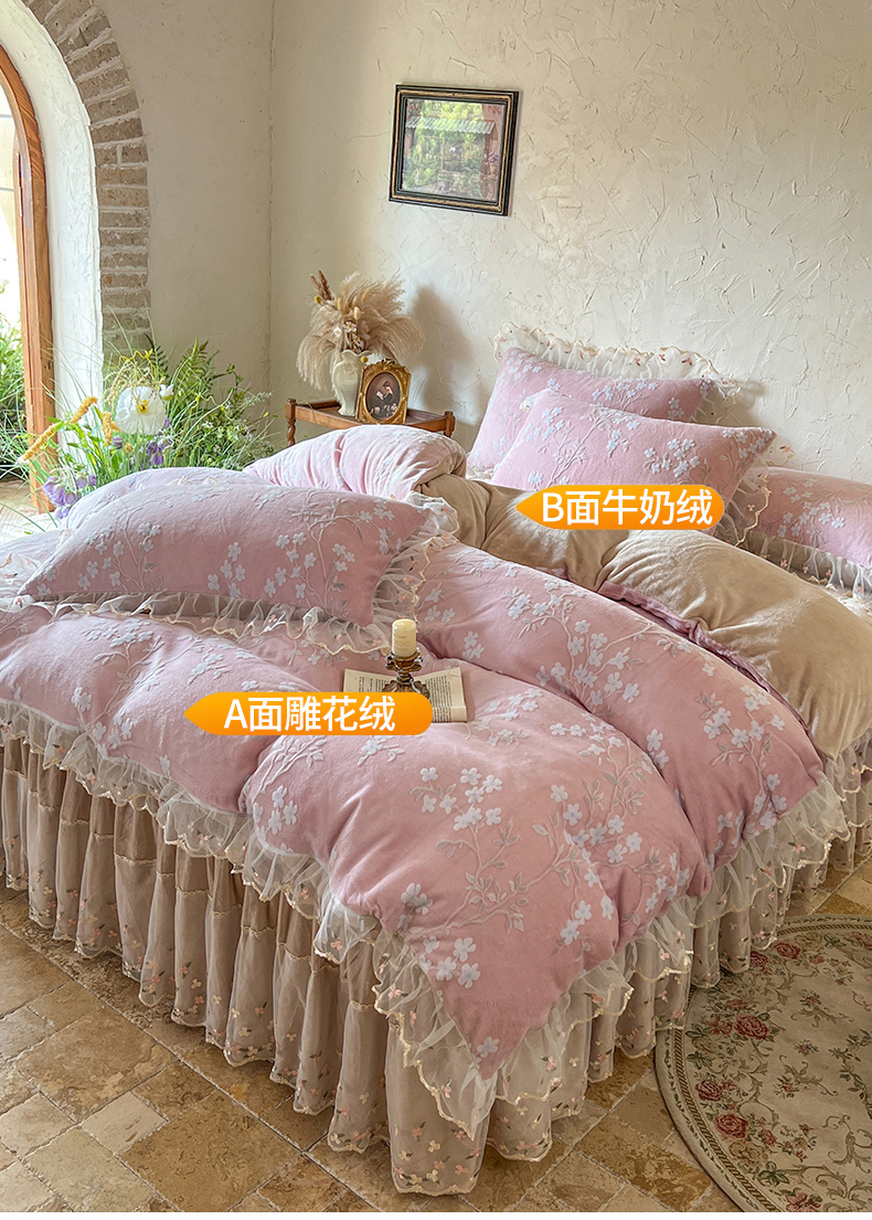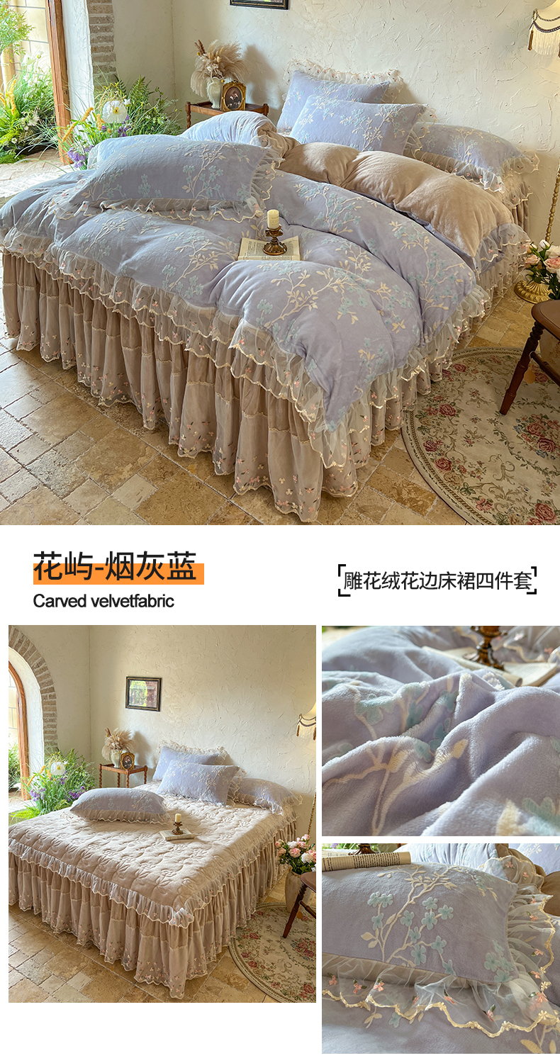 当前位置: 91家纺网 > 商品网购 > 床品套件 > 四件套 > 雕花绒四件套 > (总)麒豆豆 2024新款高克重雕花绒牛奶绒四件套花边床裙款-花屿