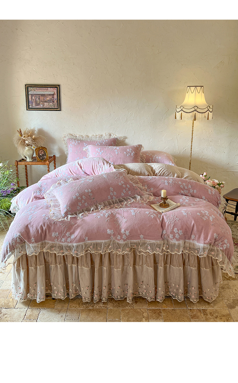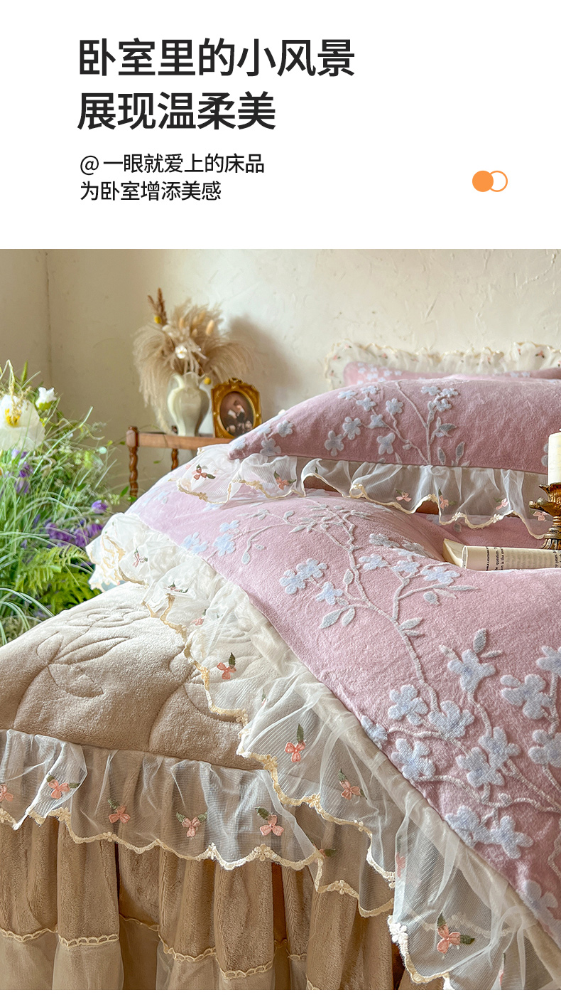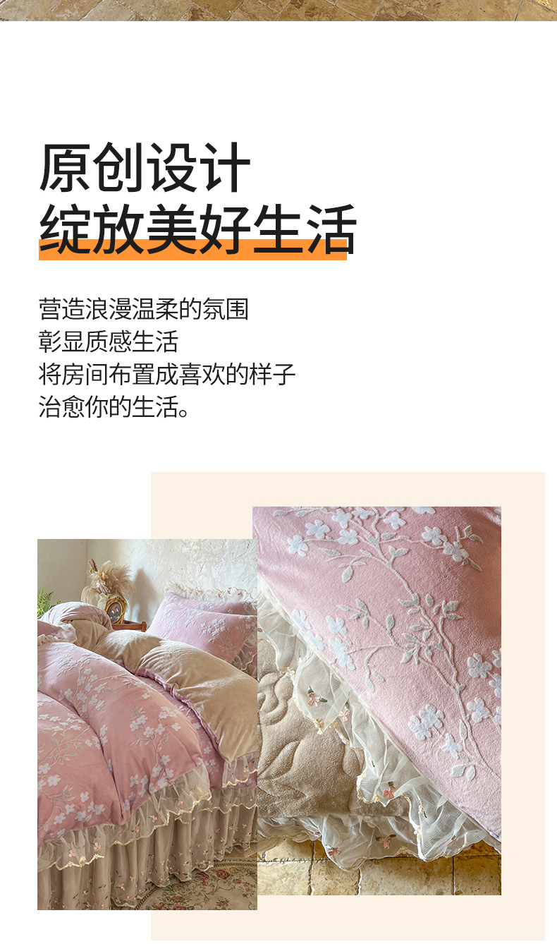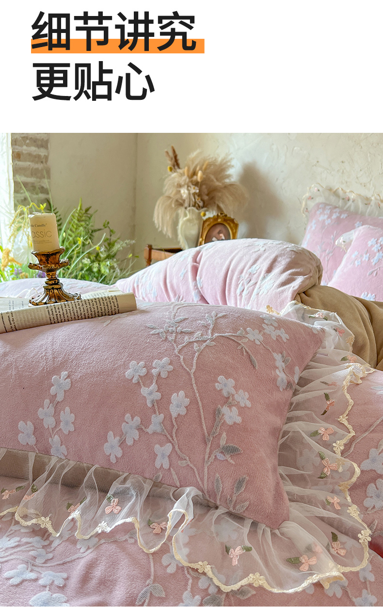 当前位置: 91家纺网 > 商品网购 > 床品套件 > 四件套 > 雕花绒四件套 > (总)麒豆豆 2024新款高克重雕花绒牛奶绒四件套花边床裙款-花屿