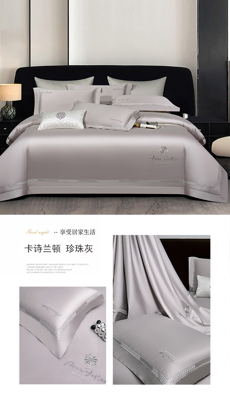 商品名称:诗黛尔 2025春夏新款长绒棉刺绣卡诗兰顿系列四件套 卡诗兰顿-珍珠灰