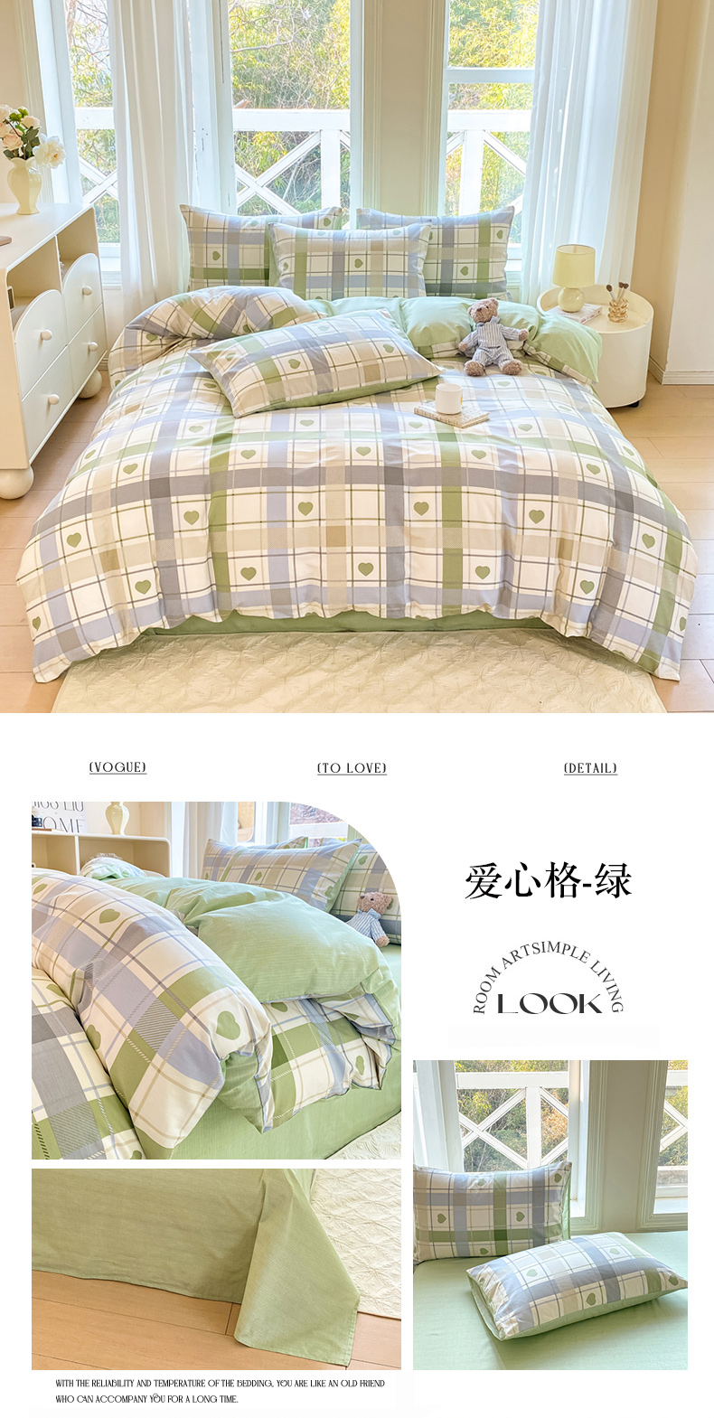 商品名称:念家居 2025新款直播爆款三件套印花小清新13070全棉四件套 爱心格-绿