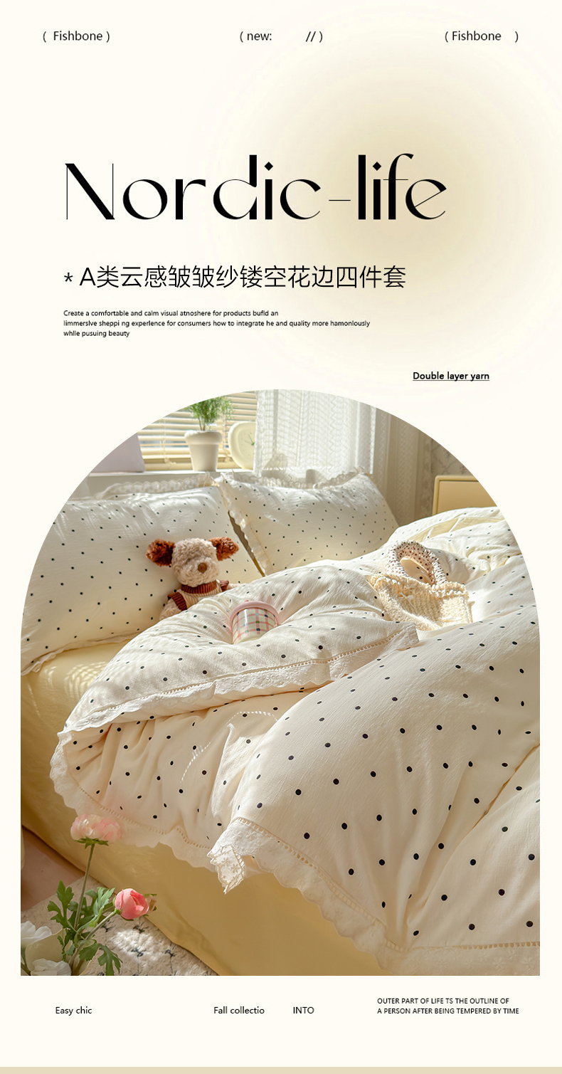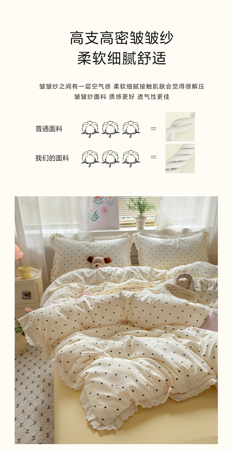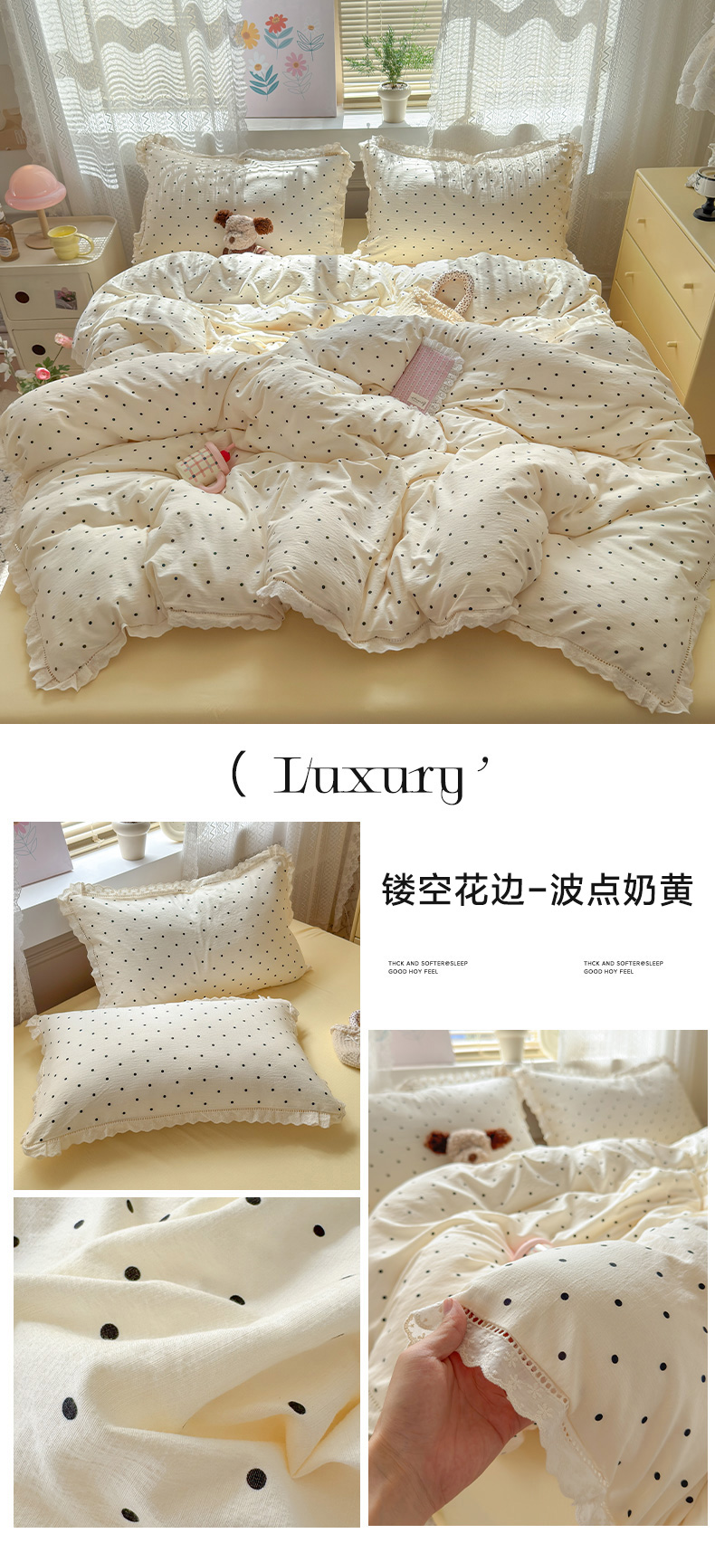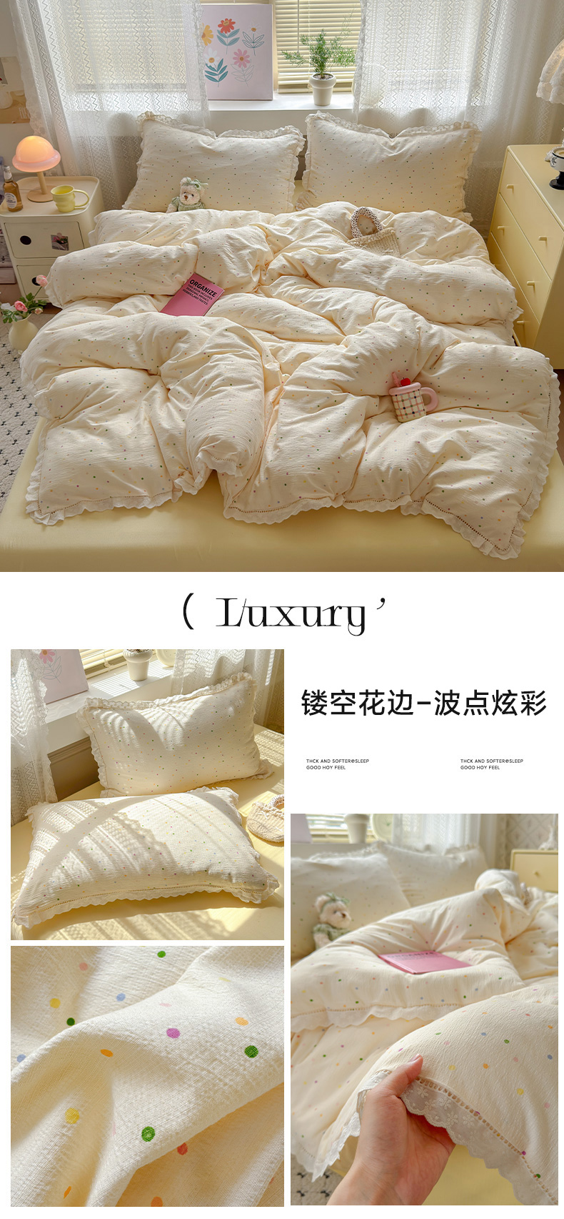 当前位置: 91家纺网 > 商品网购 > 床品套件 > 四件套 > 其它四件套 > 喜颜 2025新款爆款云感提花皱皱纱全棉镂空花边四件套学生宿舍三件套 镂空花边-波点奶黄