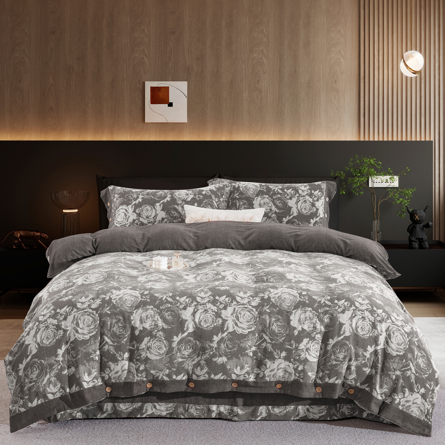 商品名称:双层纱家居 2025新款全棉色织提花四件套-玫瑰庄园 玫瑰庄园-灰