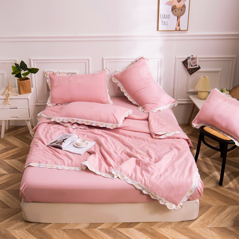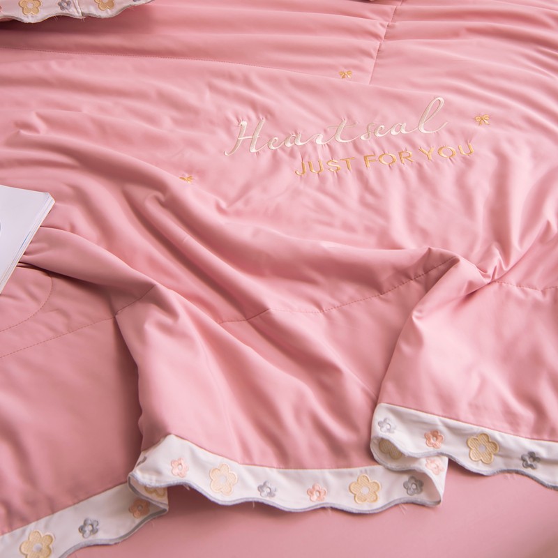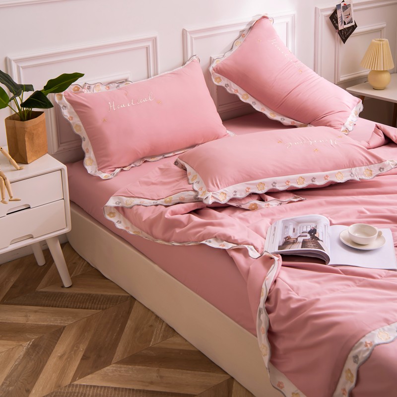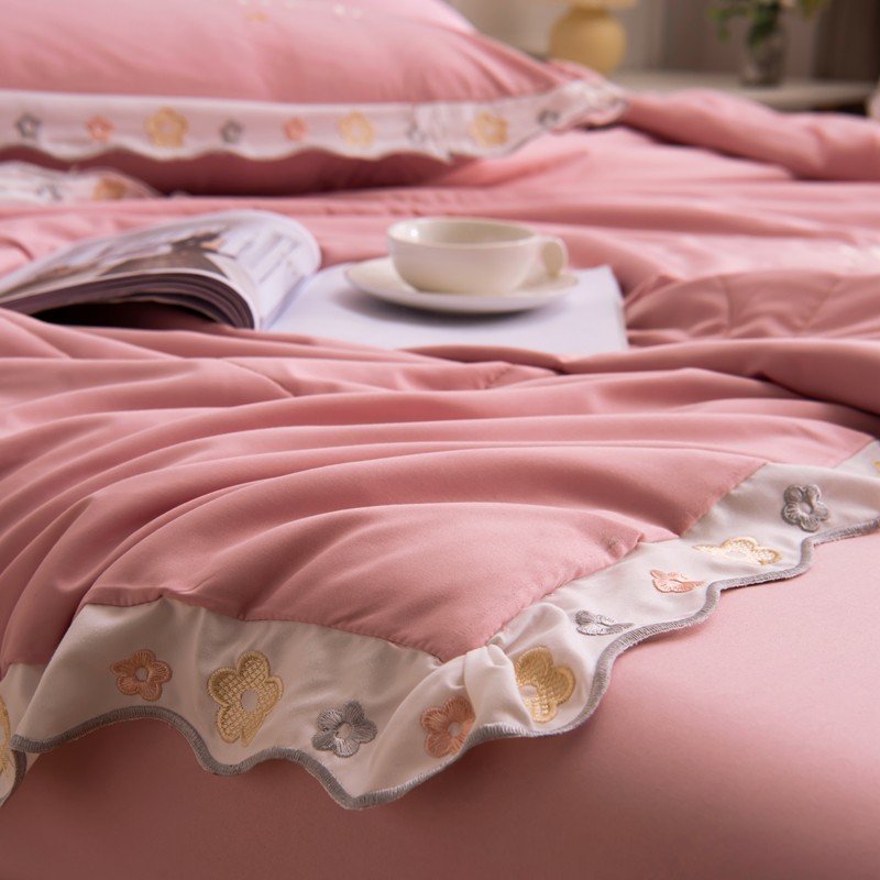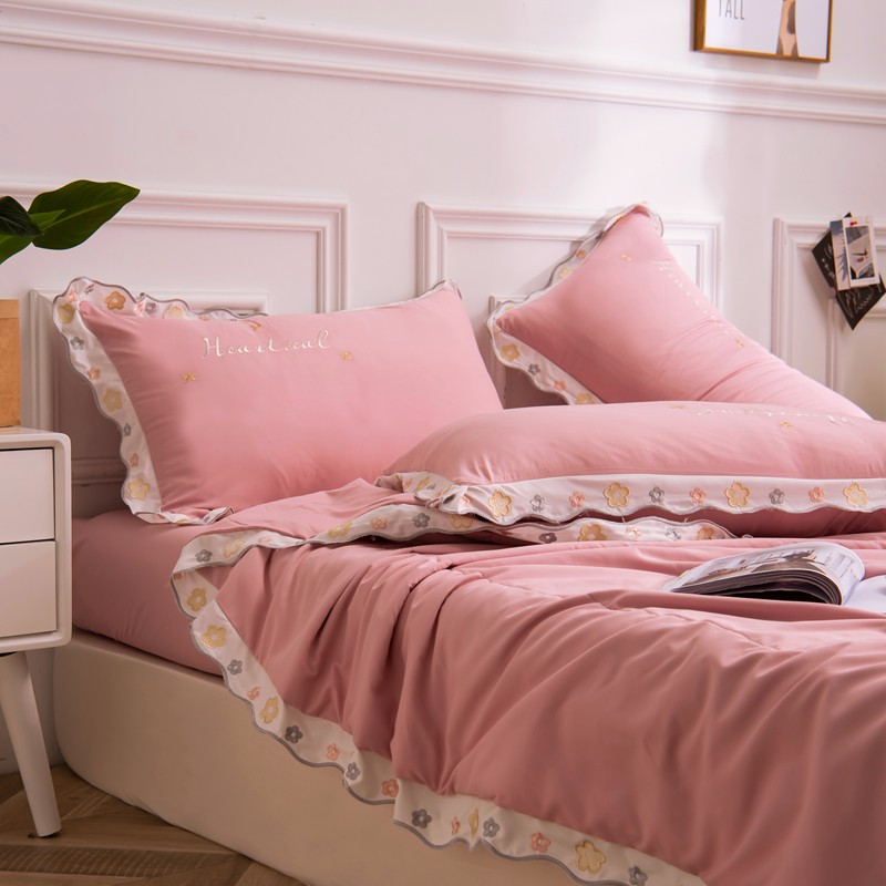 安妮家居 2021新款泫雅风水洗刺绣夏被四件套 少女粉
