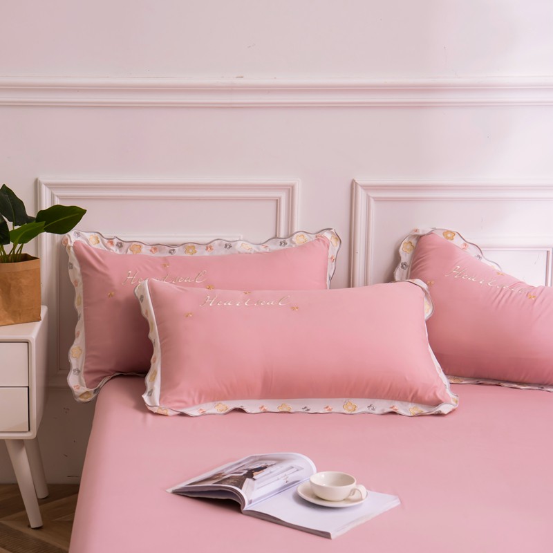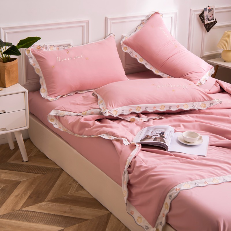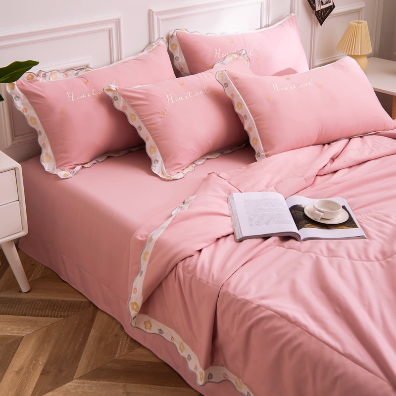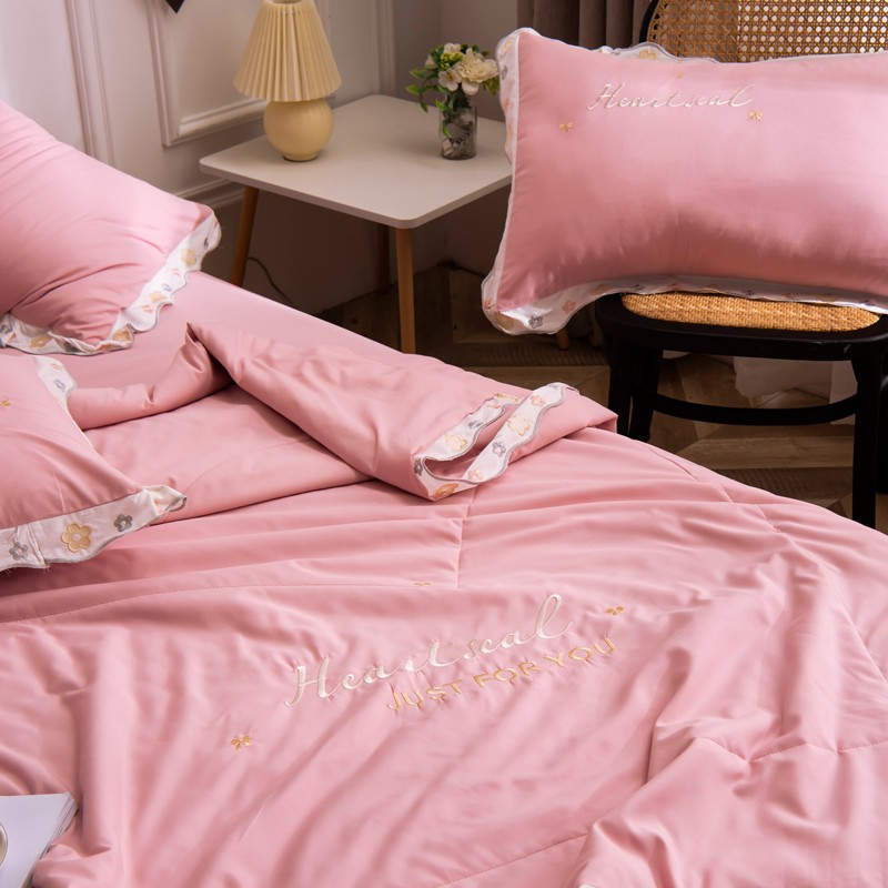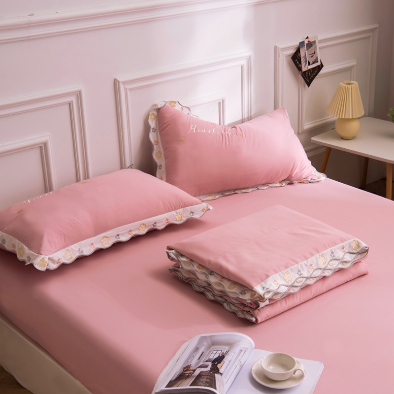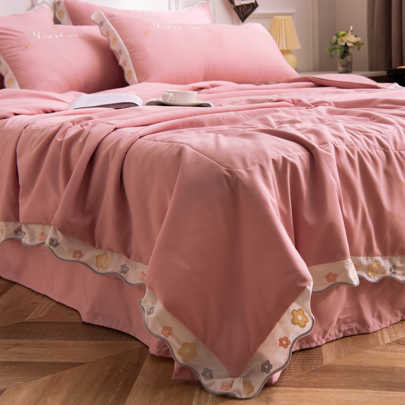 安妮家居 2021新款泫雅风水洗刺绣夏被四件套 少女粉