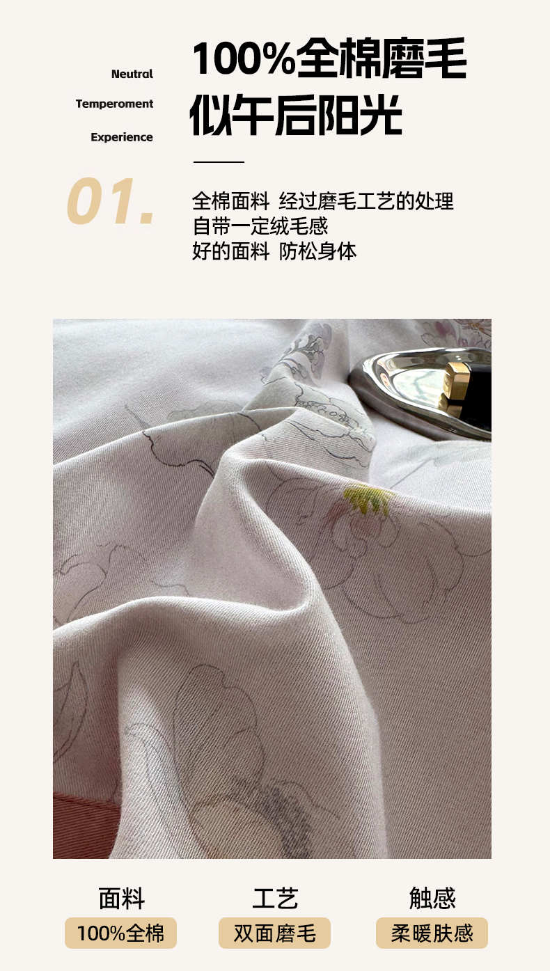 朵希曼 2026新款全棉大宽边拼角磨毛四件套 回眸一笑米