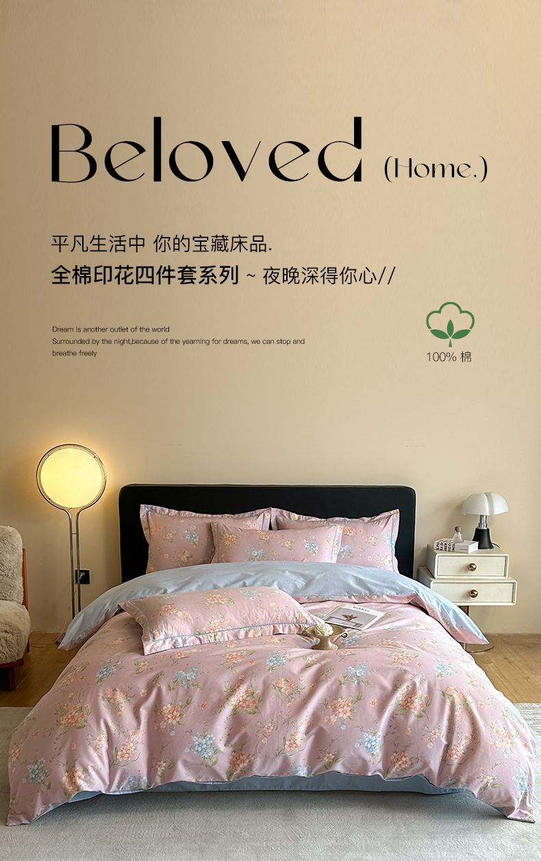 商品名称:格里芬家纺 2025新款全棉四件套13376纯棉印花四件套 蜜朵-豆沙