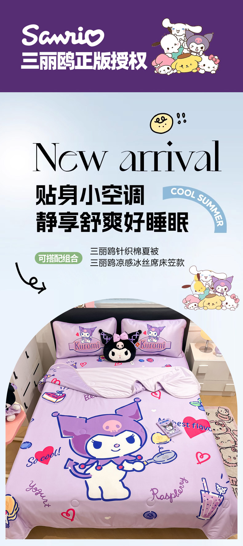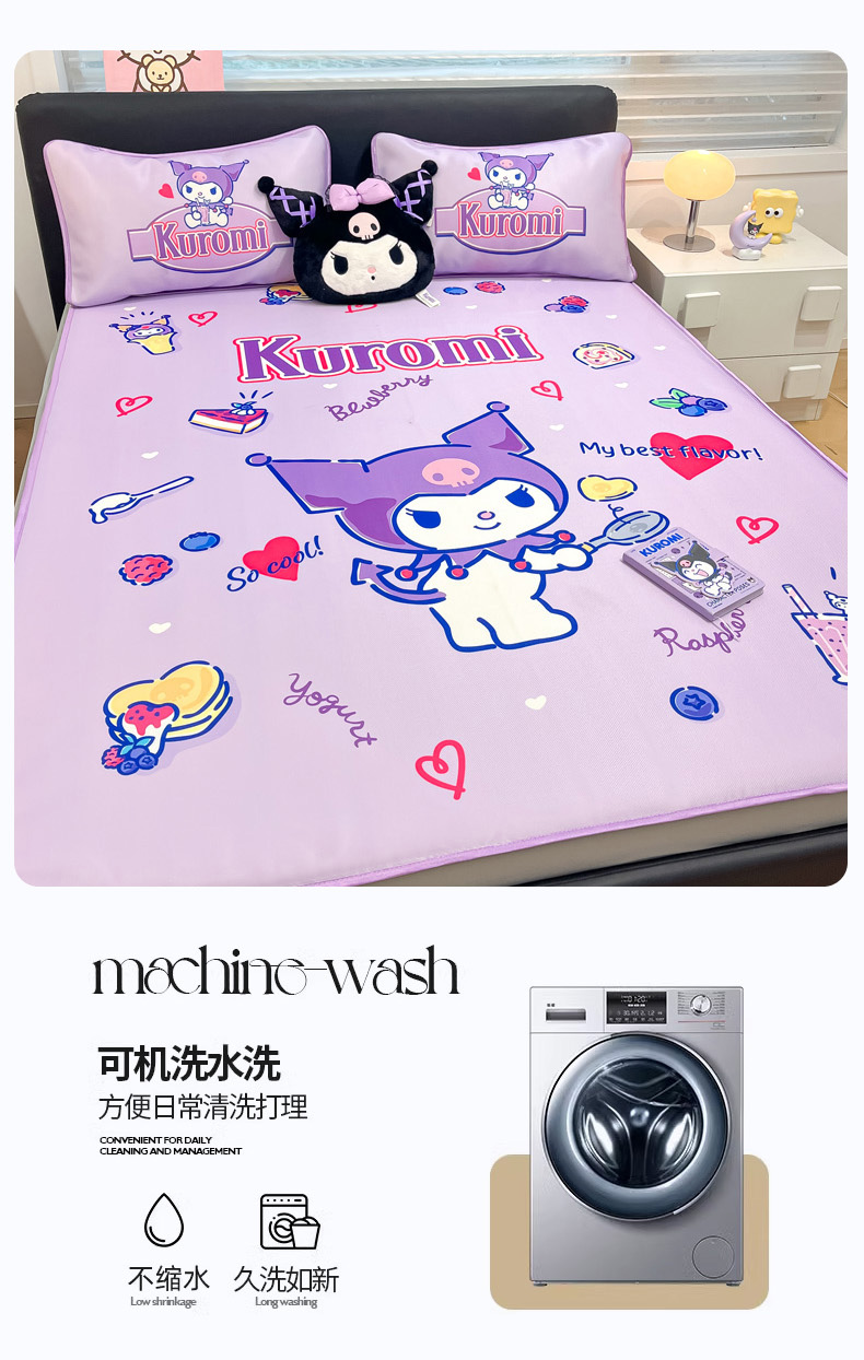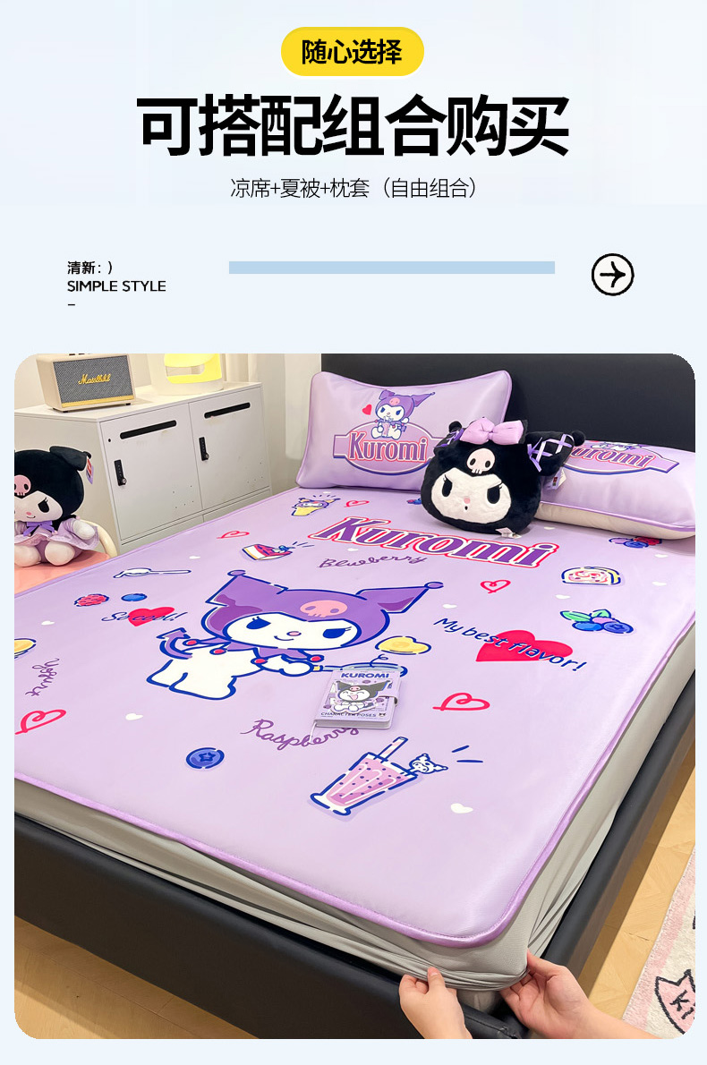 当前位置: 91家纺网 > 商品网购 > 床上用品 > 凉席 > 暮思家居 2025新款正版授权A类大版数码印花三丽鸥可机洗1200D冰丝凉席可组合针织棉夏被四件套床笠款 床笠款-蓝莓库洛米