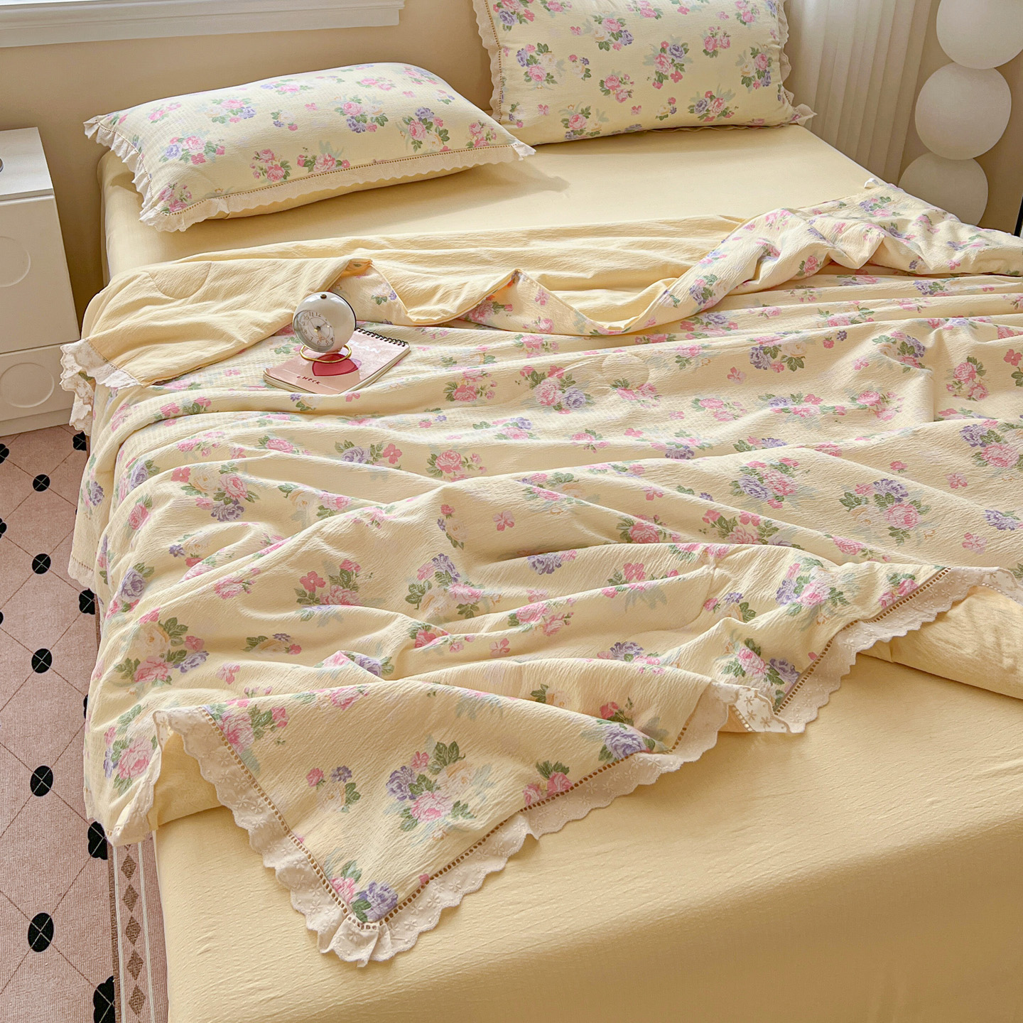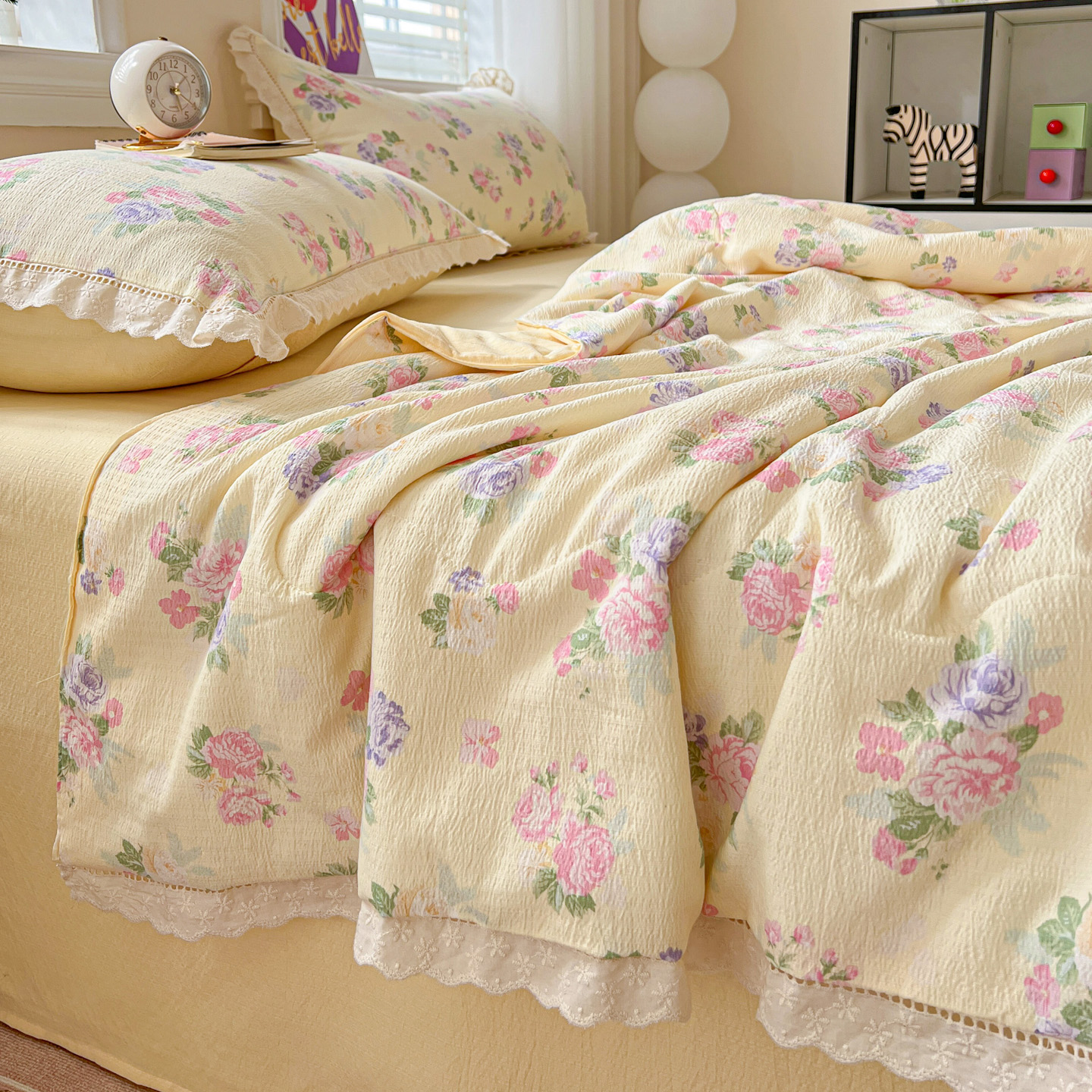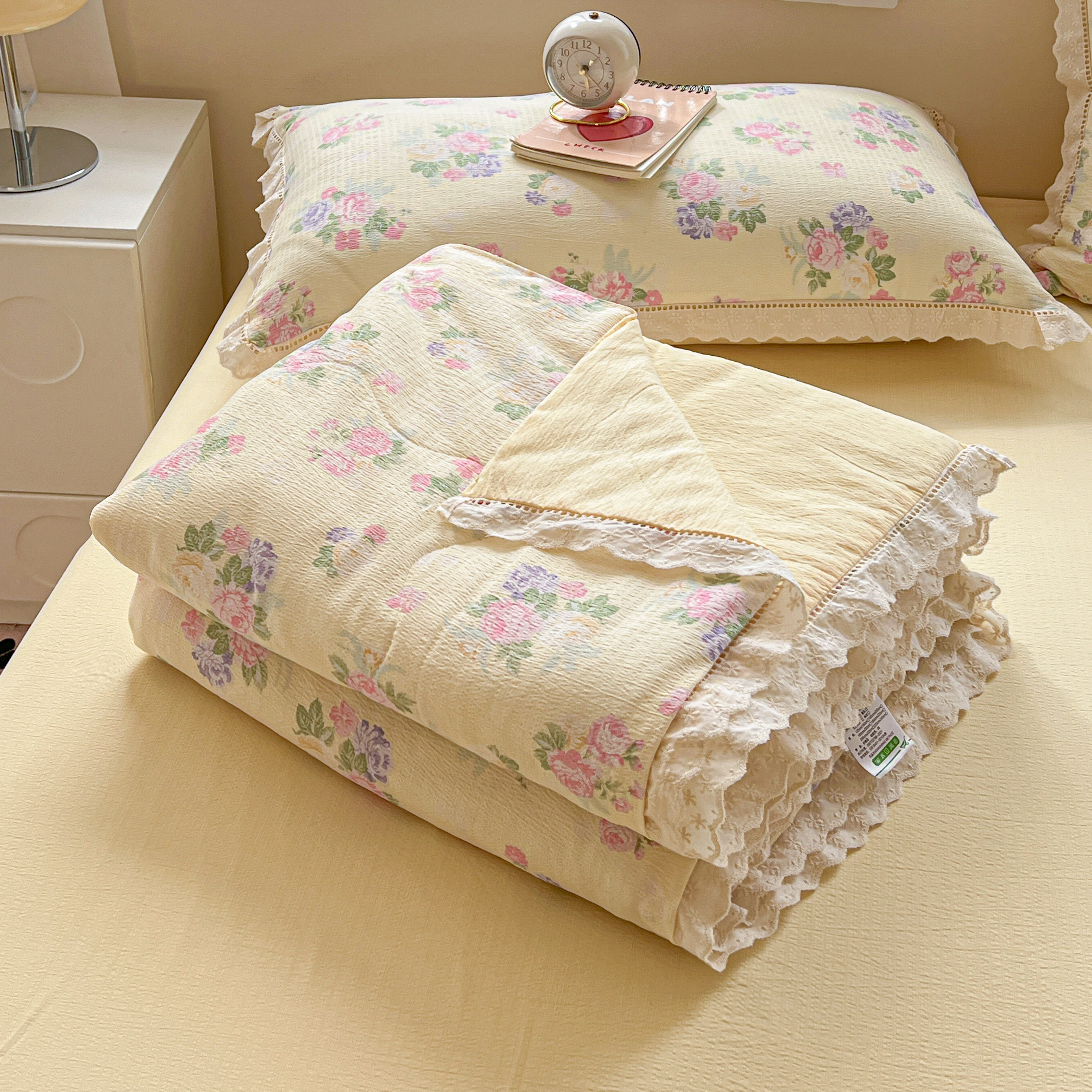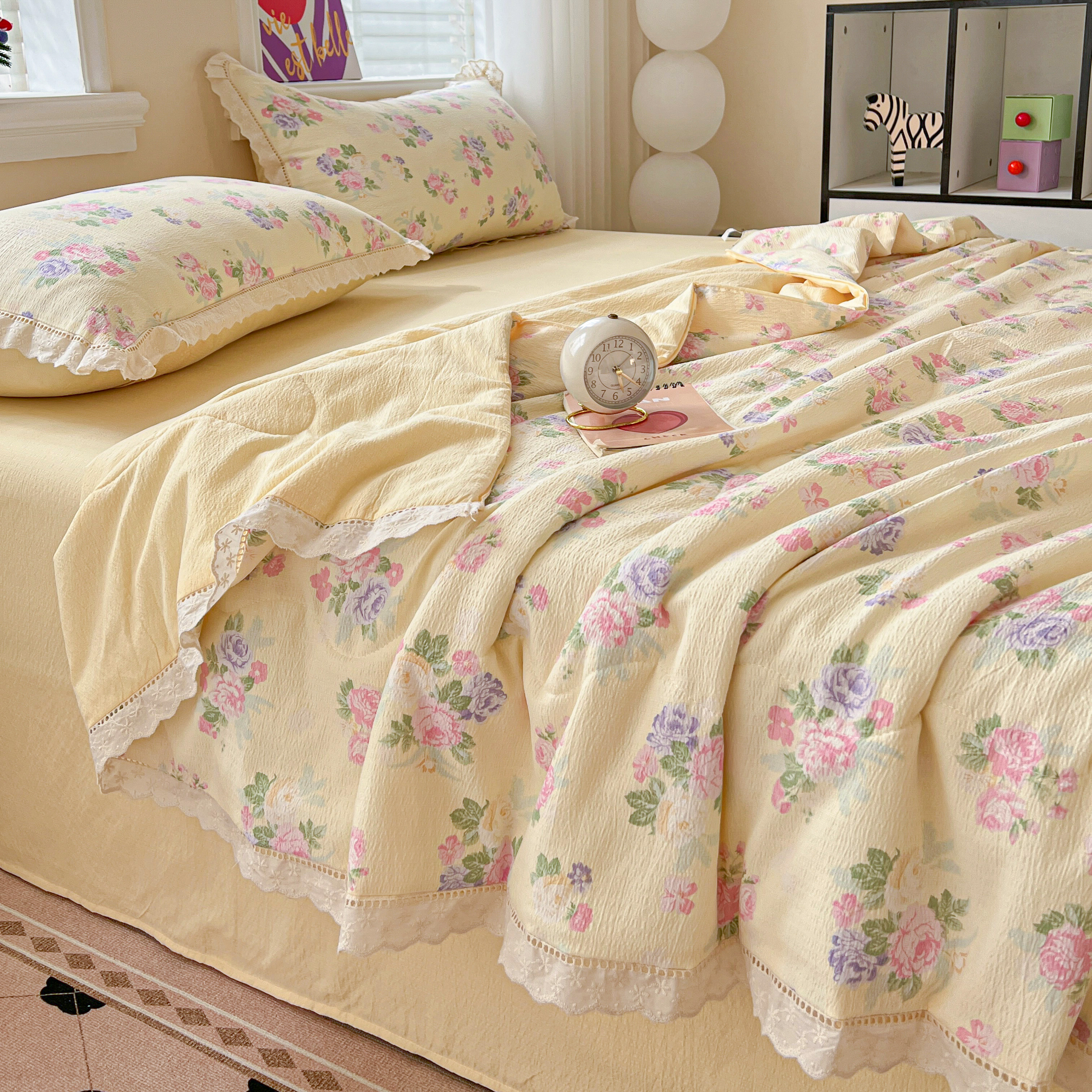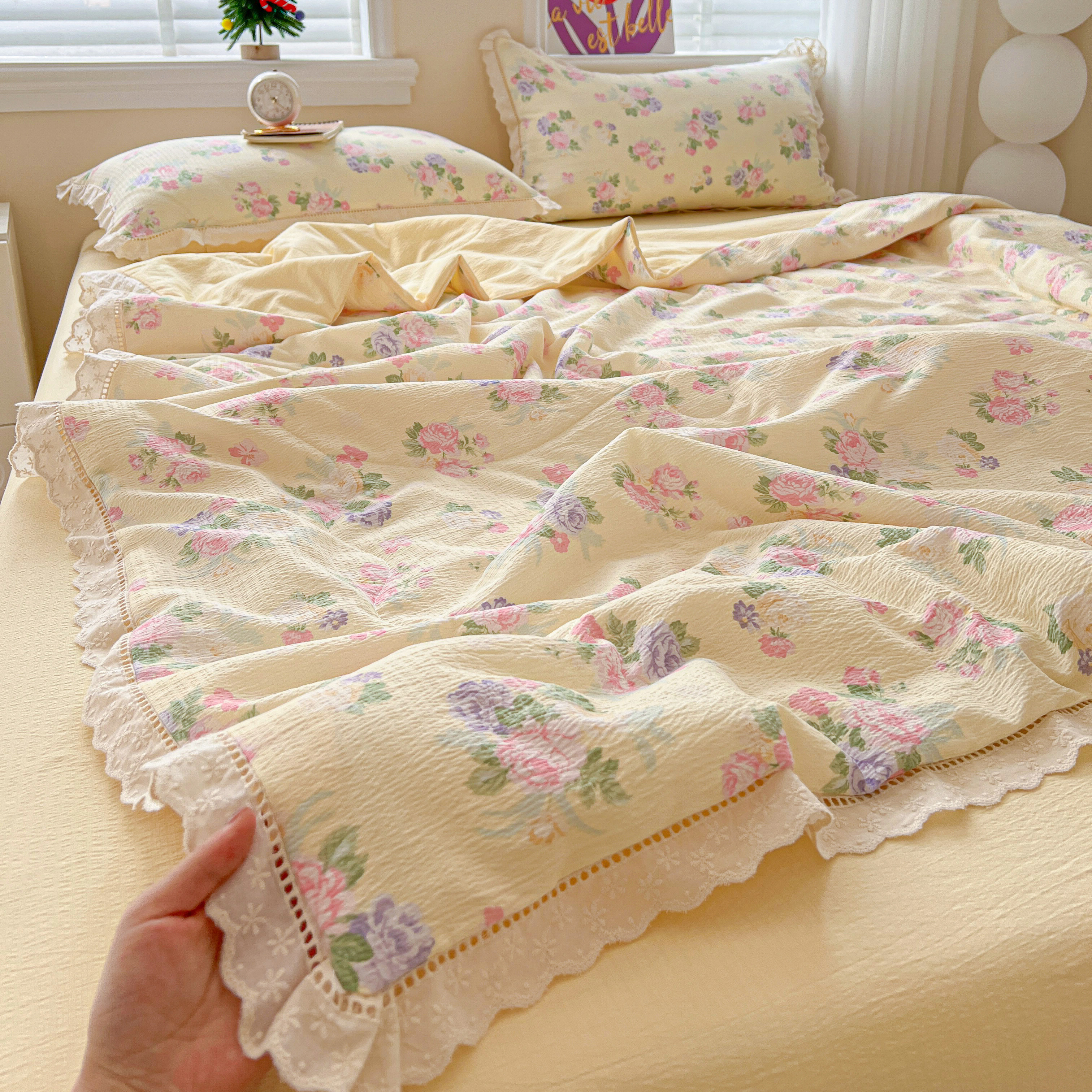 商品名称:2025新款云感皱皱纱全棉花边款夏被四件套 缤纷几何