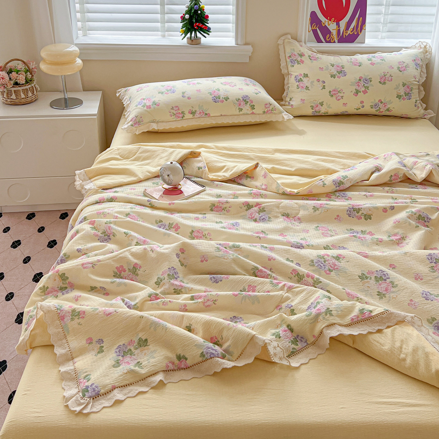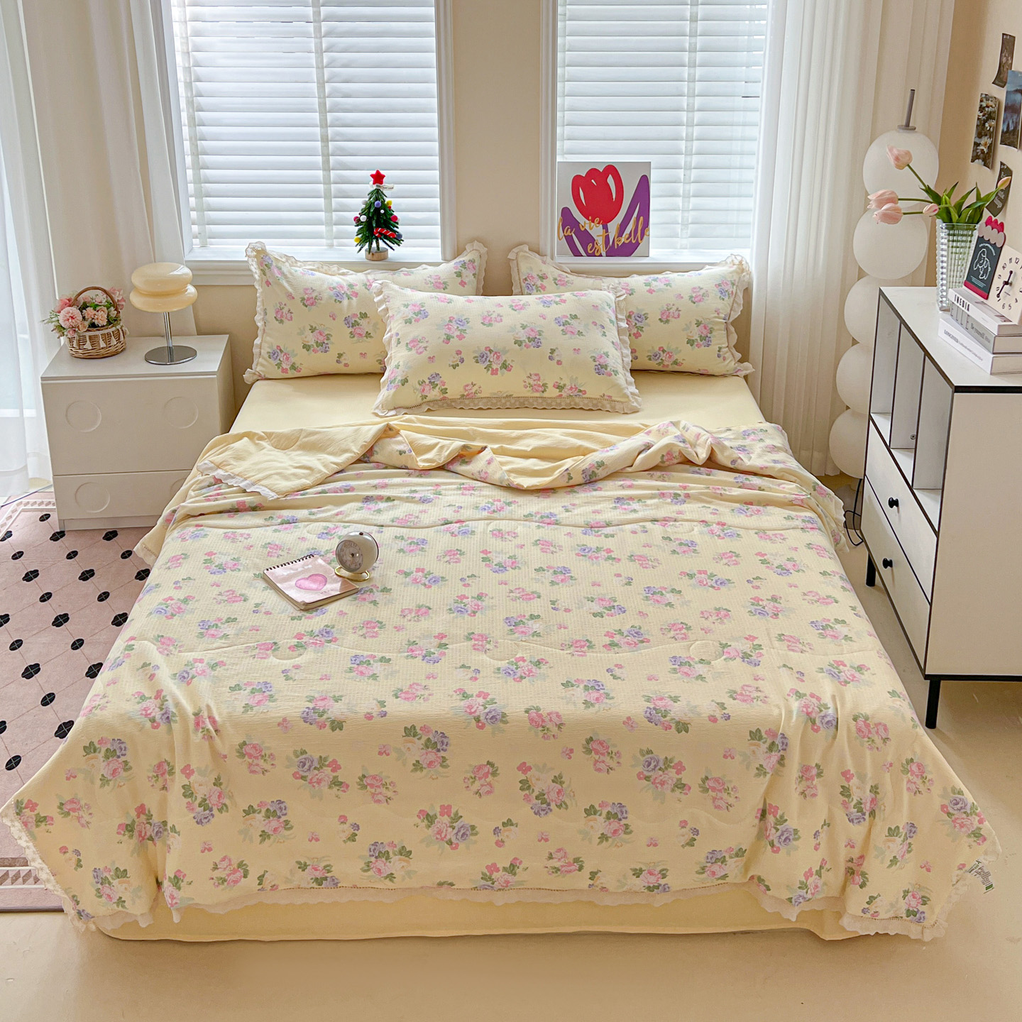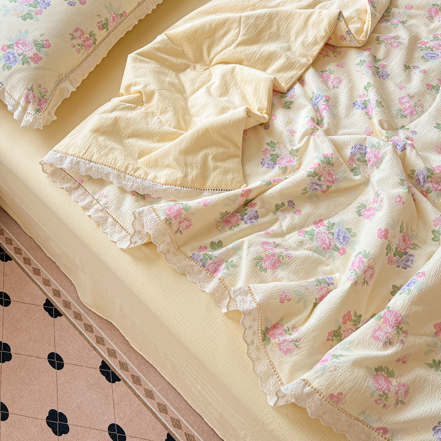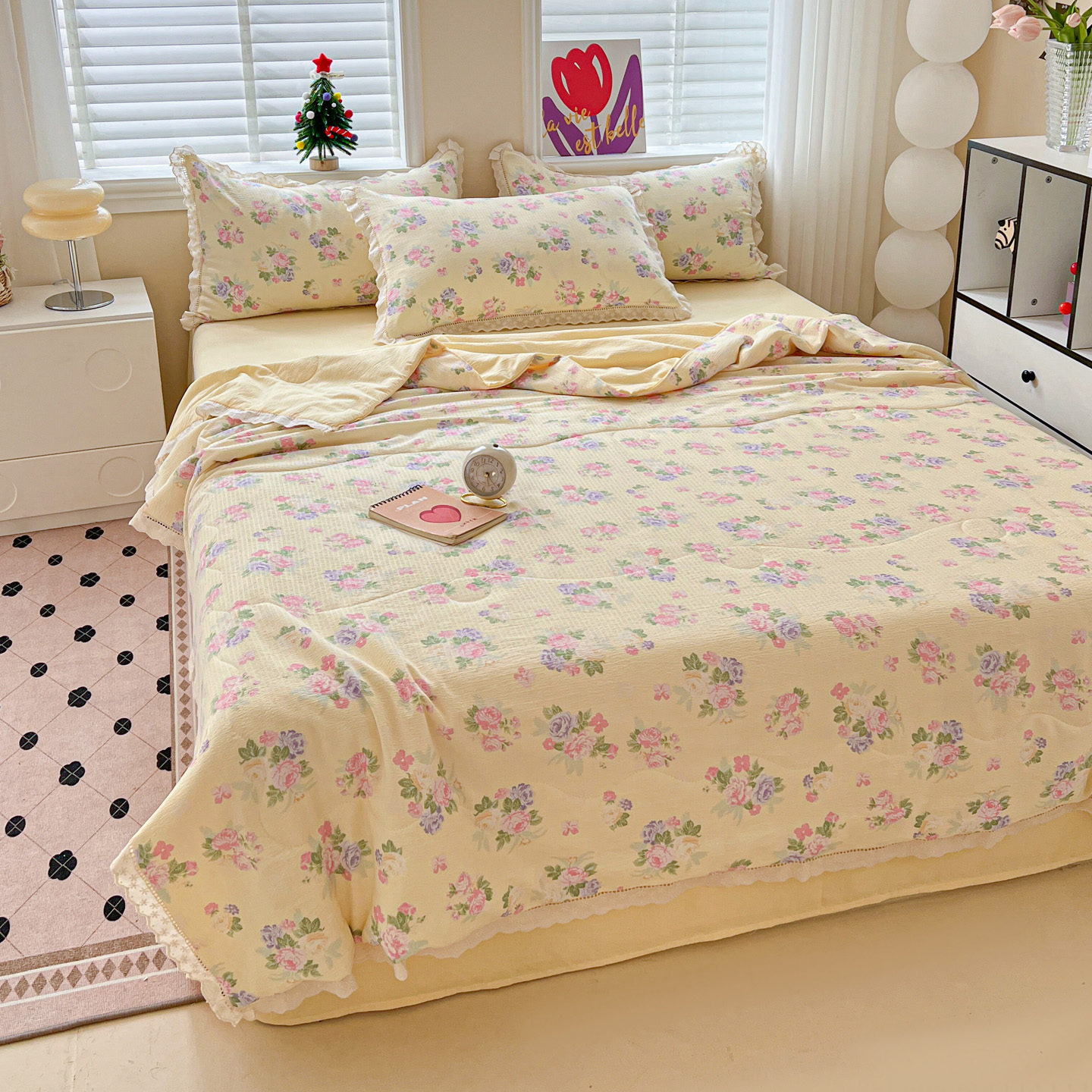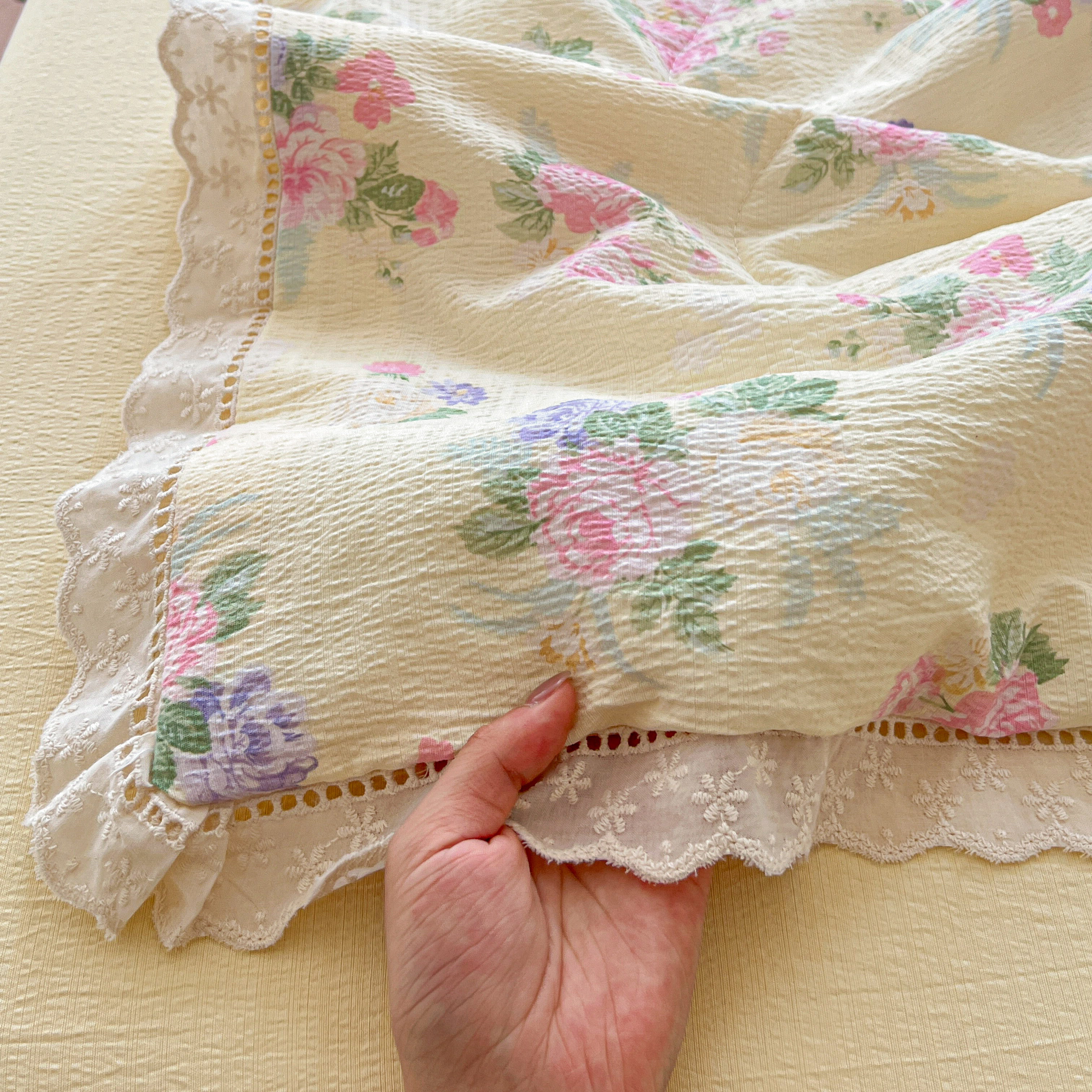 商品名称:2025新款云感皱皱纱全棉花边款夏被四件套 缤纷几何